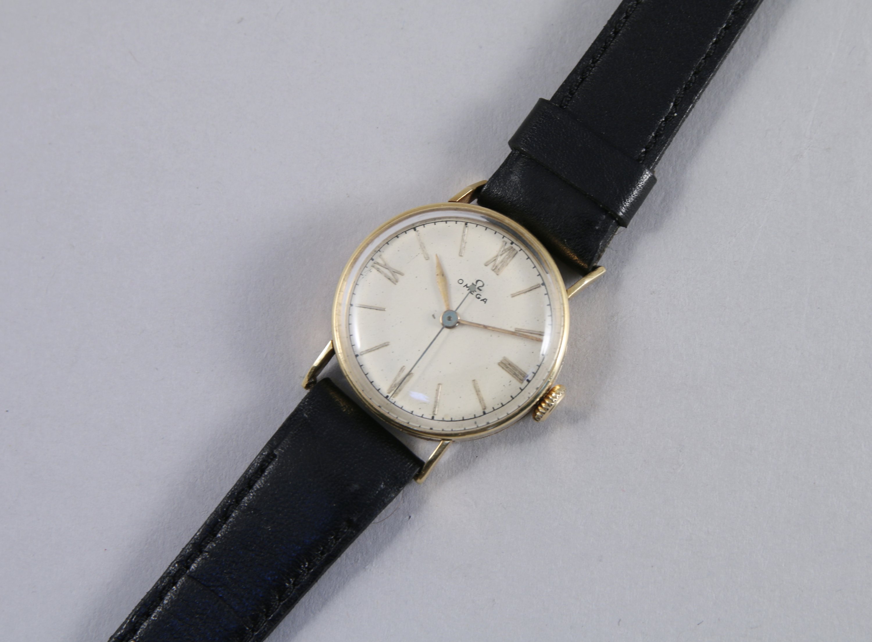 OMEGA. MONTRE BRACELET d'HOMME en or jaune. Le cadran circulaire signé est gradué pour les heures et les minutes avec les chiffres romains "III, VI, IX et XII". Remontoir à trois heures. Trotteuse des seconde. Bracelet cuir noir/