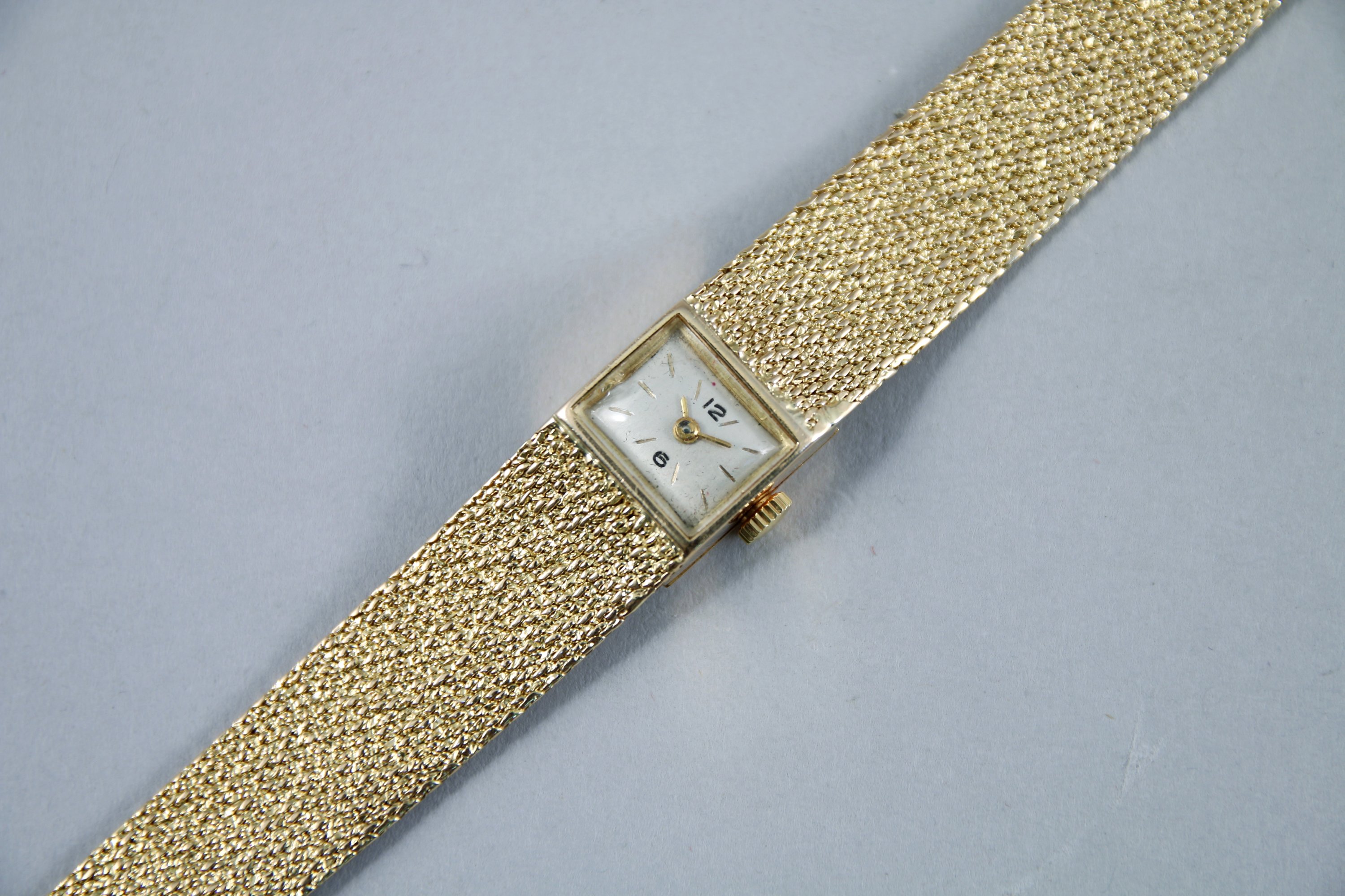MONTRE-BRACELET de dame en or jaune 750 millièmes. Bracelet maille grains de riz martelé. Cadran de forme rectangulaire indiquant les heures en chiffres arabes et index bâtonnets.