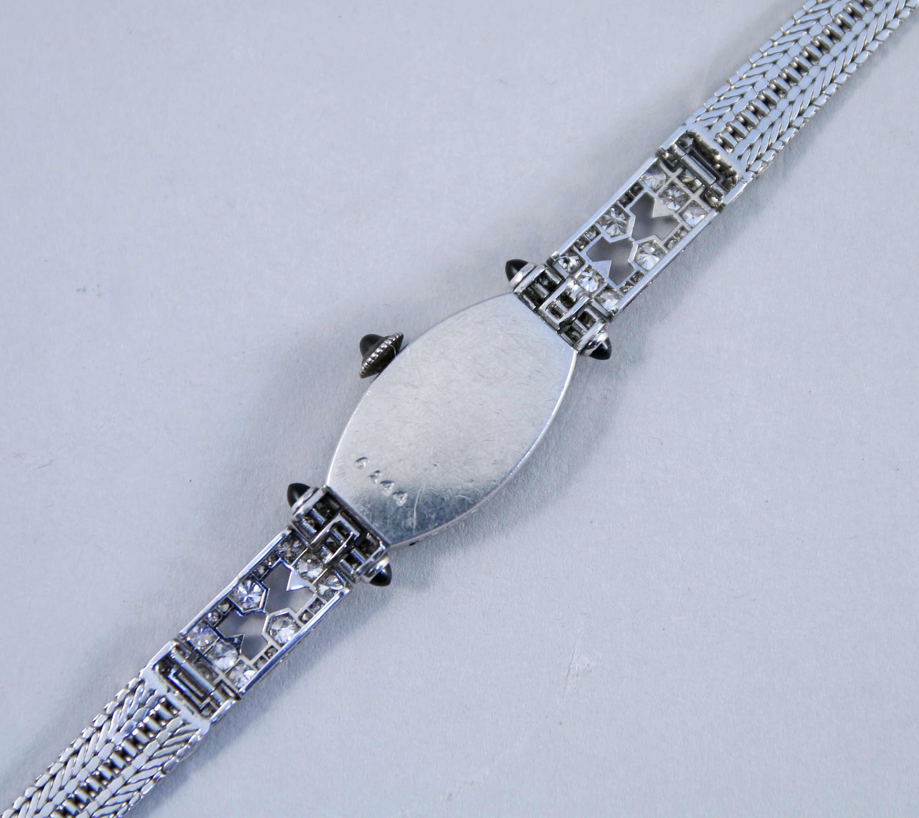 MONTRE-BRACELET de DAME en platine 950 millièmes ornée de DIAMANTS et de cabochons d'onyx (?), le cadran gradué des heures en chiffres romains, remontoir à trois heures.