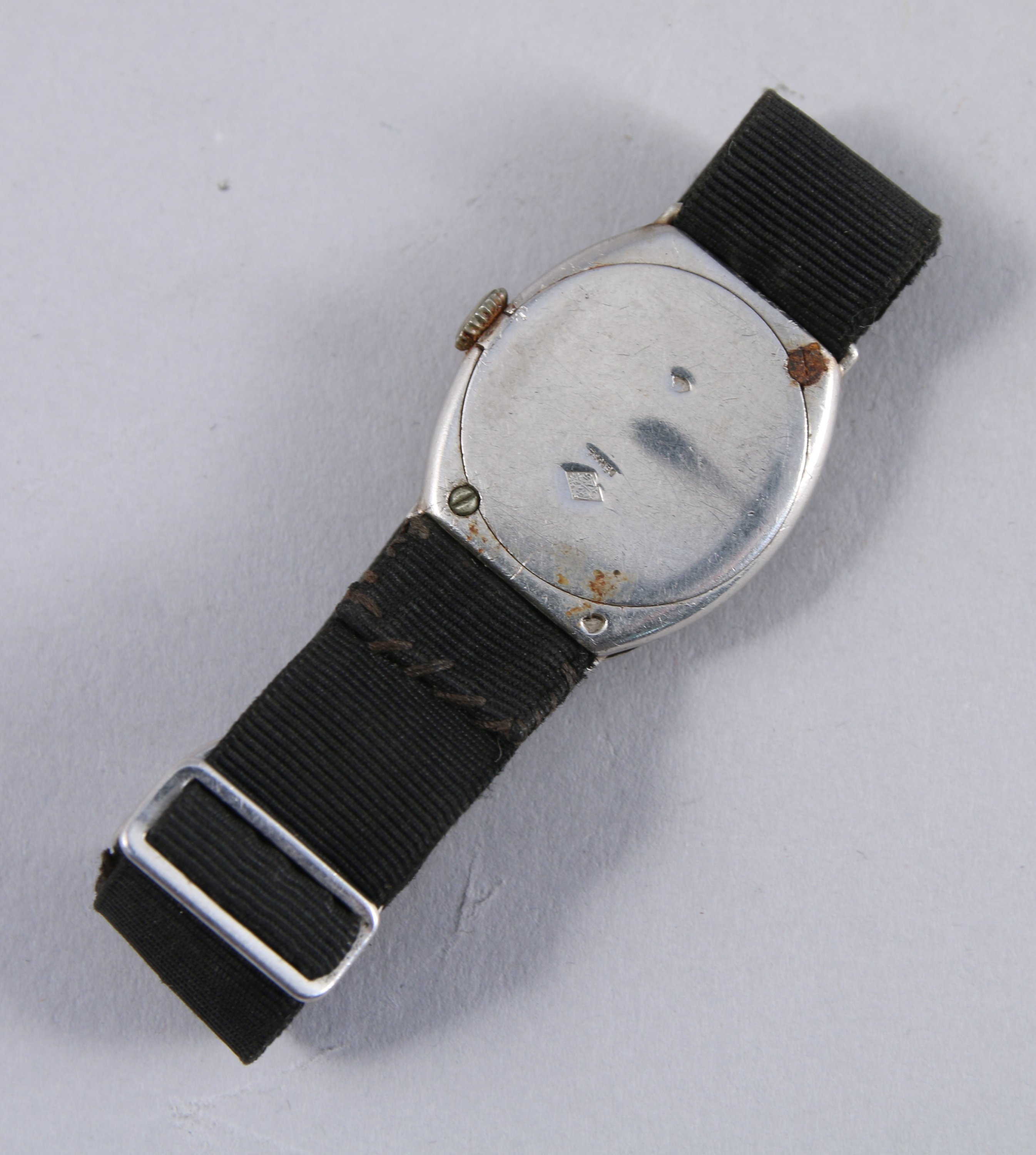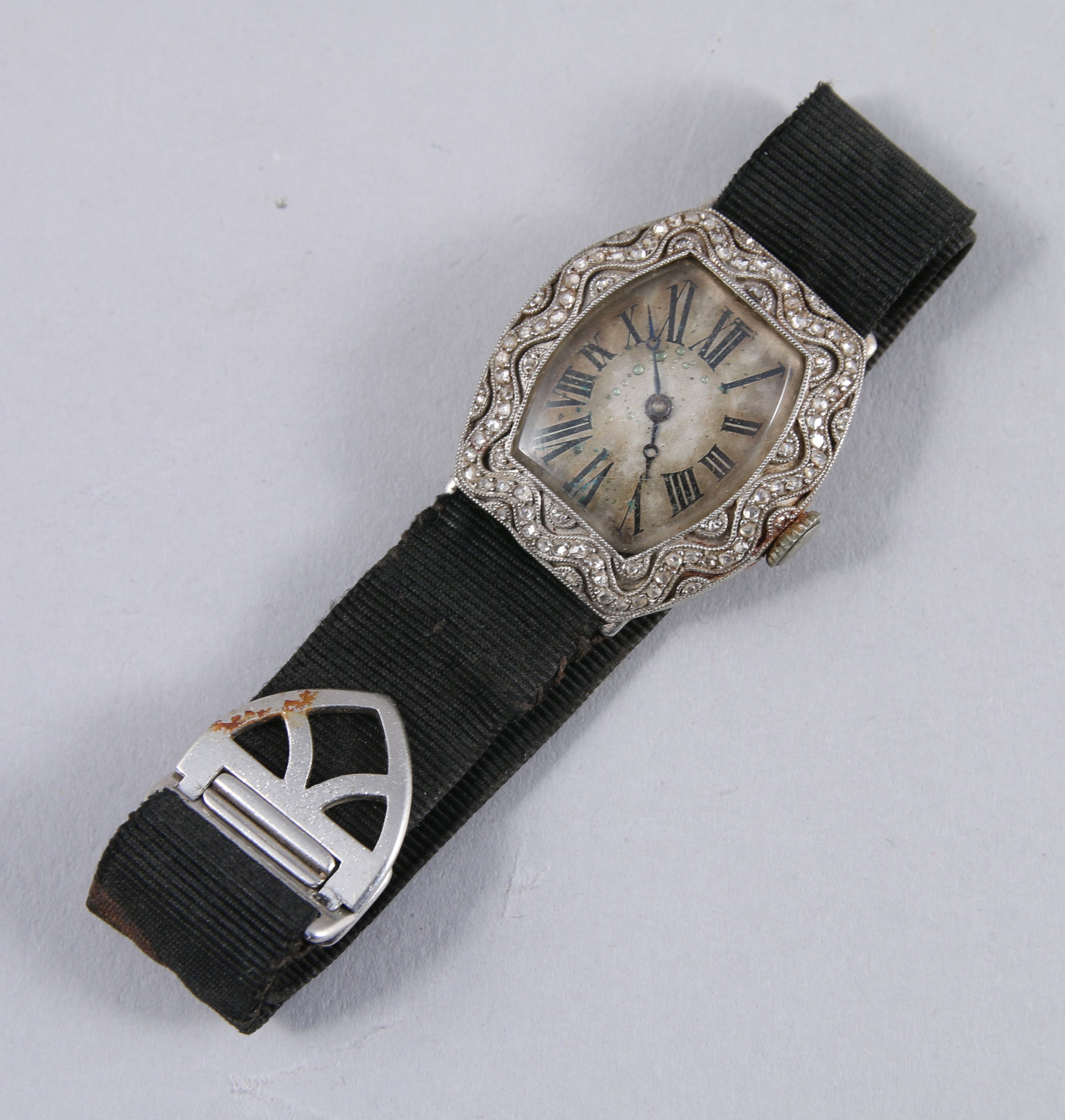 MONTRE DE DAME de forme oblongue en platine. Cadran à décor ondé orné de brillants. Fond argenté indiquant les heures en chiffres romains. Bracelet en tissu.