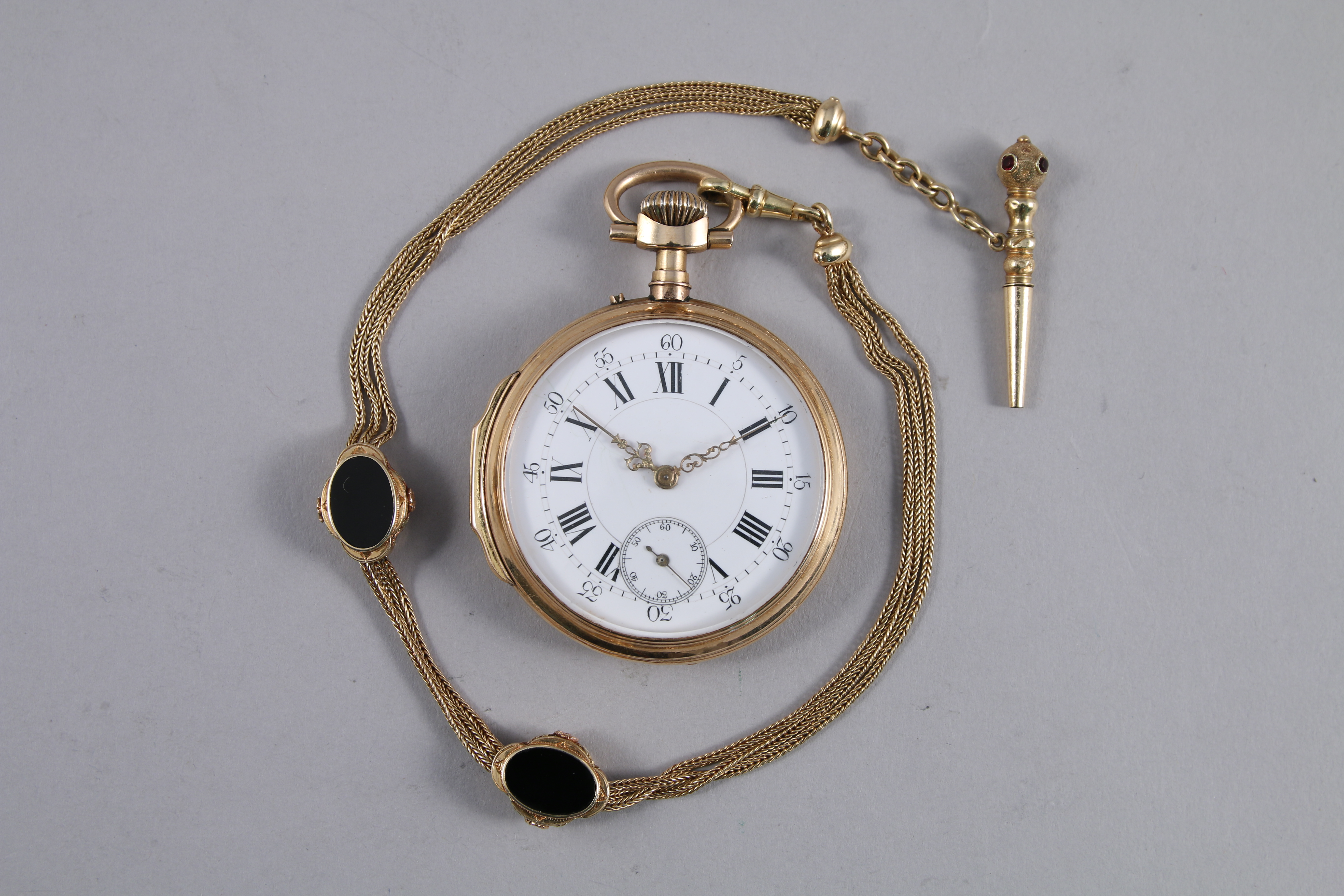 Avec une CHAÎNE GILETIÈRE en or jaune à trois lacets réunis par des cabochons orné d'une pierre noir (onyx?) et termineé par une clé de remontoir.