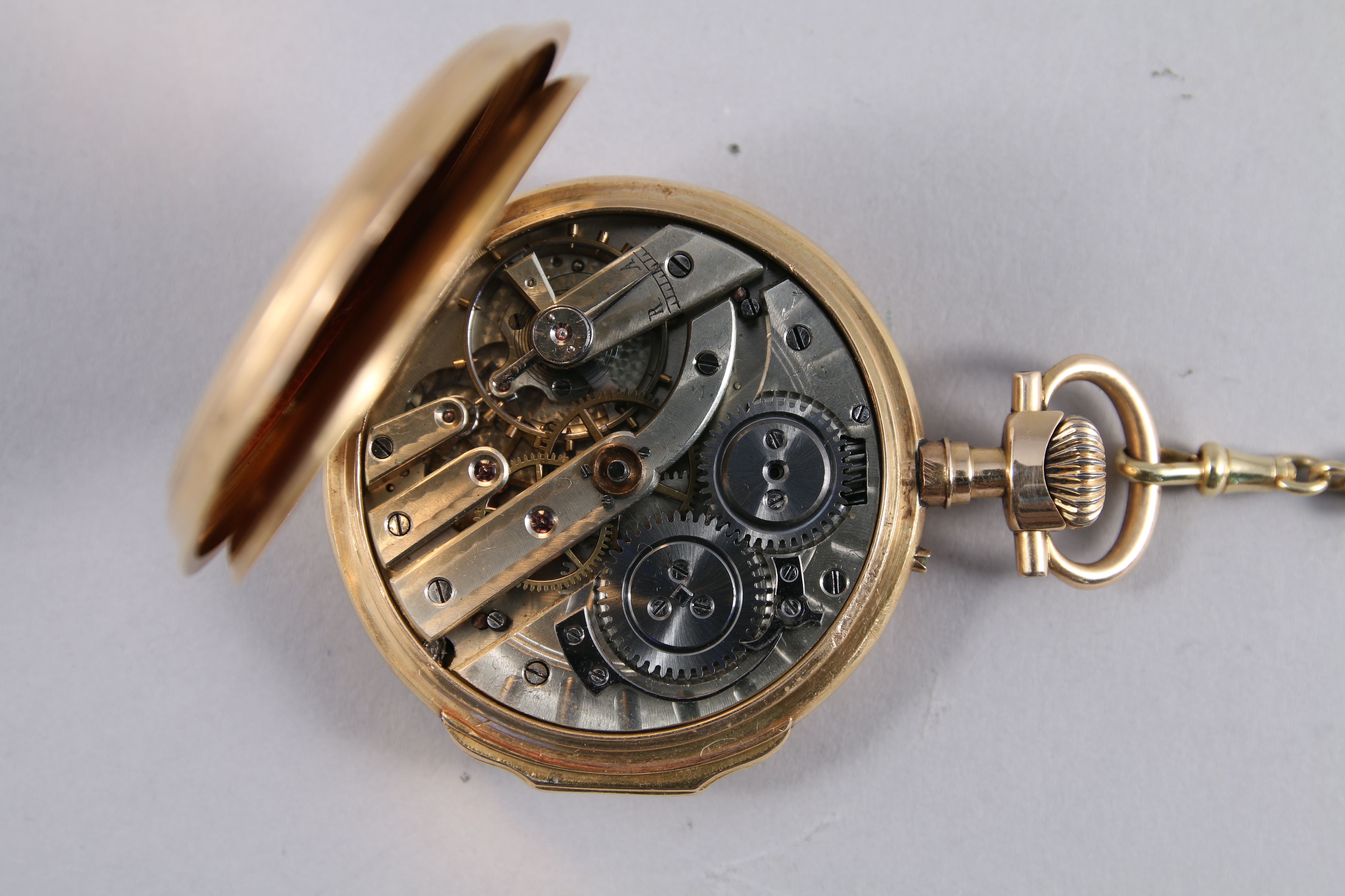 MONTRE de GOUSSET en or jaune, double cadran émaillé, gradué pour les minutes, les heures en chiffres romains, trotteuse des secondes à six heures.Lle boitier en or uni. Le cache poussière en or marqué "Genève". Échappement à ancre et remontoir à midi.