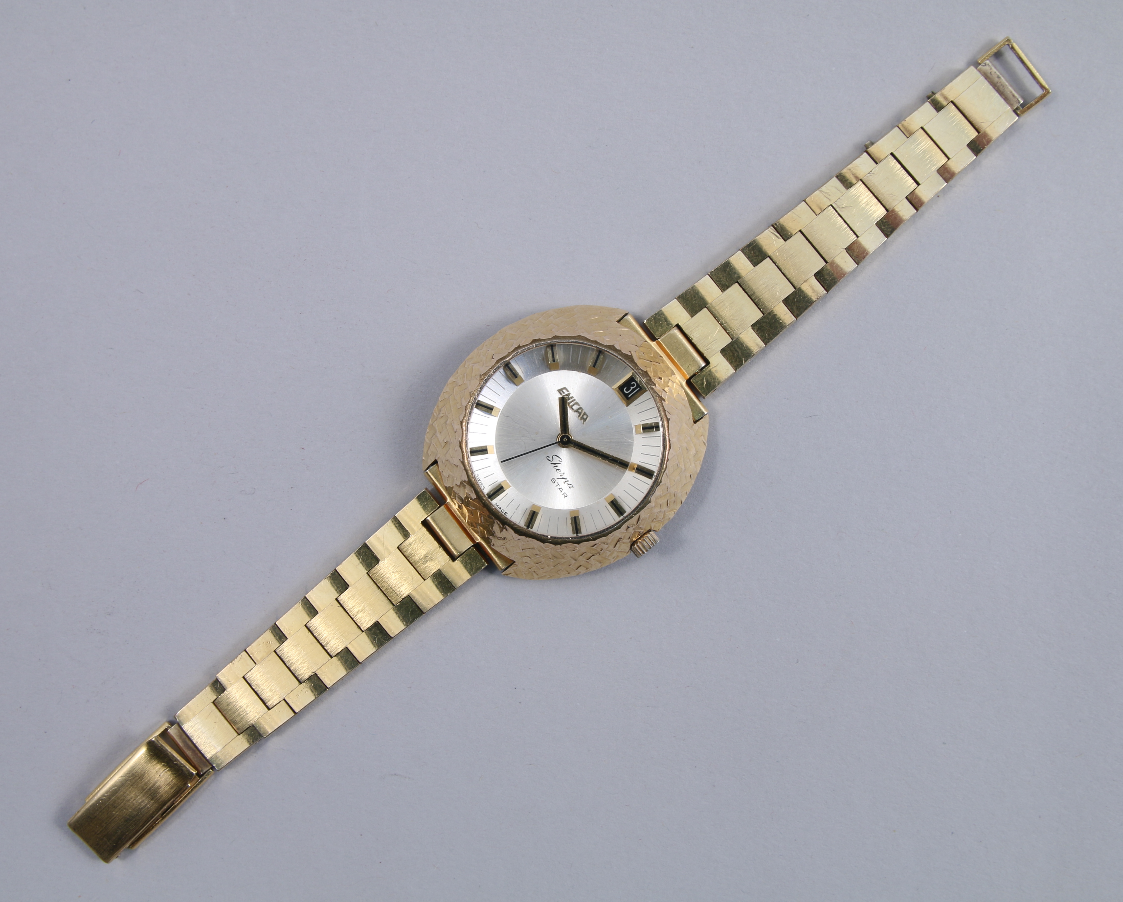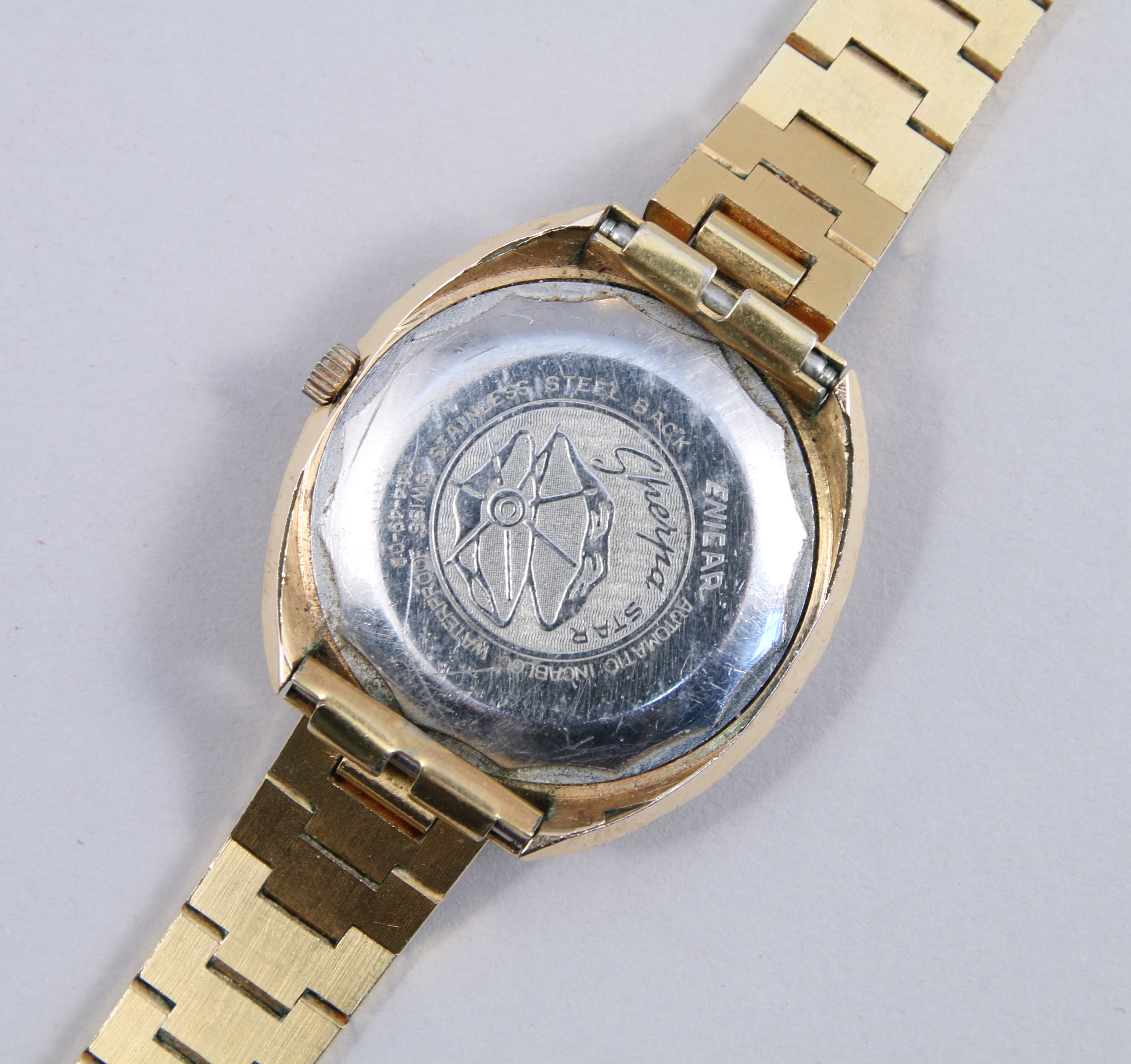 ENICAR. MONTRE-BRACELET de dame, modèle Sherpa Star, en métal doré. Haut cadran à décor martelé, fond argent, à guichet dateur. Index bâtonnets. Signé. Mouvement automatique.