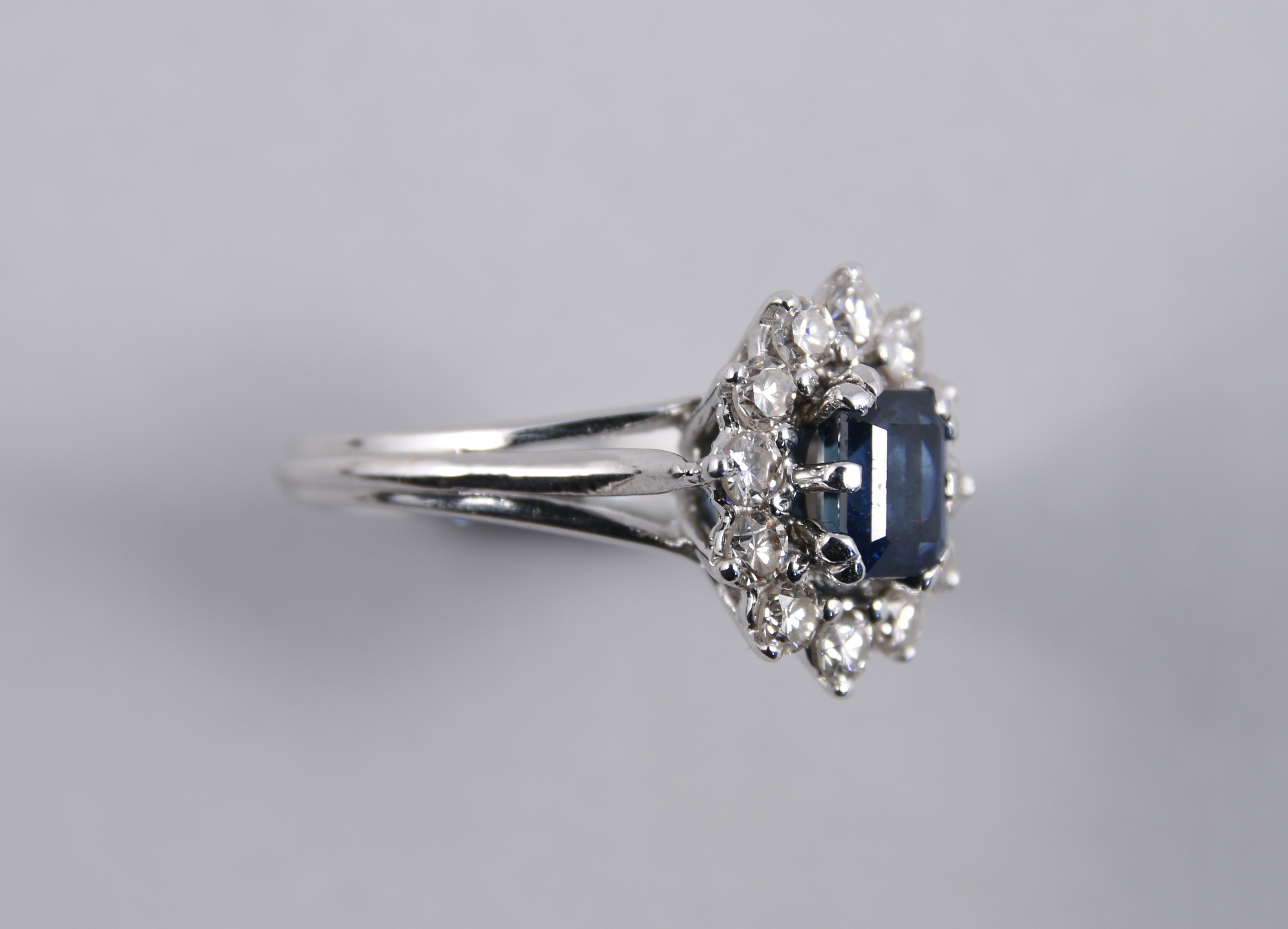 BAGUE dite POMPADOUR en or gris 750 millièmes. Elle est ornée d'un SAPHIR taille émeraude dans un entourage de 12 DIAMANTS.