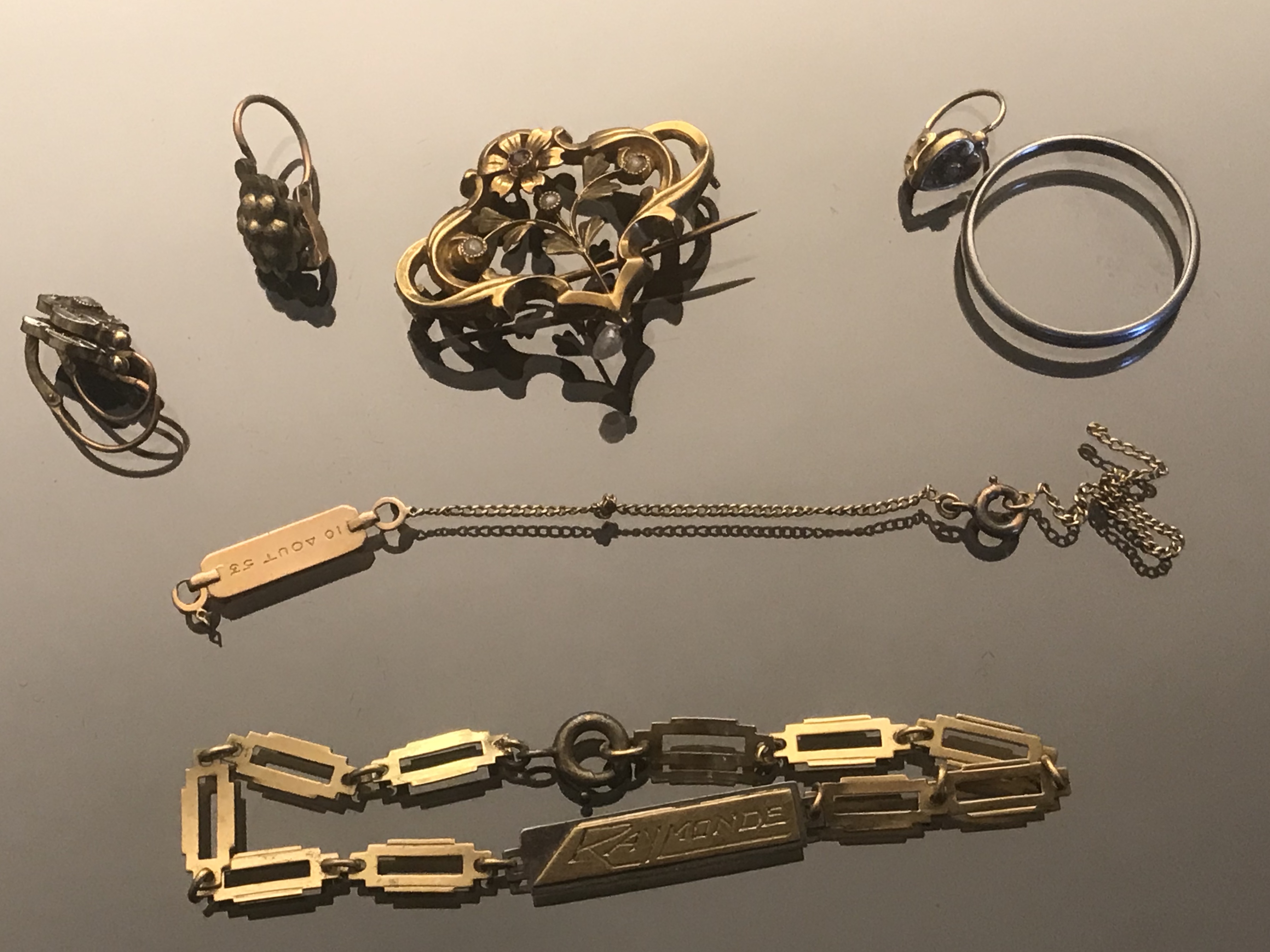 JOINT: 4 BOUCLES d'OREILLES DORMEUSEen or jaune dont une paire (2g),une ALLIANCE en or blanc (2,2g), une GOURMETTE en or jaune et blanc marquée Raymonde (3,6 g), une GOURMETTE accidenté en or jaune (1,1 g.