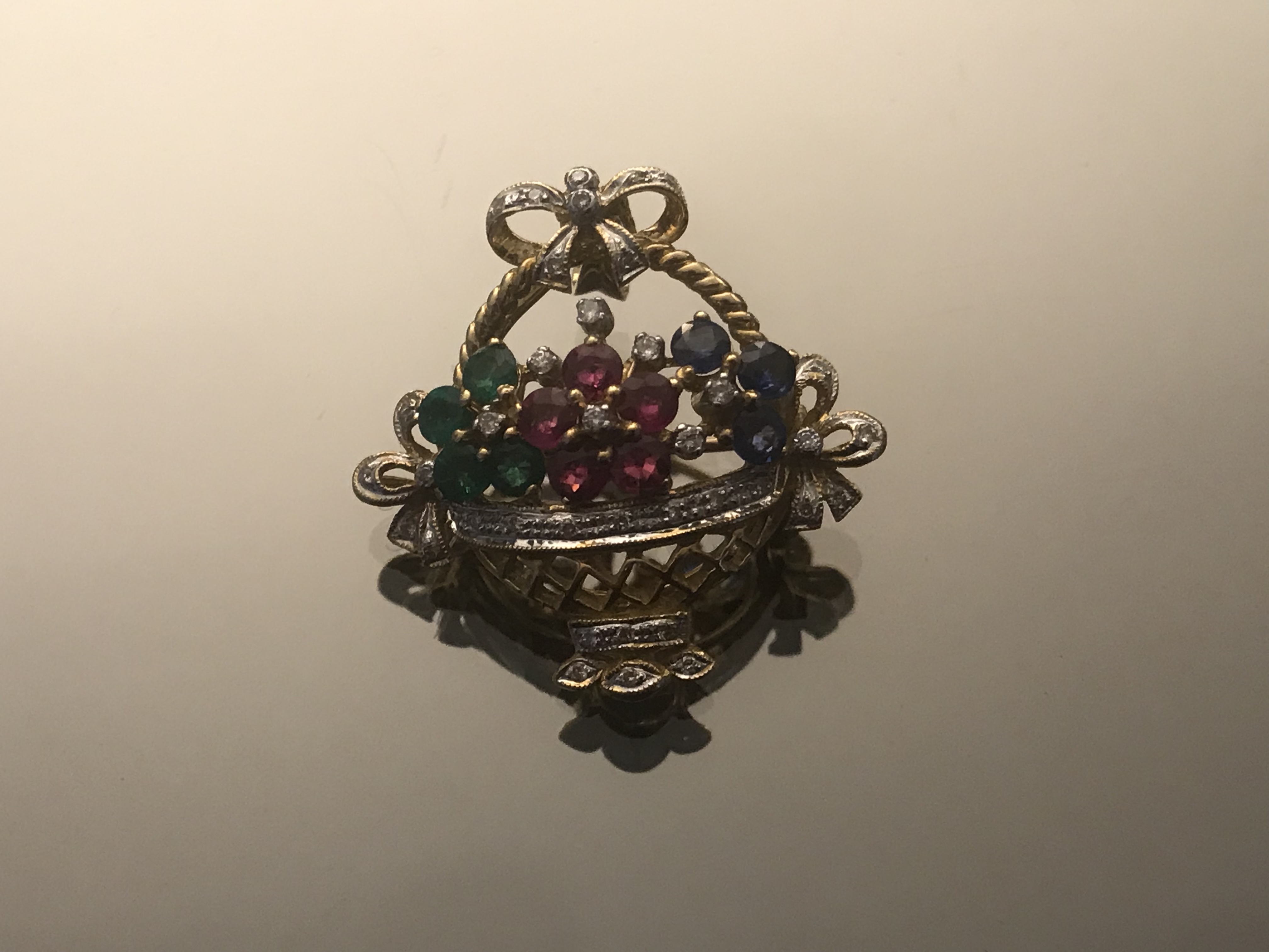 BROCHE PANNIER en or jaune orné de fleurs à pétales d'ÉMERAUDE (0,45 ct), RUBIS (0,80) ET SAPHIRS (0,45 ct) le tout pavé de brillant. Béliaire en or jaune pour le porter en pendentif.