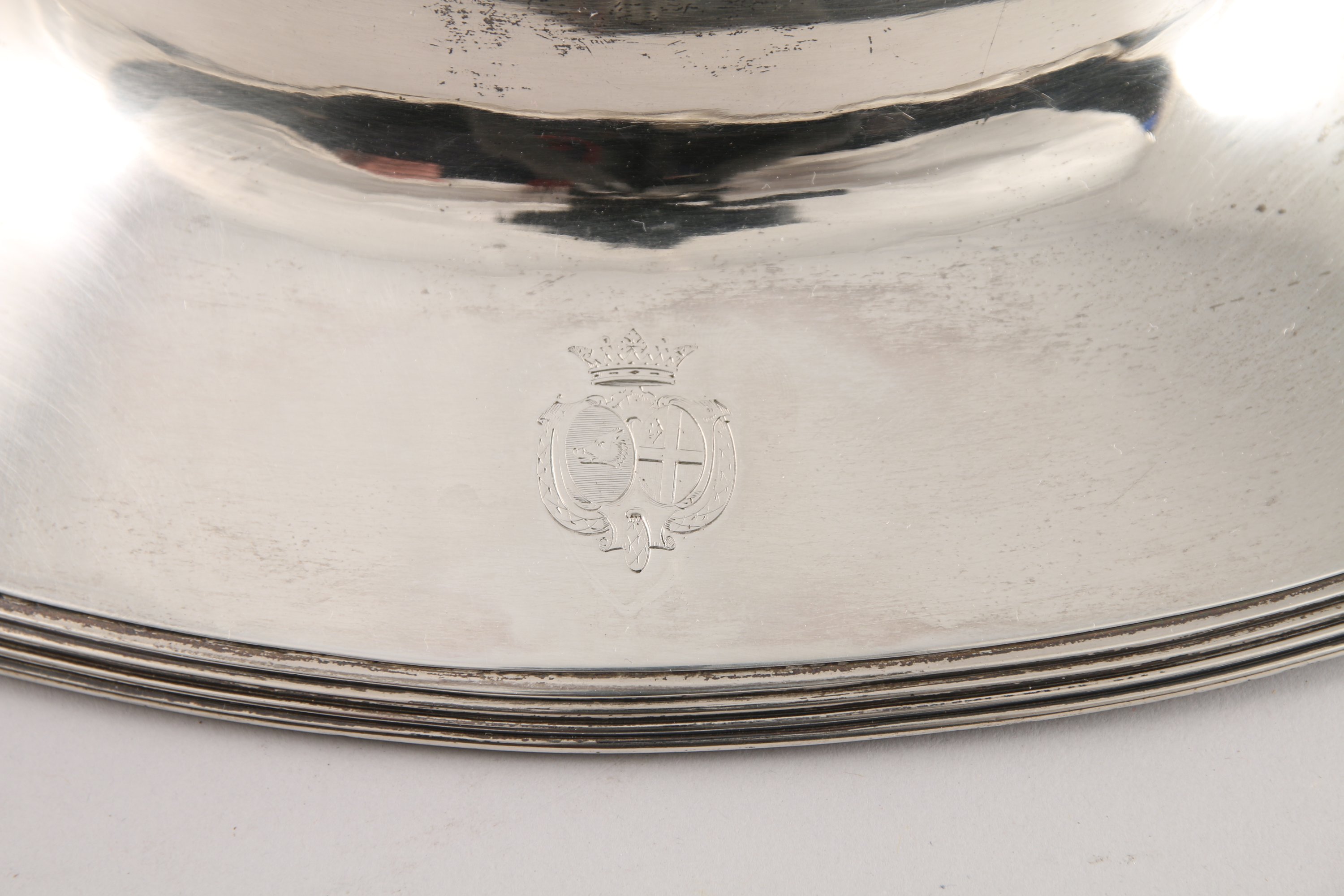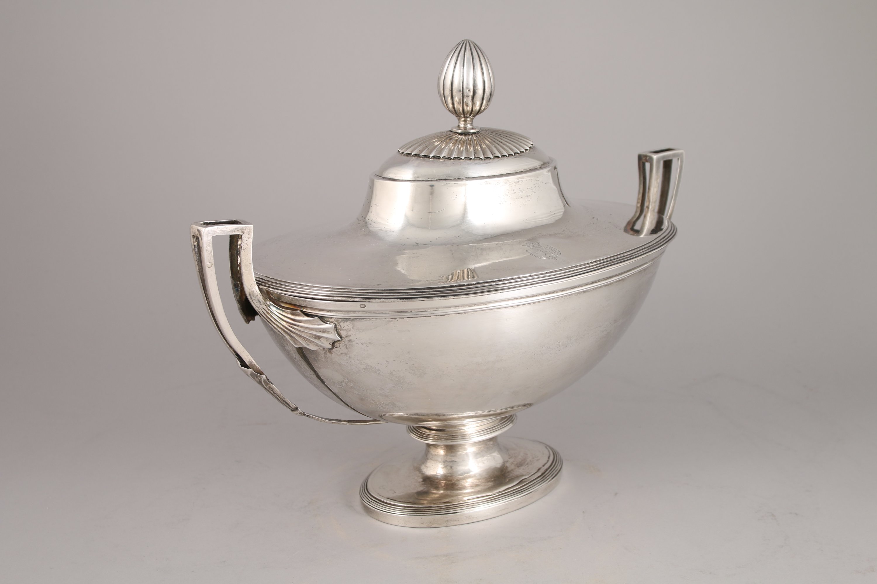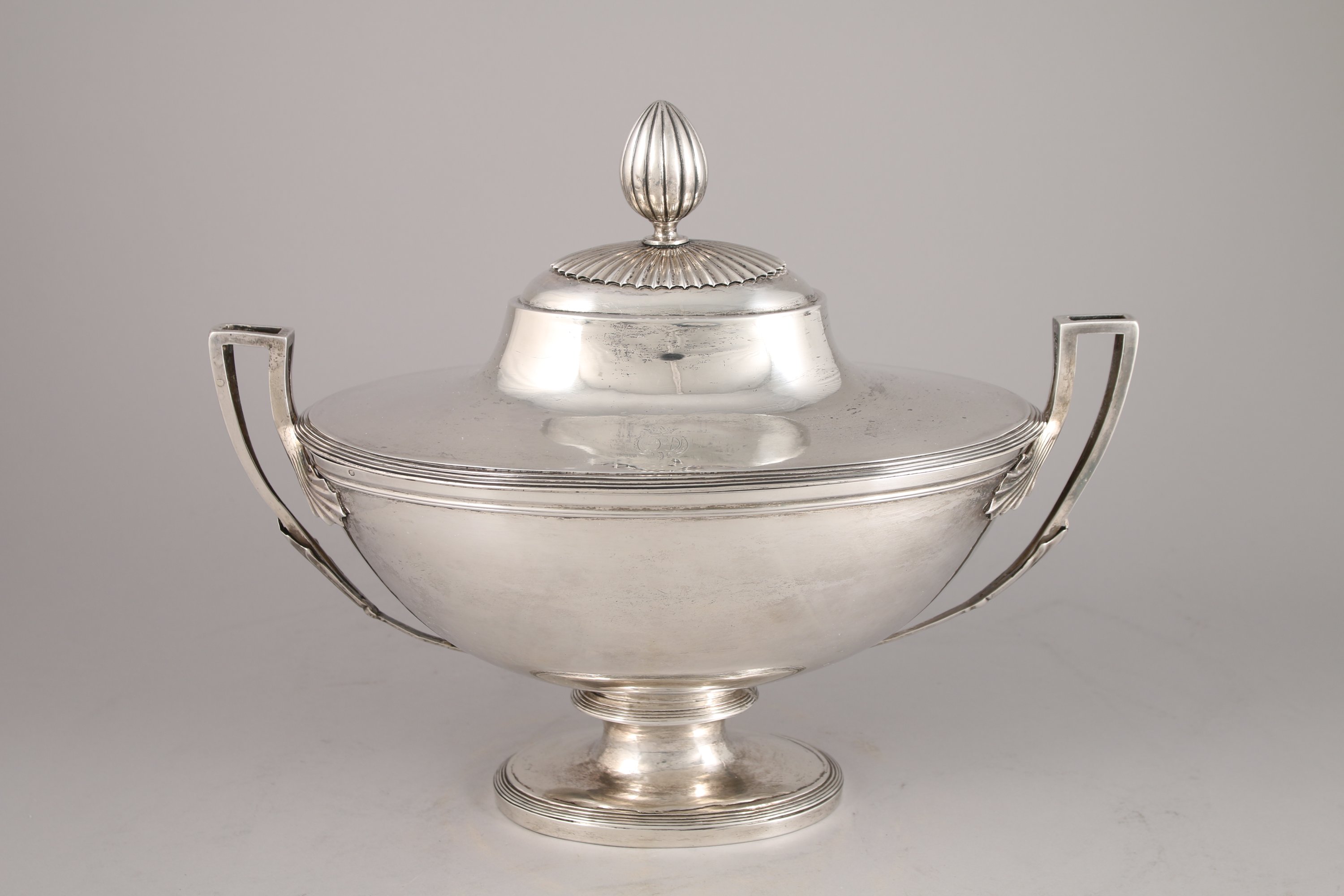 SOUPIÈRE en argent uni munie deux anses géométriques à attaches en feuillages stylisés. Couvercle bordé de filets sommé d'un fretel en graine sur une terrasse rayonnante. Le couvercle et le corps gravés d'armes d'alliance timbrées d'une couronne de marquis. Elle repose sur un piédouche orné de filets.