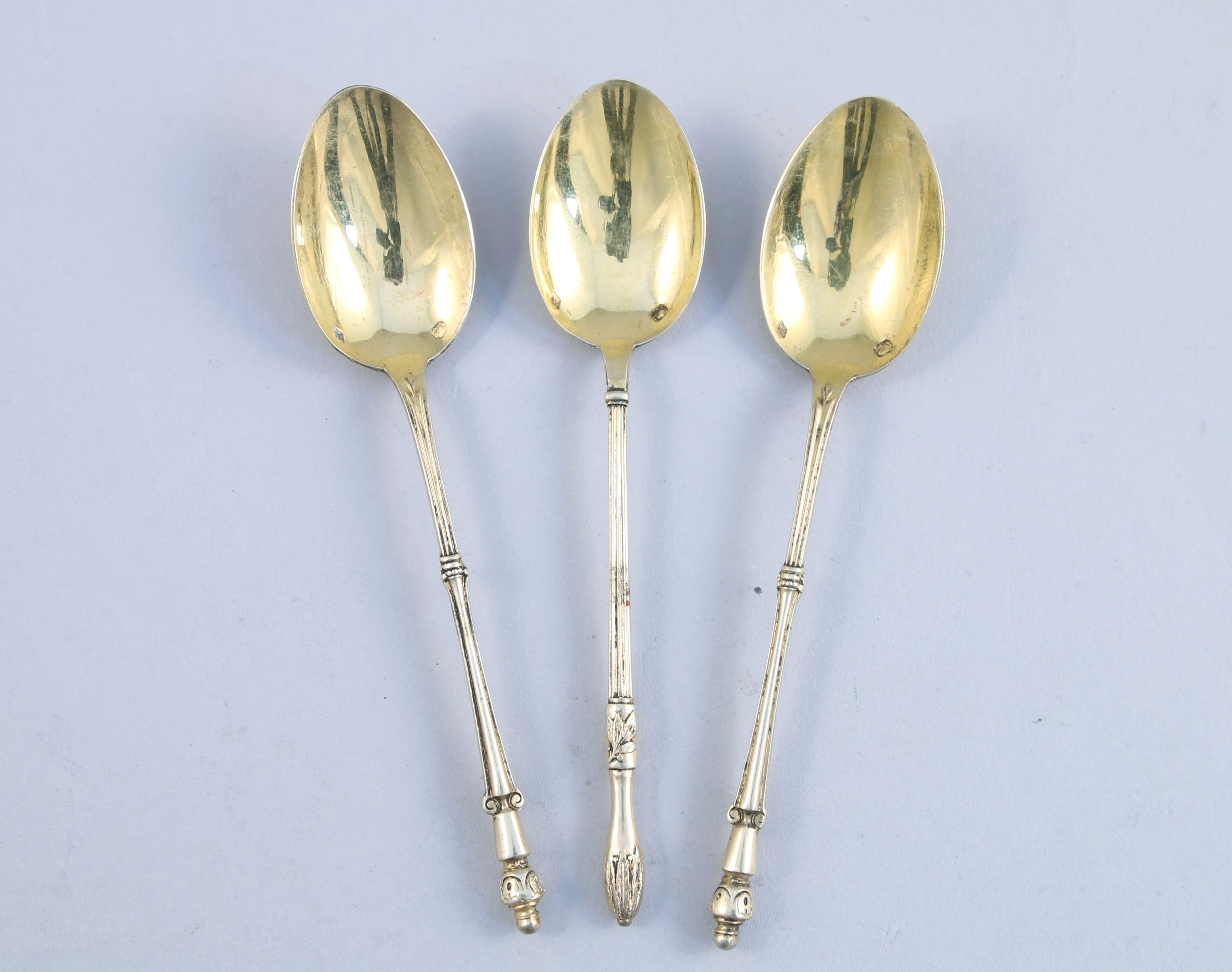 JOINT: TROIS CUILLÈRES À MOKA en vermeil, dont une paire, manche à la russe. Poinçon Minerve, XIXe. Poids: 35 g.