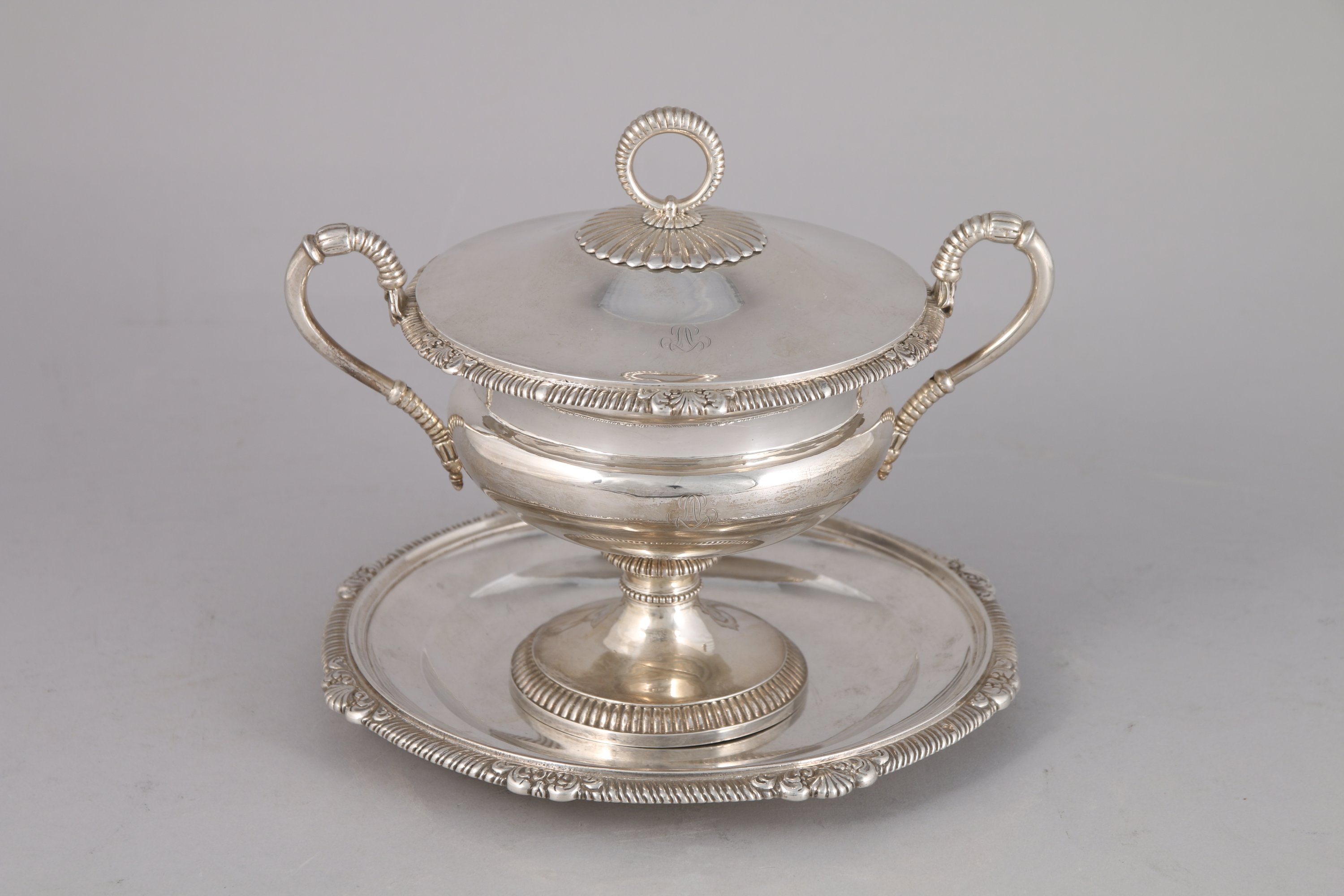 COUPE couverte dite de mariage et son PLATEAU en argent. Le fretel en anneau repose sur une terrasse à godrons rayonnants. Anses annelées. La bordure de la coupe, ainsi que l'aile du plateau, reçoit une frise de godrons agrémentée de coquilles et acanthes. Elle repose sur un piédouche à frises de godrons et rais de perles.