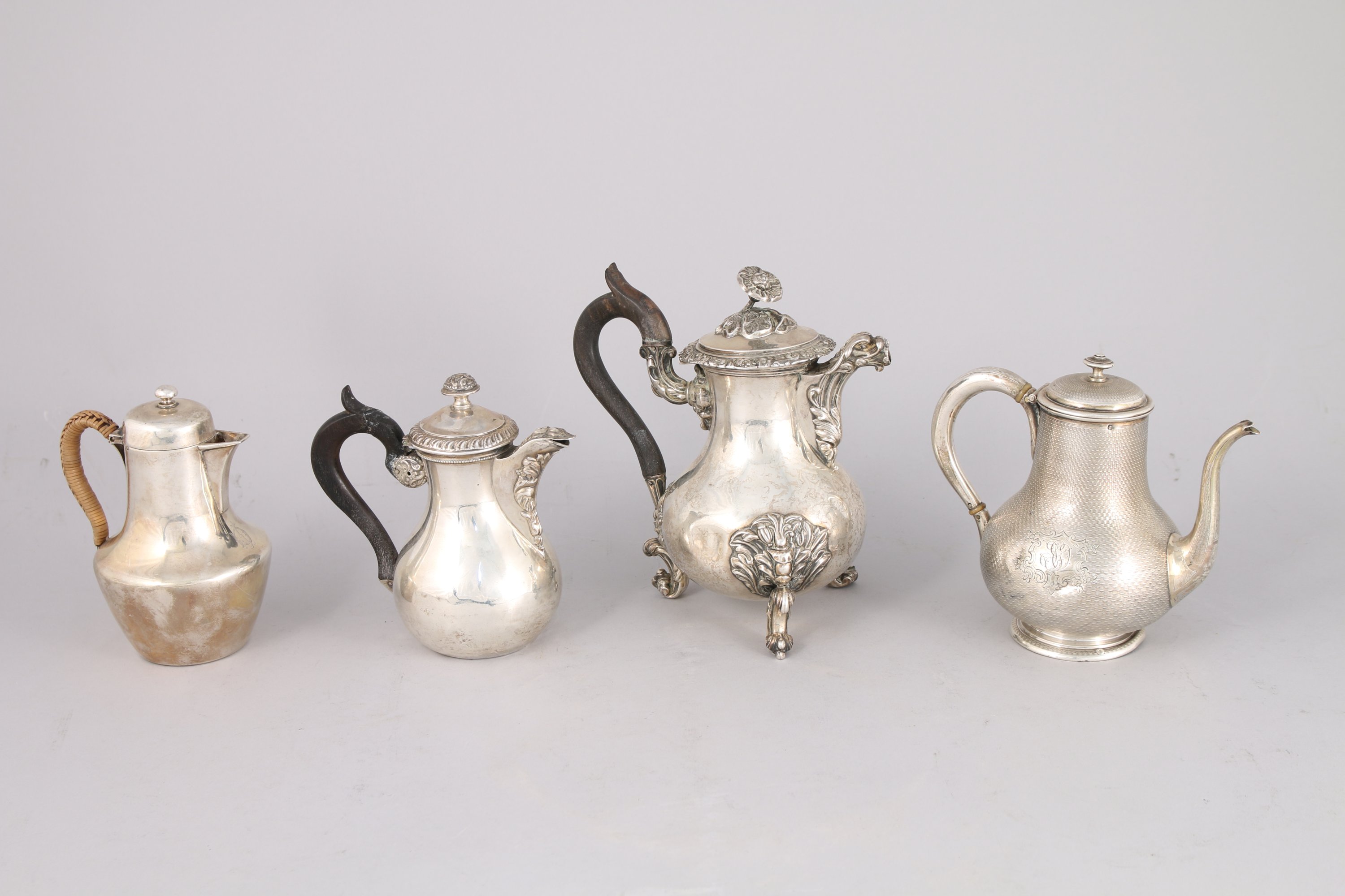 - THÉIÈRE à panse basse et col étranglé à riche décor de feuillages stylisés. Bec verseur à tête de dauphin. Anse en bois noirci. Elle repose sur trois pieds à larges attaches feuillagées. Poinçon Minerve, époque Louis-Philippe.