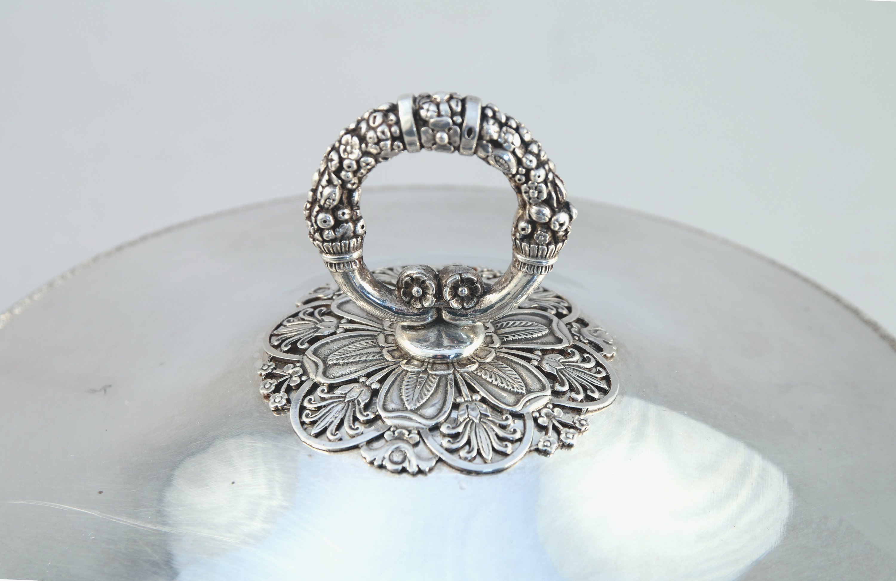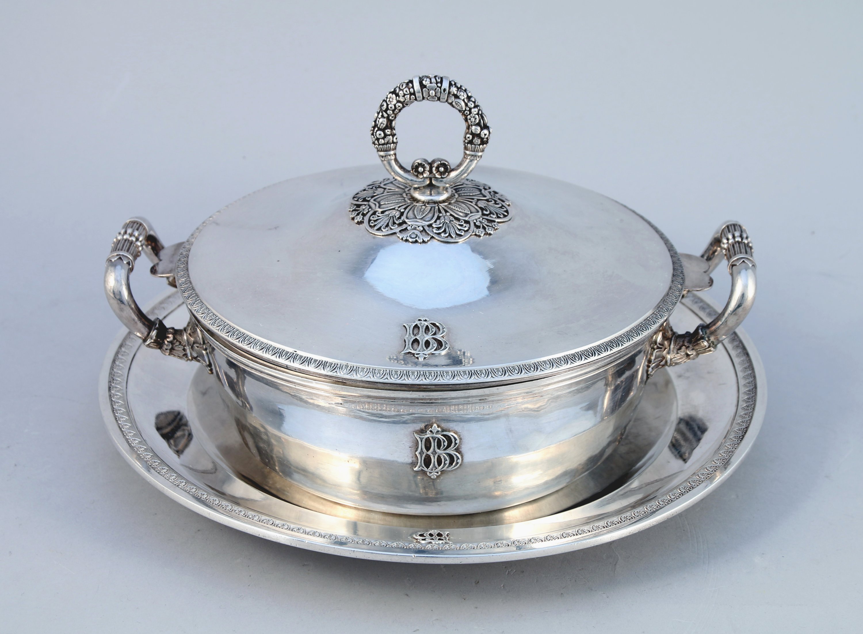 LÉGUMIER COUVERT et son PLATEAU de PRÉSENTATION en argent. à décor de frises de palmettes. Le fretel adopte la forme d'une anse constituée de deux cornes d'abondance adossées. Il repose sur une terrasse rayonnante à décor floral stylisé tel que palmettes, feuilles lancéolées et fleurettes. Anses latérales à attache fleuronnée. Couvercle, corps et plateau appliqués du monogramme "BB". Avec sa DOUBLURE en argent.