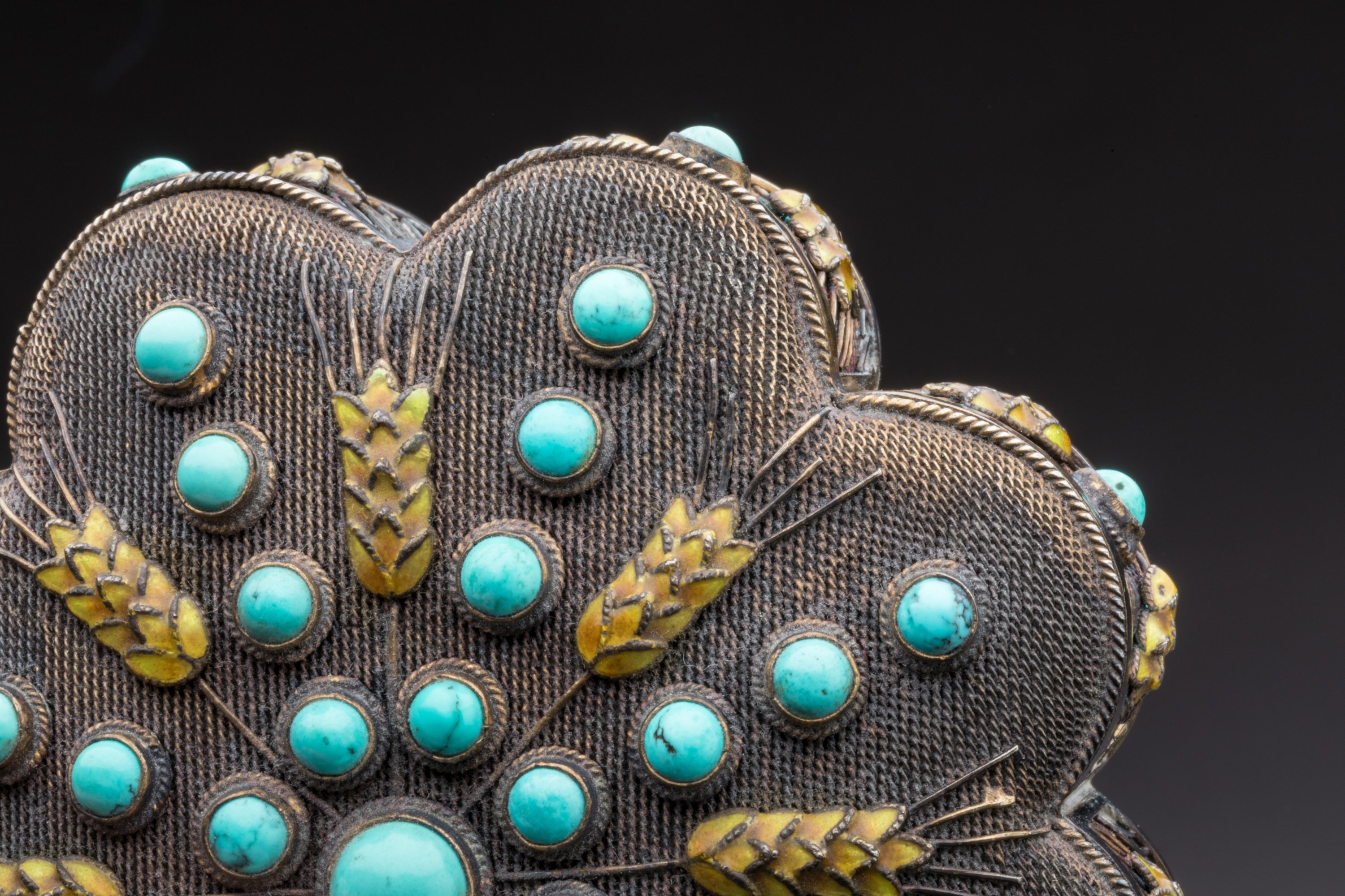 de forme cylindrique en argent et vermeil. Elle est ornée d'épis de blé émaillés jaune qui naissent de cabochons de turquoise en serti clos.