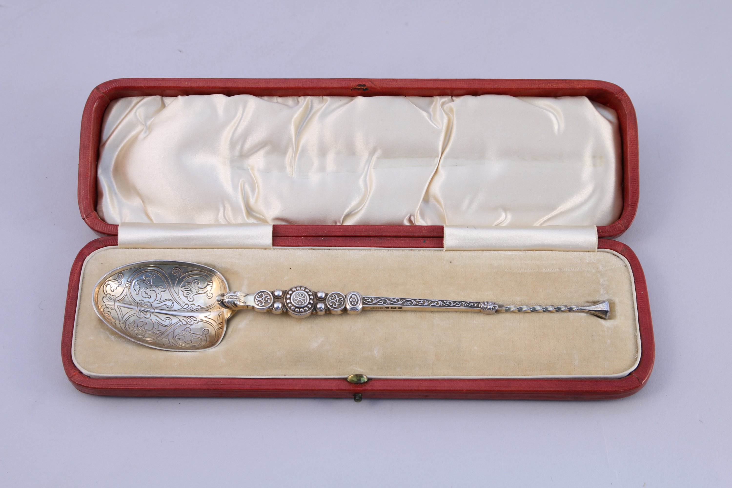 CUILLÈRE DU COURONNEMENT des Rois d'Angleterre en vermeil à riche décor de rinceaux, têtes de félins et motifs géométrisants. Cuilleron cordiforme. Écrin de maroquin rouge.