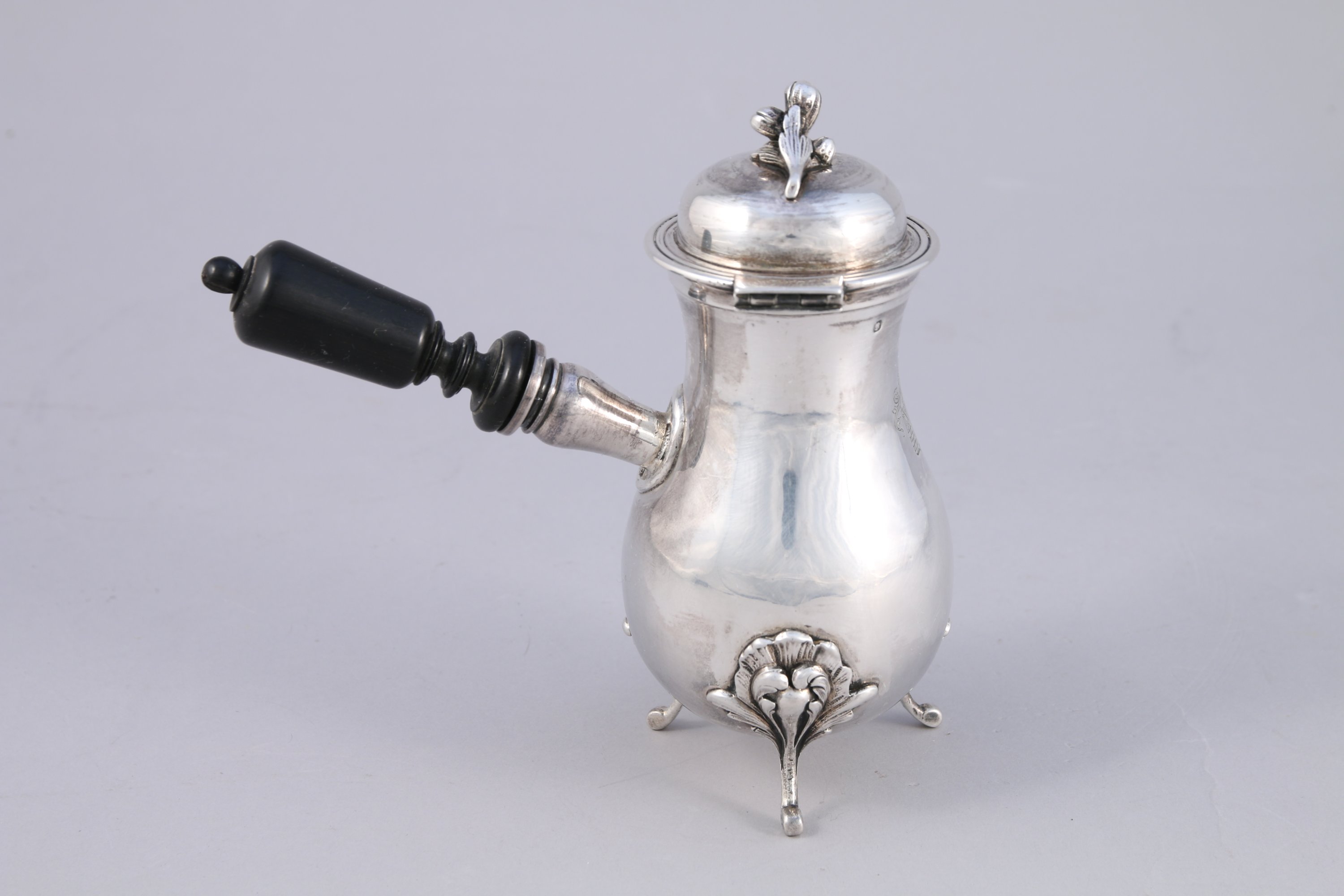 VERSEUSE égoïste piriforme en argent. Le fretel appliqué adopte la forme de boutons floraux feuillagés. Le bec est orné d'un masque d'Apollon dans un encadrement rocaille. Manche latéral en bois noirci. Elle repose sur quatre pieds à large attaches feuillagées. La panse gravées d'armoiries timbrées d'un heaume à lambrequins.