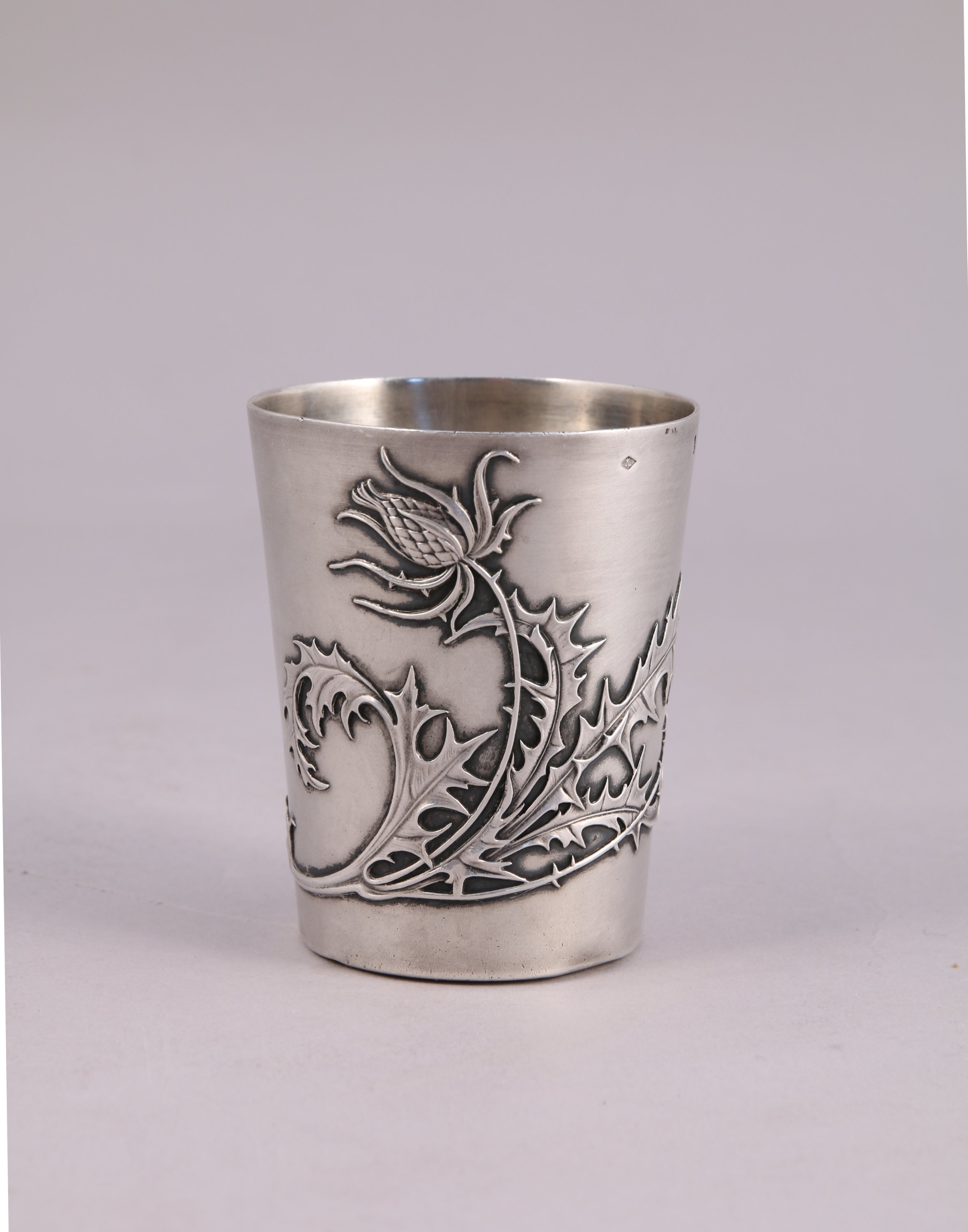 TIMBALE gobelet en argent à décor appliqué de chardons. Gravée...