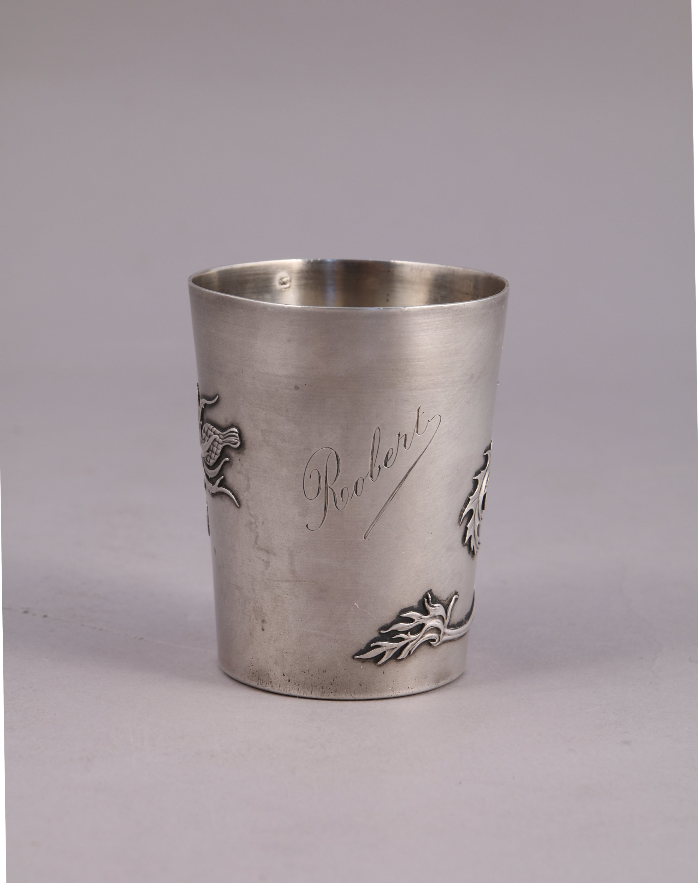 TIMBALE gobelet en argent à décor appliqué de chardons. Gravée "Robert".