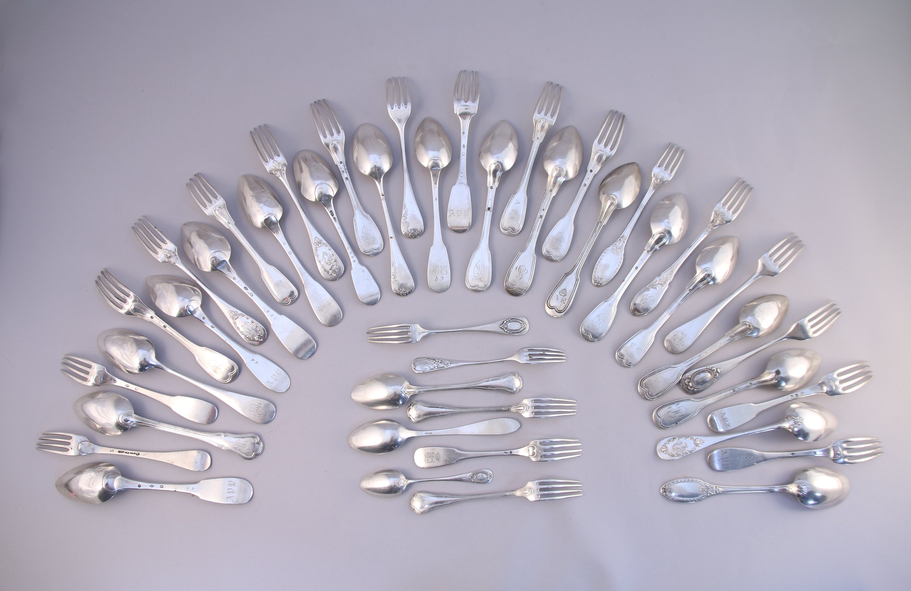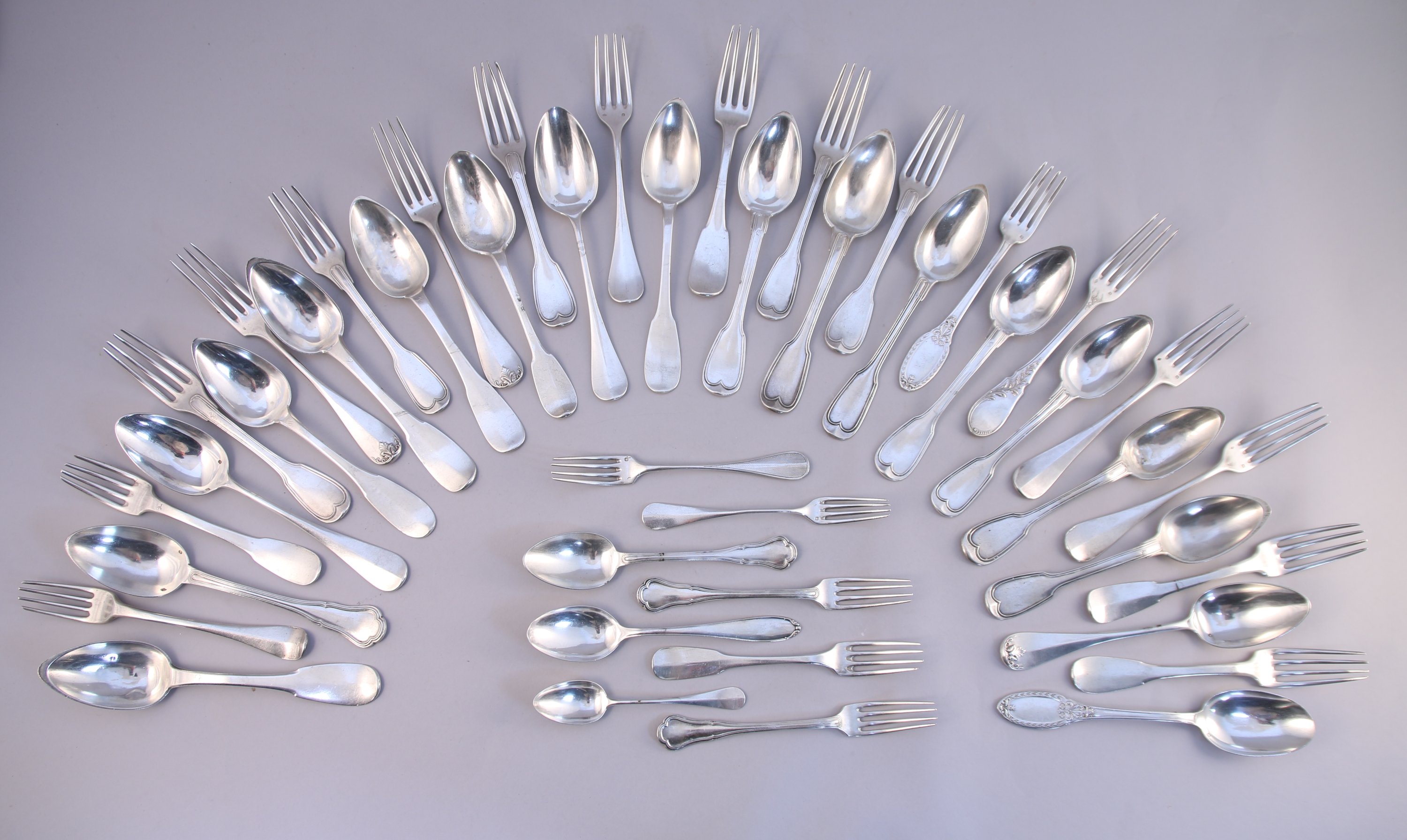 Suite d'environ 22 FOURCHETTES et 20 CUILLÈRES en argent dont une petite. Modèles variés: uniplat, flite contour, violonné, agrafe (...), parfois monogramées ou avec des armoiries.