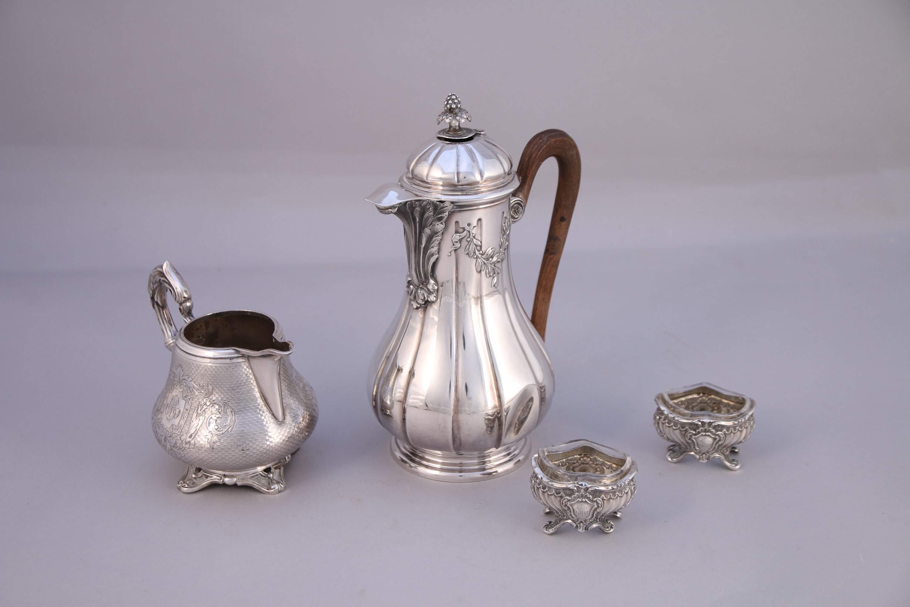 JOINT: une CHOCOLATIERE en argent à cotes pincées, le bec verseur orné d'une agrafe, le manche en bois noirçi. Poinçon Minerve. Haut. 23 cm. Poids brut 503 g. (choc) ; un POT à LAIT en argent à mitfs de vannerie, le manche feuillagé. Poinçon Minerve. Haut.10 cm. Poids 174 g (chocs) et DEUX SALERONS en argent à cotes torsadées reposant sur quatre peites pieds. Poinçon Minerve. Larg. 6 cm Poids 46 g. récipient en verre.
