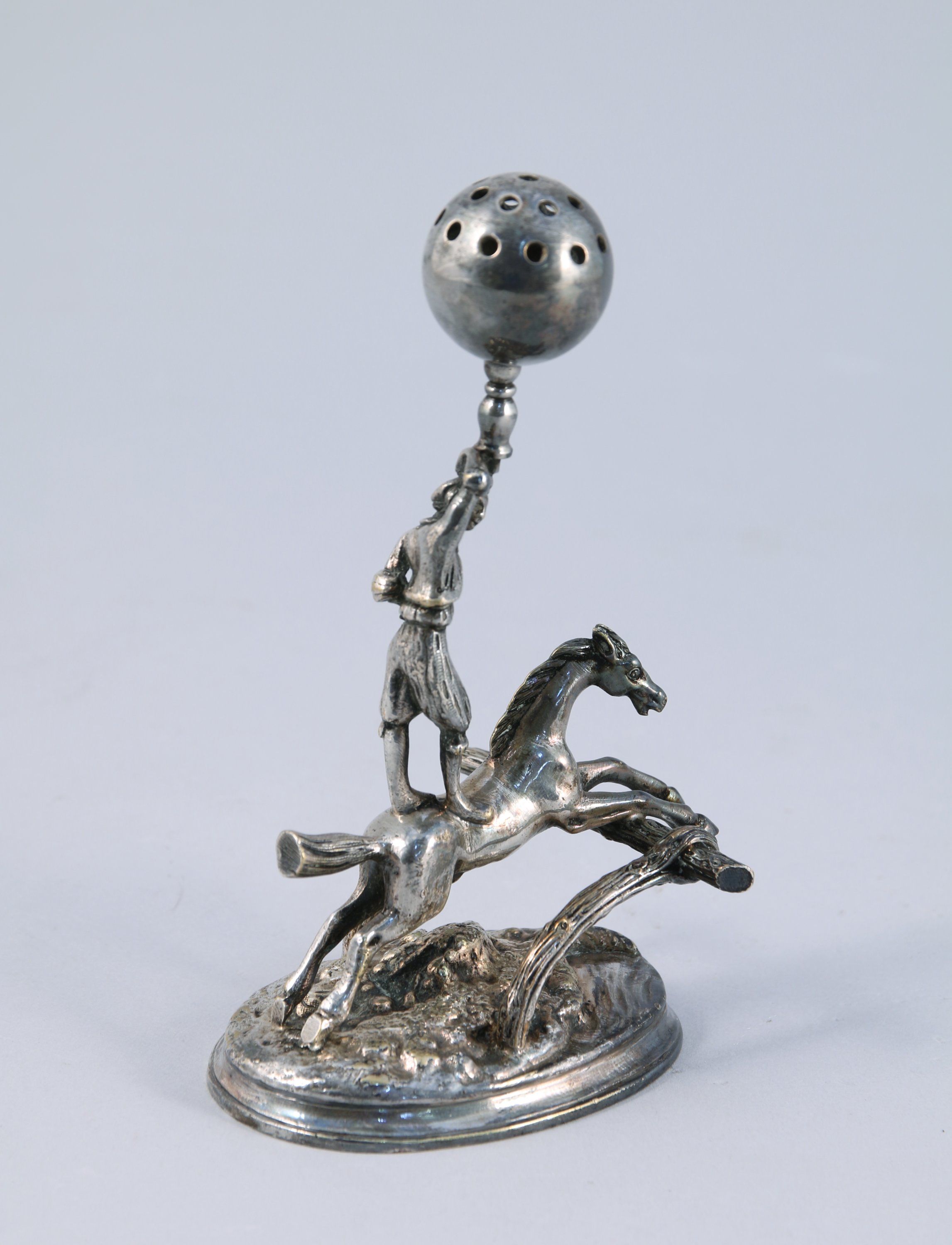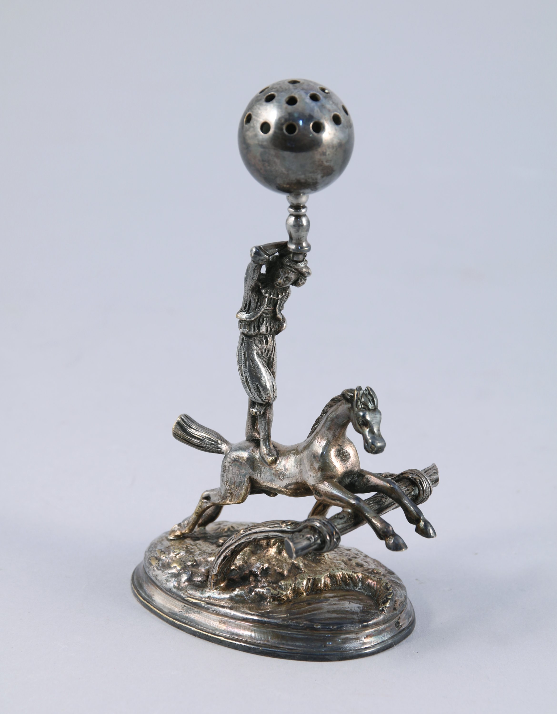 PORTE CURE-DENTS en bronze argenté figurant un acrobate se tenant debout sur un cheval sautant une barrière. Il tient sur sa tête un fût balustre supportant une sphère.