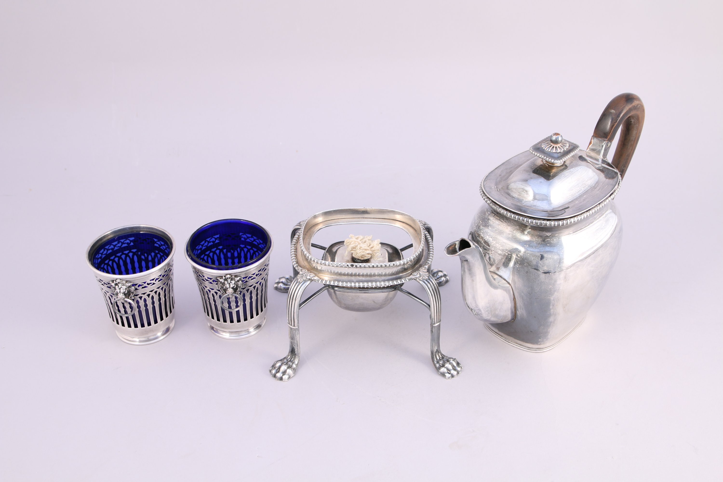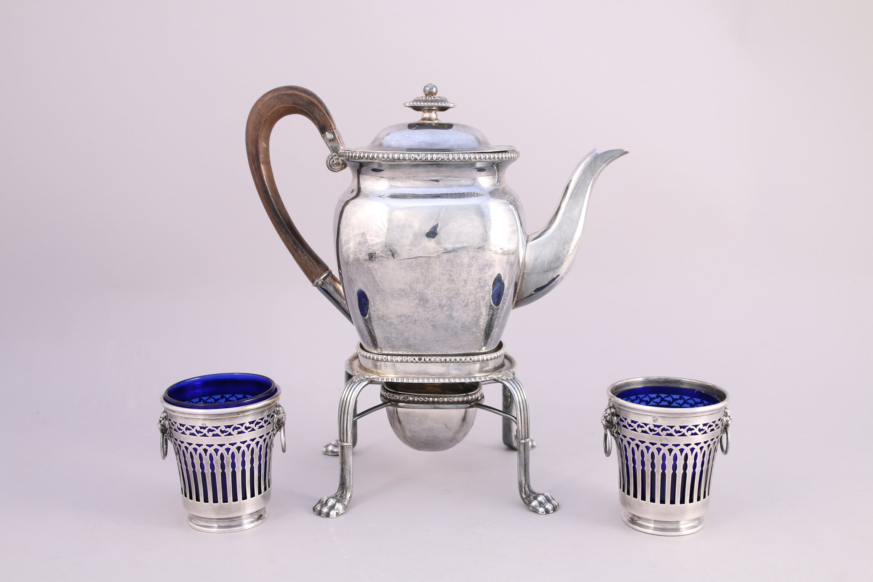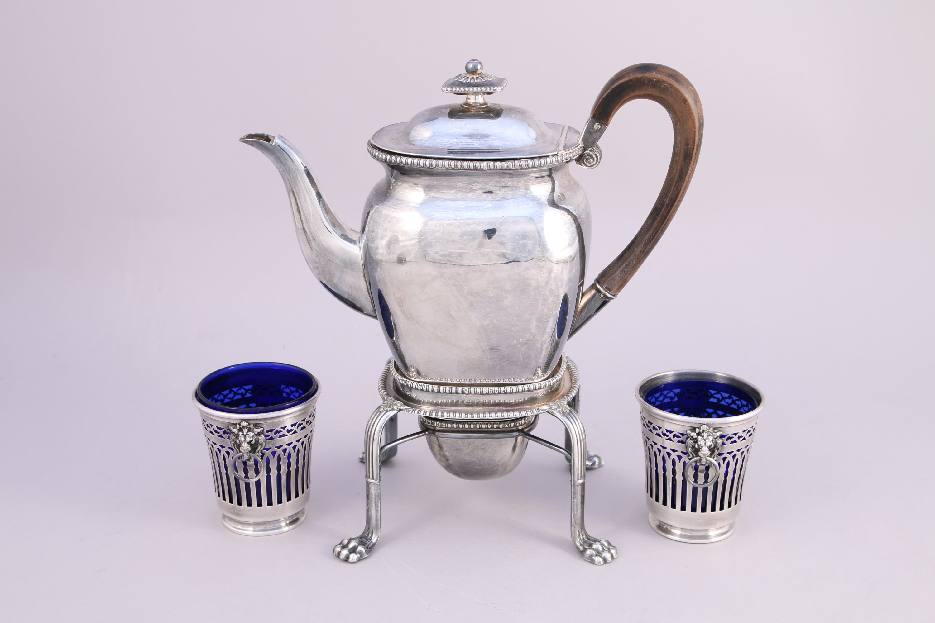 - VERSEUSE et son réchaud. La verseuse en argent uni à décor d'une frise de godrons au col. Fretel de forme rectangulaire à terrasse godronnée sommé d'une boule. Anse en bois. Le réchaud à piètement griffe quadripode orné de godrons, cannelures et palmettes. Haut. totale: 26,5 cm.