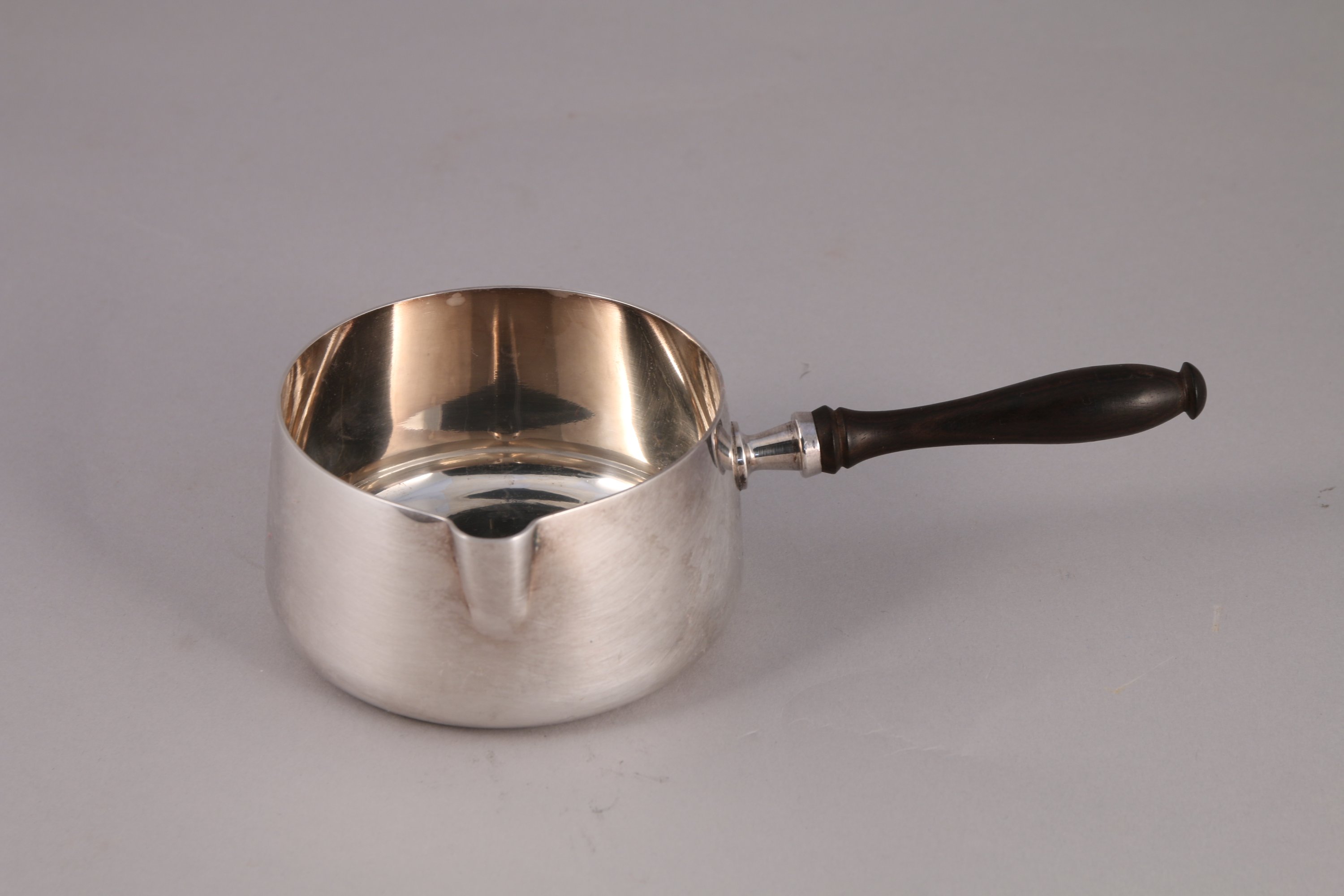 POÊLON DE TABLE en métal argenté uni à manche latéral en bois tourné.