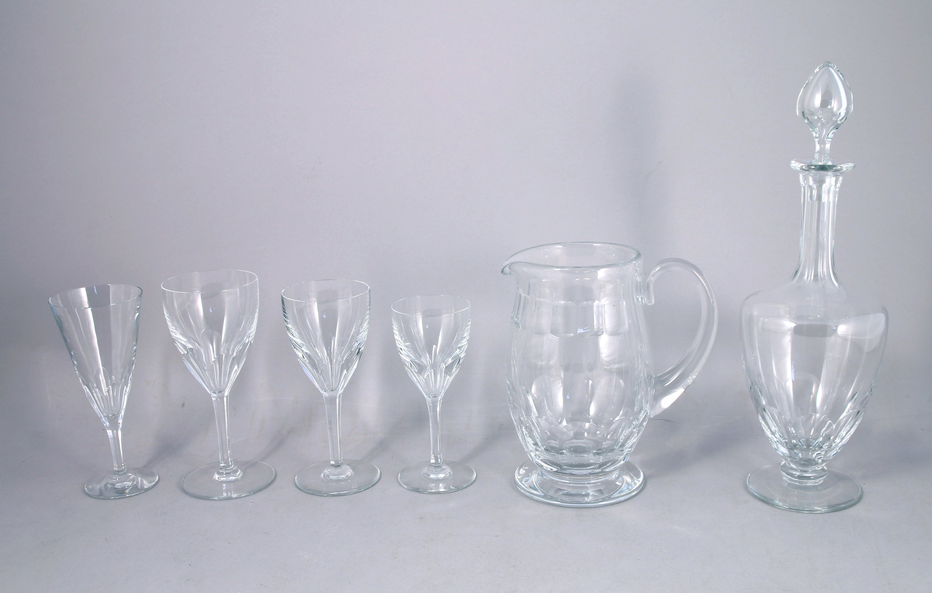 BACCARAT. SERVICE DE VERRES, 71 PIÈCES, modèle à côtes plates, jambe hexagonale et pied rond. Il se compose de 18 VERRES À EAU, 18 VERRES À VIN, 18 VERRES À PORTO, 17 FLÛTES À CHAMPAGNE, d'UNE CARAFE et d'UN BROC. Cachet.