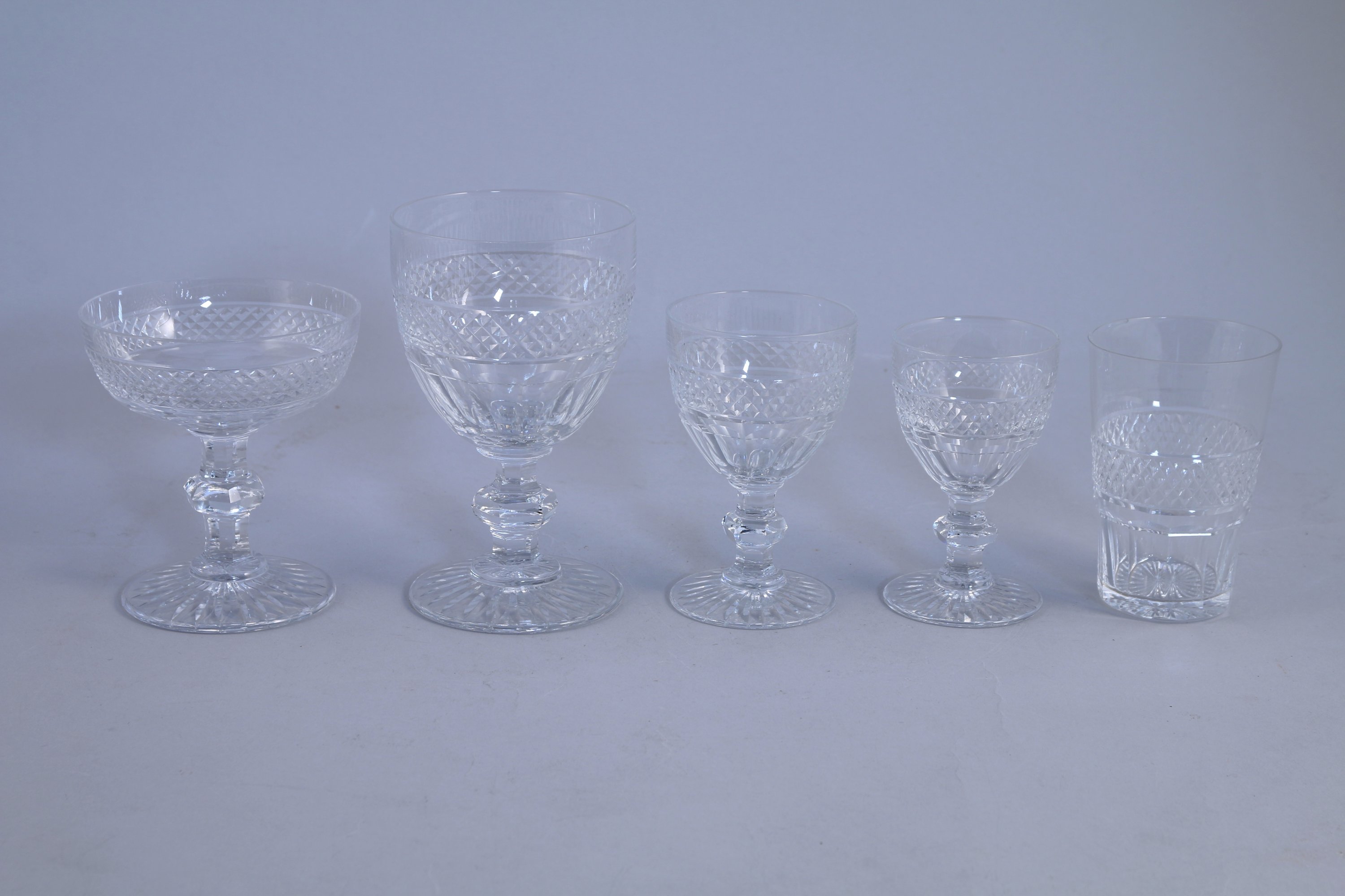 SAINT-LOUIS. SERVICE de VERRES en cristal, 82 PIÈCES, modèle Trianon. Il se compose de 19 verres à eau, 18 coupes à champagne, 18 verres à vin rouge, 18 verres à vin blanc et 9 gobelets.