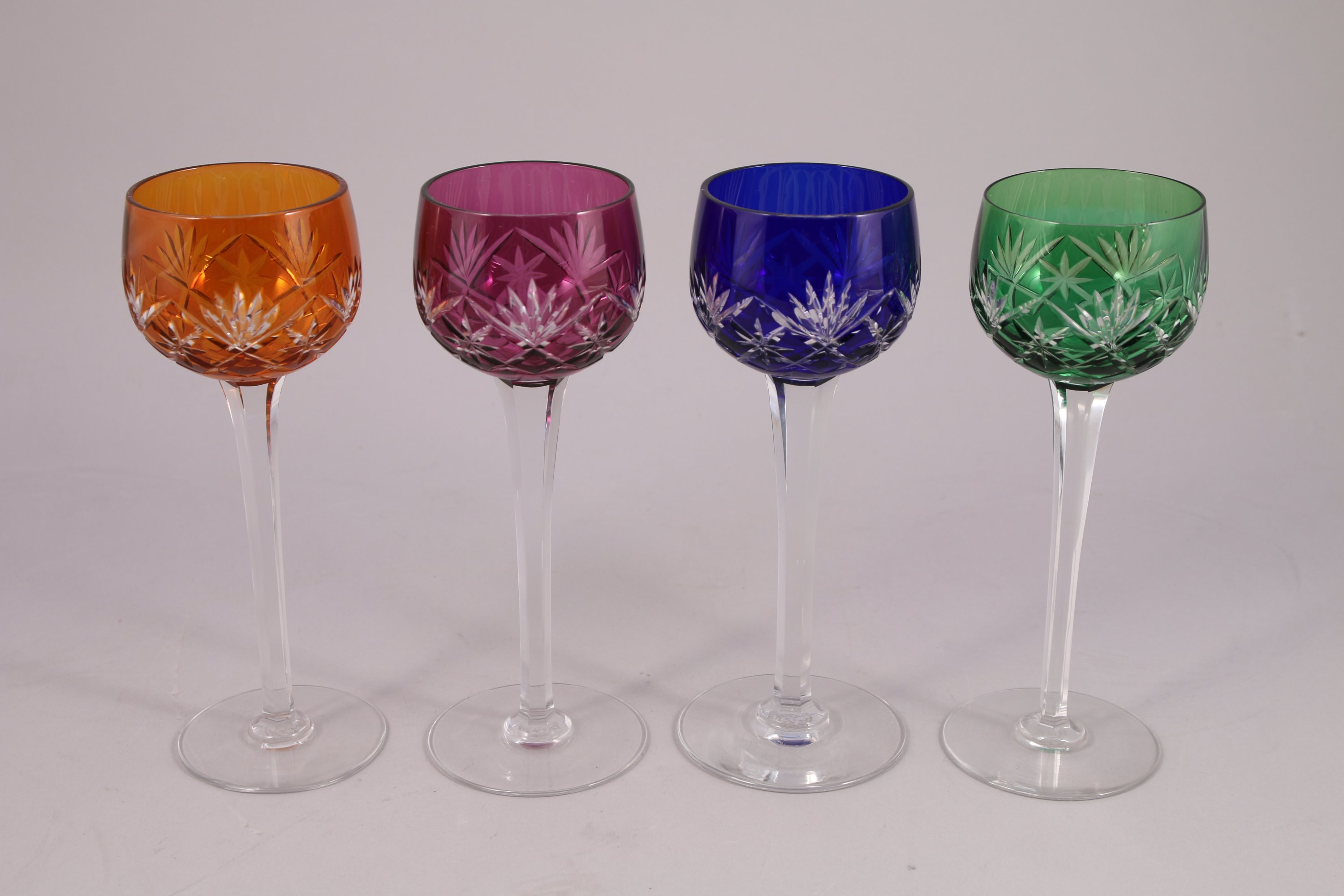 12 VERRES à VIN du RHIN en cristal taillé de couleur: bleu, vert, parme, orangé. Pied élancé à facettes.