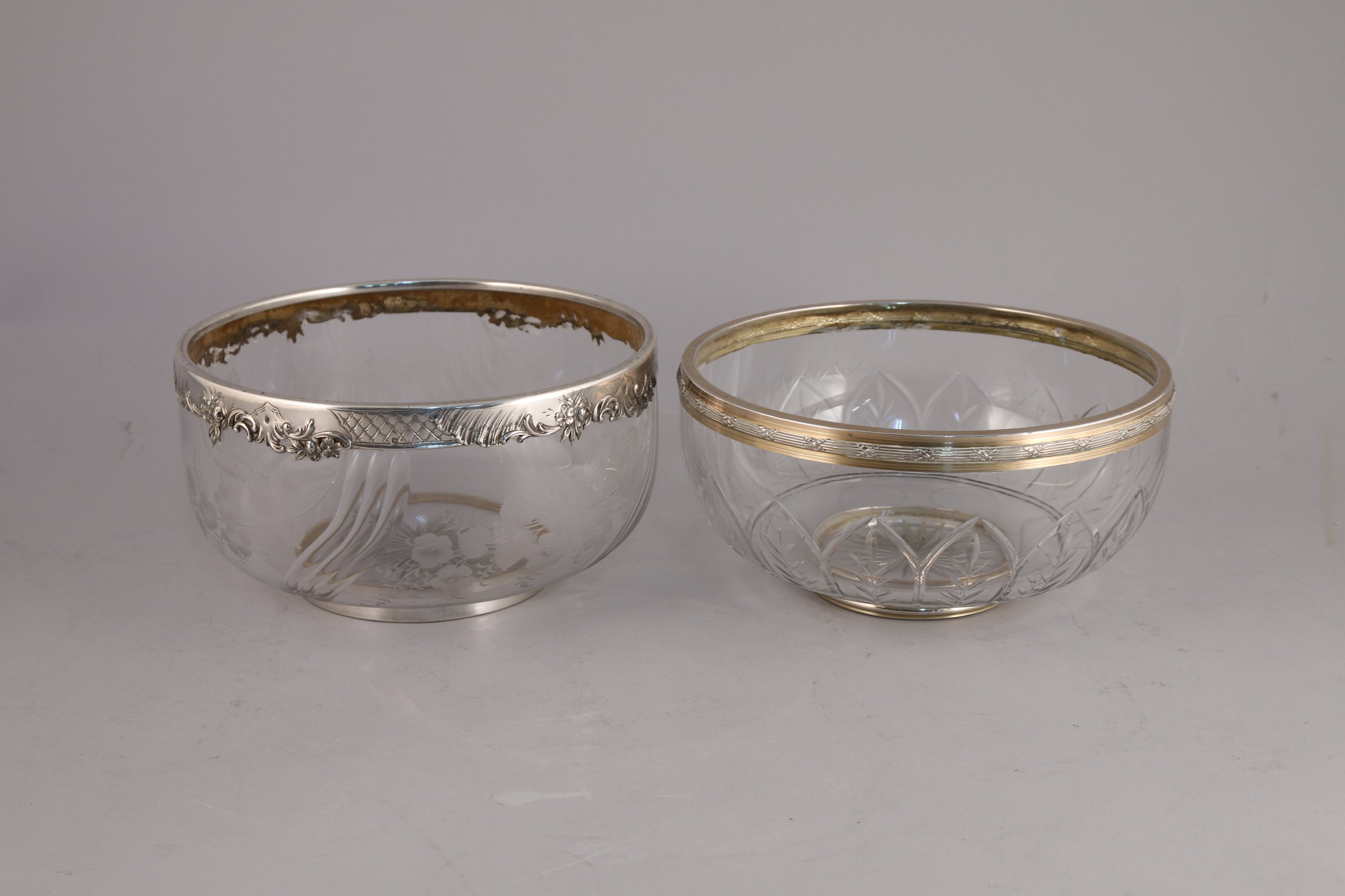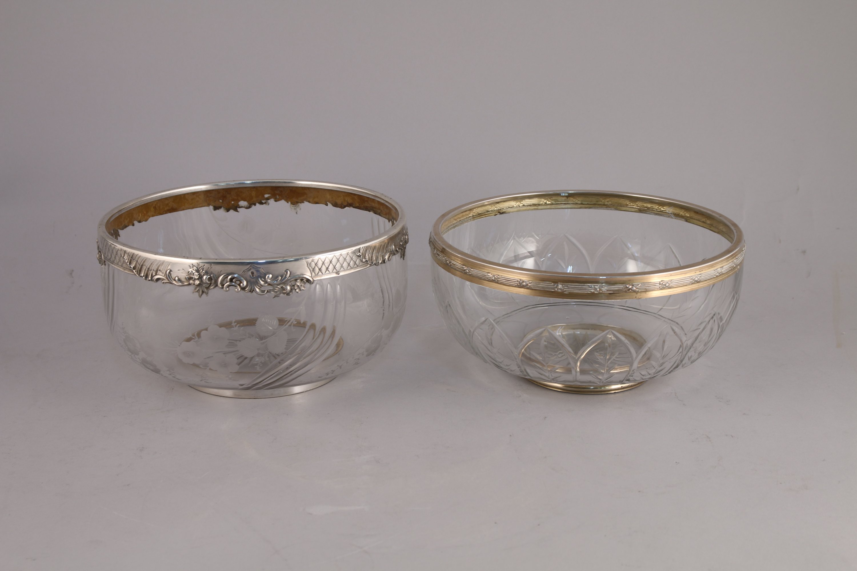DEUX BOLS À PUNCH en cristal cerclés d'argent:
