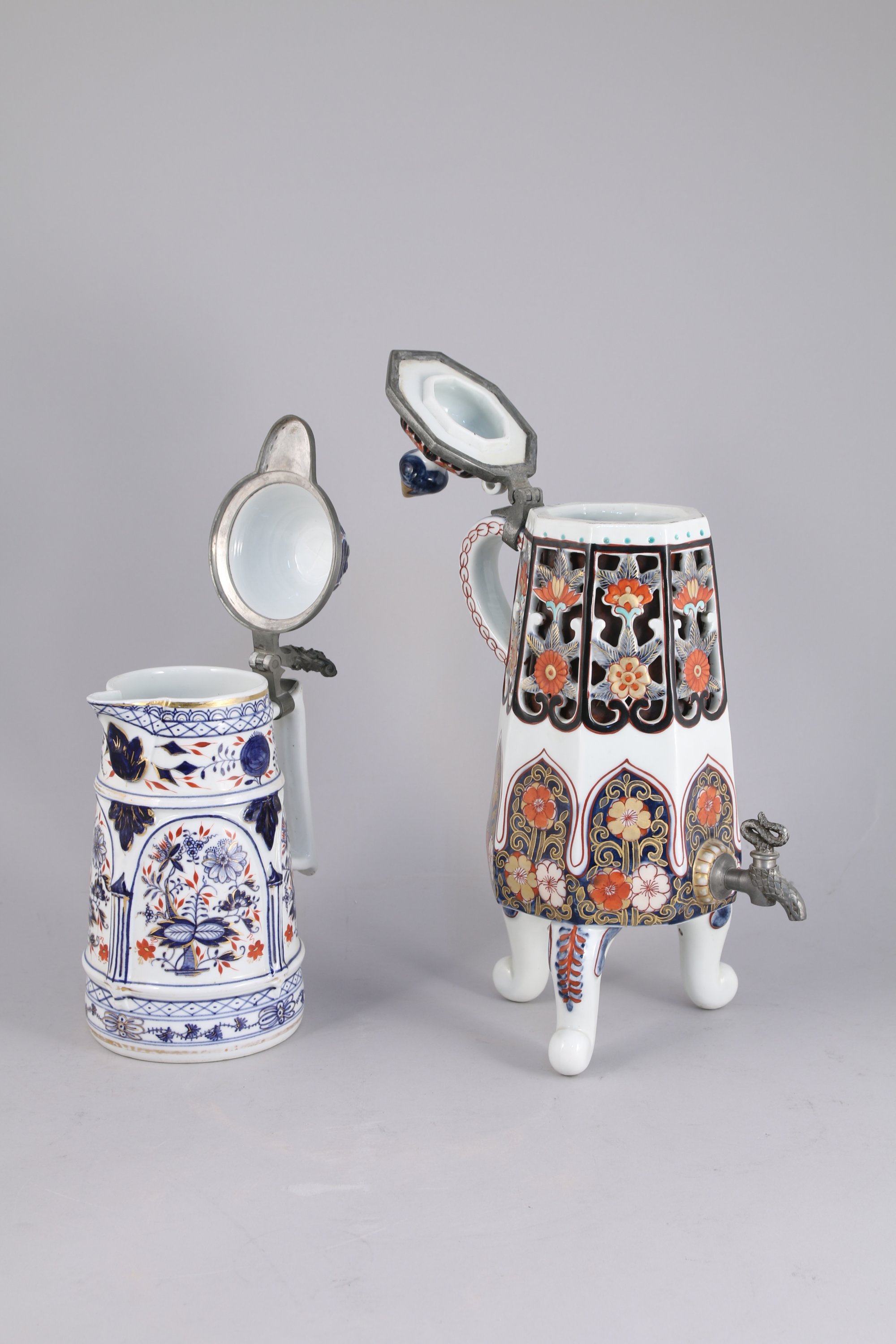 - PICHET couvert de forme tronconique en porcelaine émaillée bleu, rouge et or dans style Imari de bouquets floraux et frises de quadrillages. Le décor est structuré par des feuillages et arcatures en léger relief. Couvercle à charnière cerclé d'étain. L'appui-pouce orné d'un masque féminin coiffé d'une coquille et flanqué de cuirs découpés.