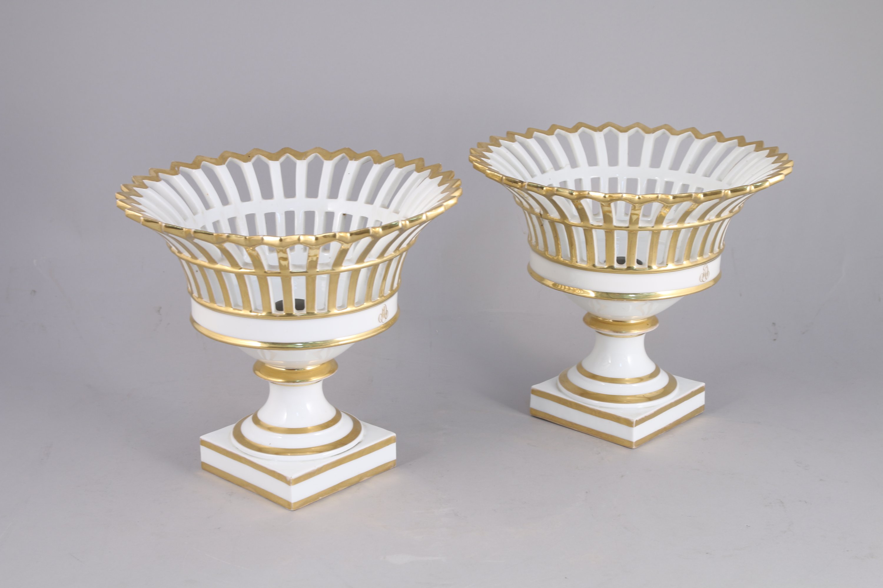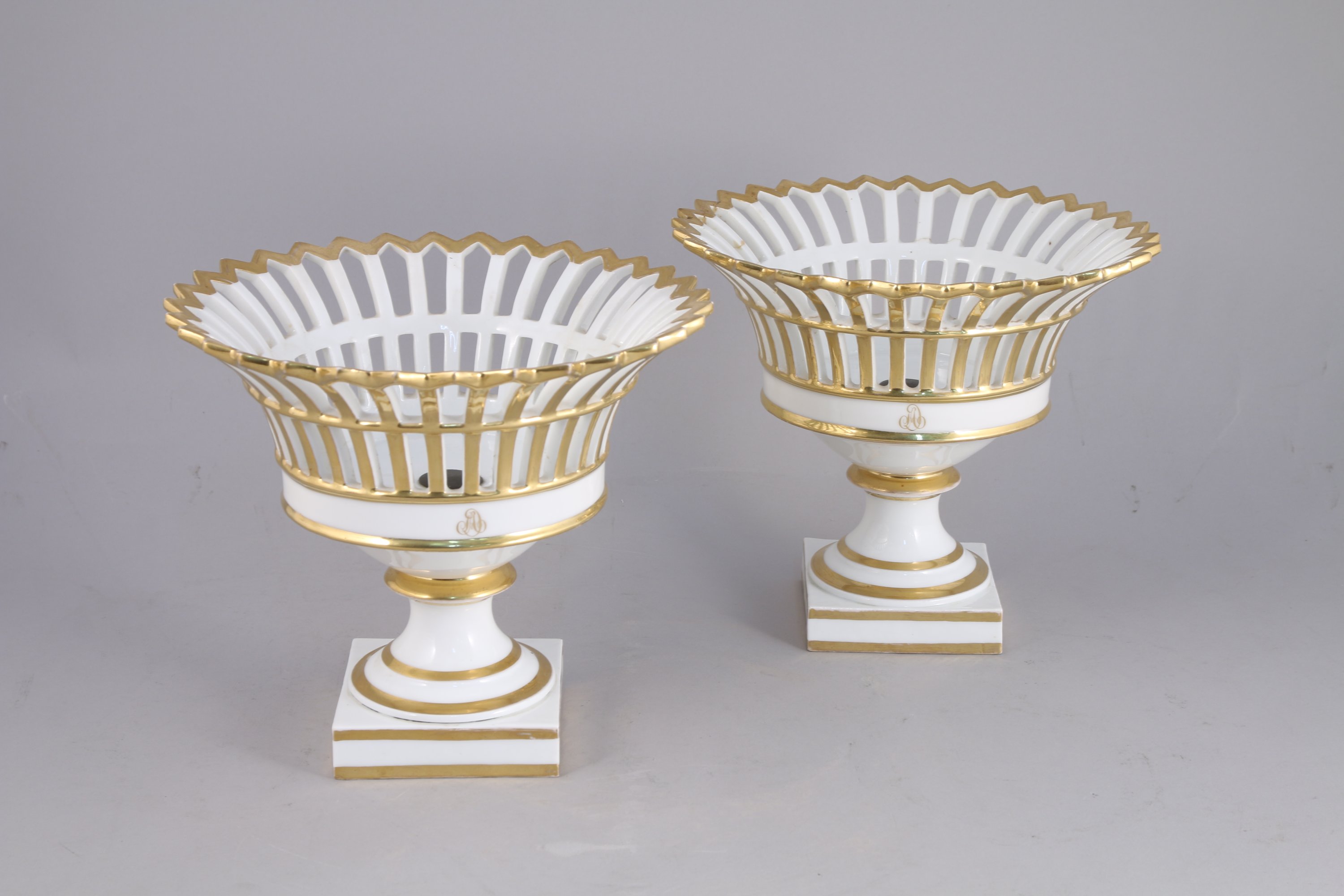 PARIS. PAIRE DE CORBEILLES À FRUITS de forme circulaire en porcelaine à décor or. Elles reposent sur une piédouche et une base de forme carrée. Monogrammées "AD".
