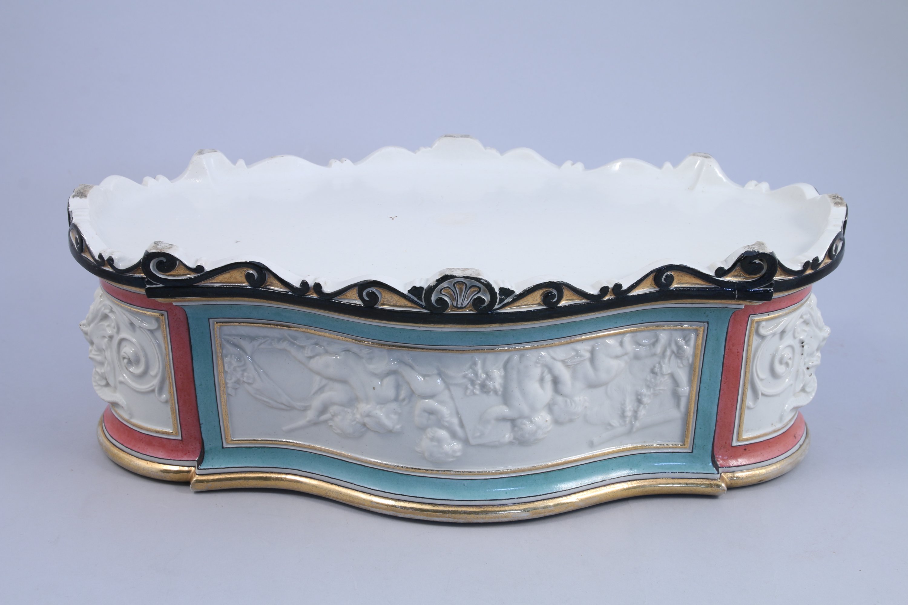 JARDINIÈRE de forme chantournée en porcelaine à décor en bas-relief de putti et marcarons dans des encadrement émaillés, vert, rose, noir et or. Frise à enroulements en partie basse.