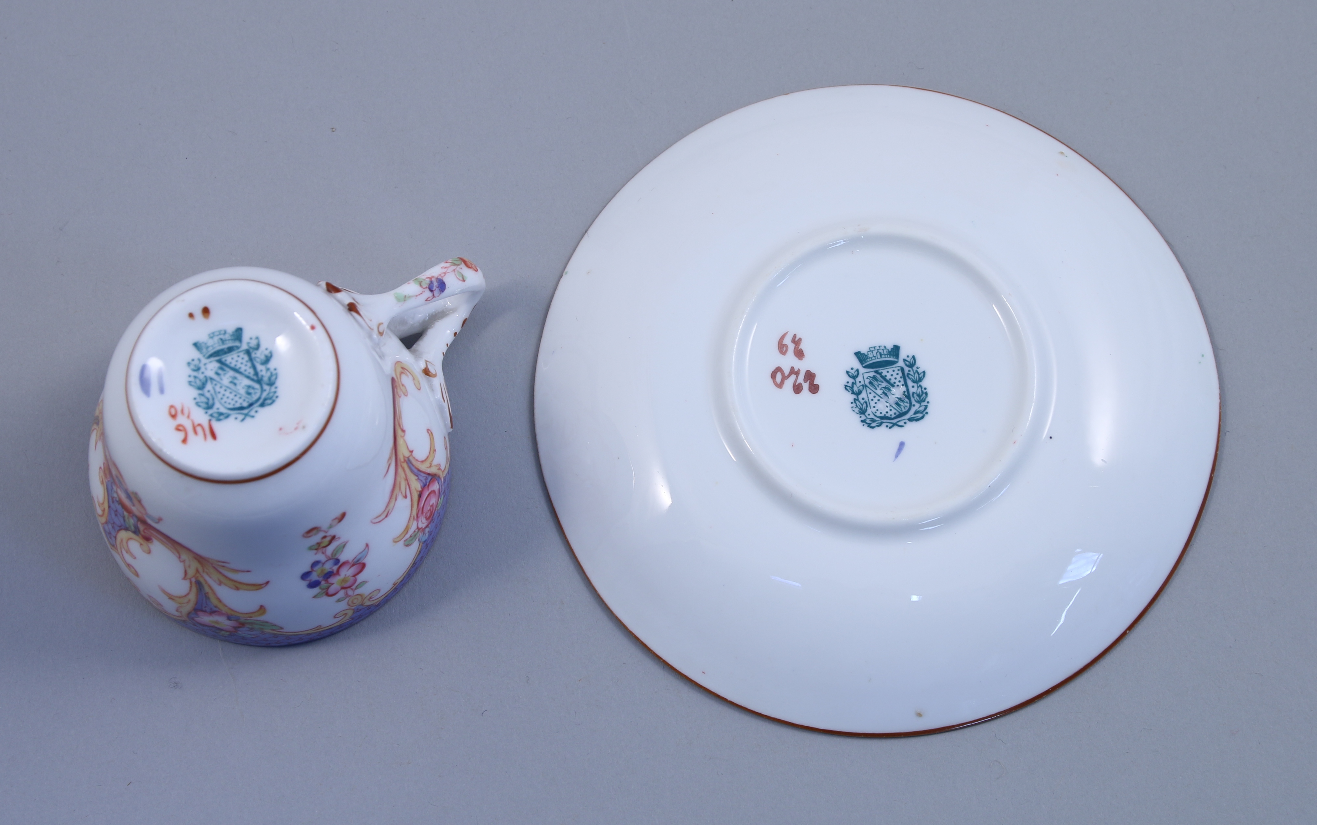SARREGUEMINES. SERVICE À THÉ-CAFÉ, 24 PIÈCES, en porcelaine à décor polychrome. Il se compose de 12 tasses à thé et de 12 tasses à café et leurs sous-tasses.