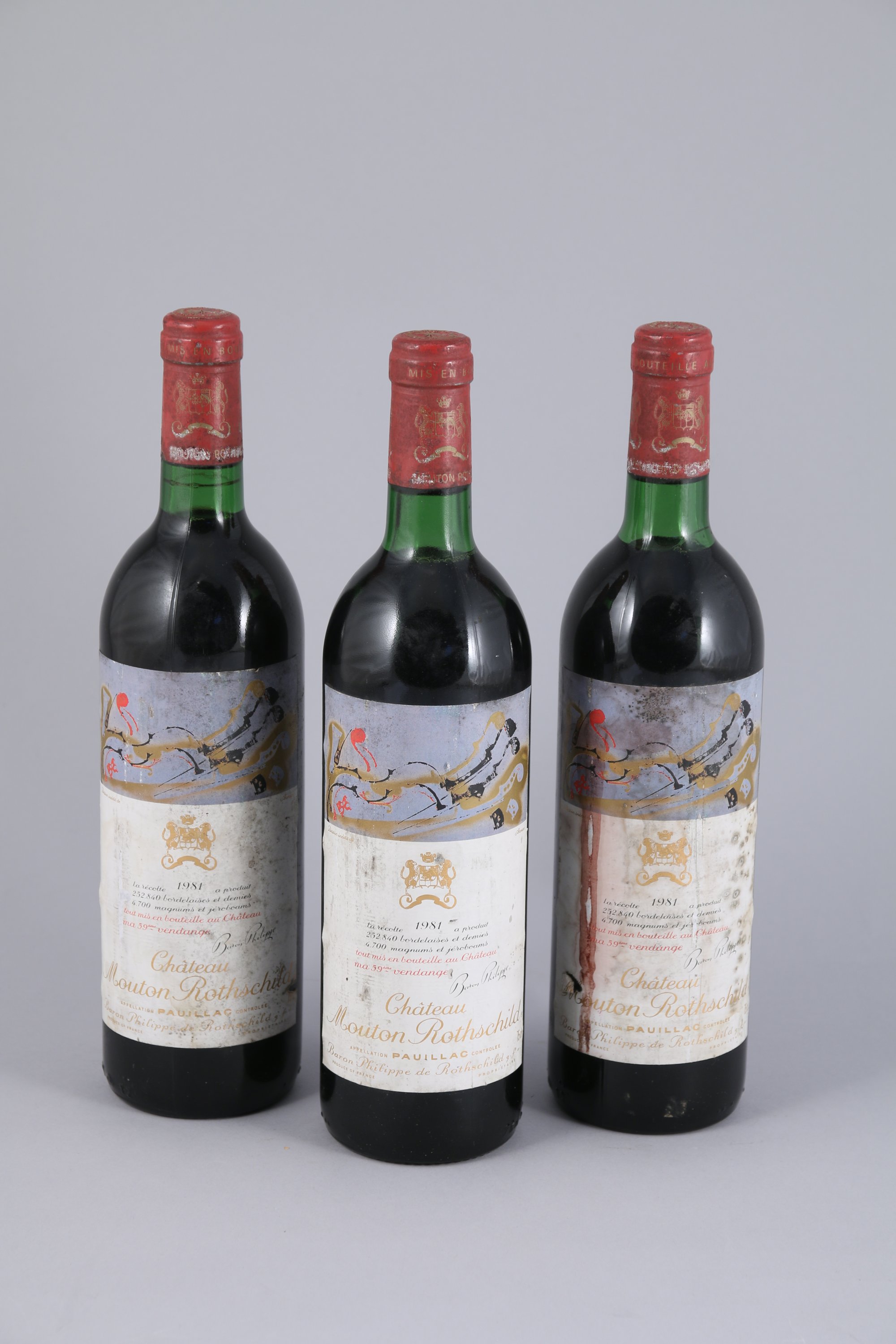 PAUILLAC. Château Mouton Rothschild, 1981, dessin d'Arman. 3 bouteilles. (TLB, une étiquette tachée et déchirée).