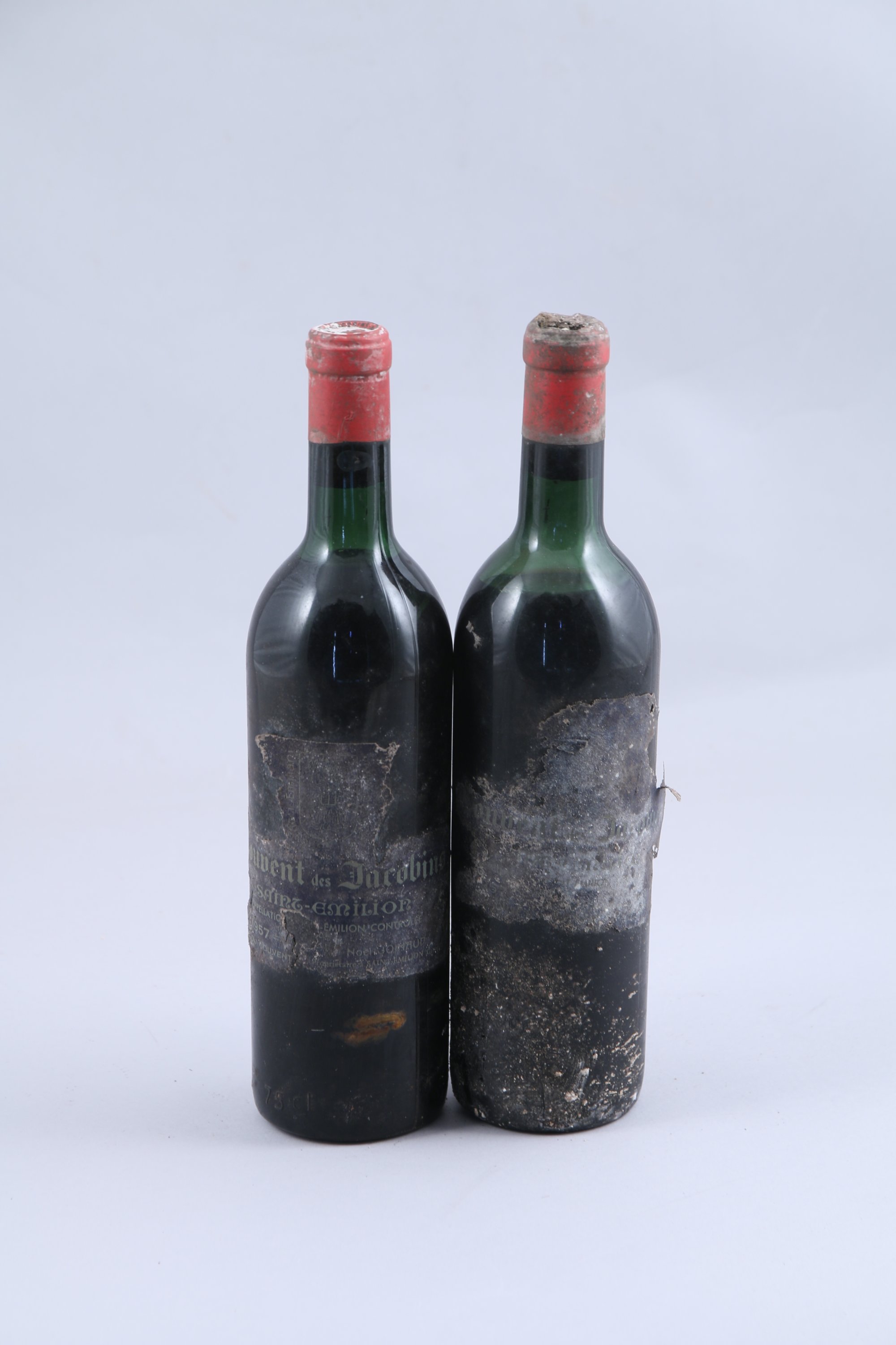 SAINT-ÉMILION. Château Couvent des Jacobins, GCC, 1957. 2 bouteilles. (HE et ME, étiquettes très déchirées)