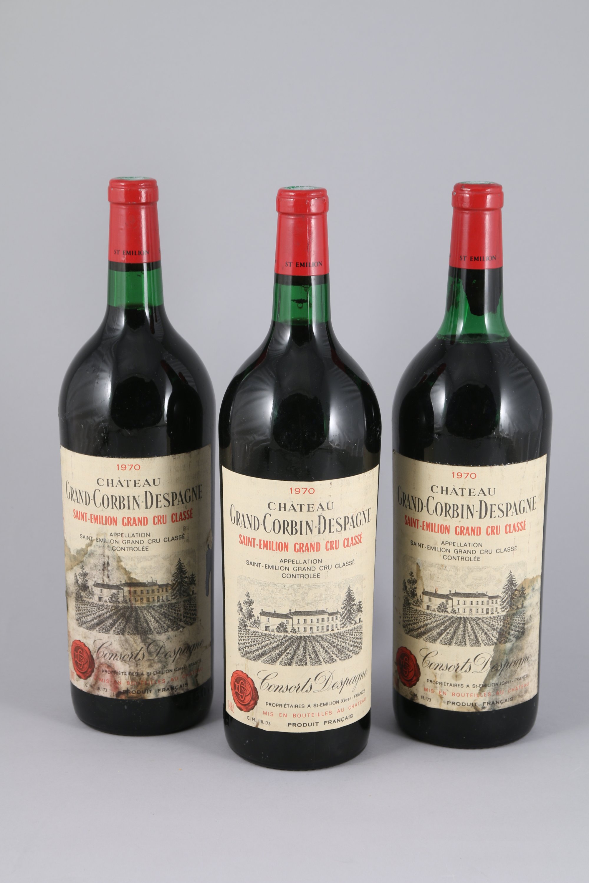 SAINT-ÉMILION. Grand-Corbin-Despagne, GCC, 1970. 3 magnums. (BG et TLB, étiquettes tachées et déchirées).