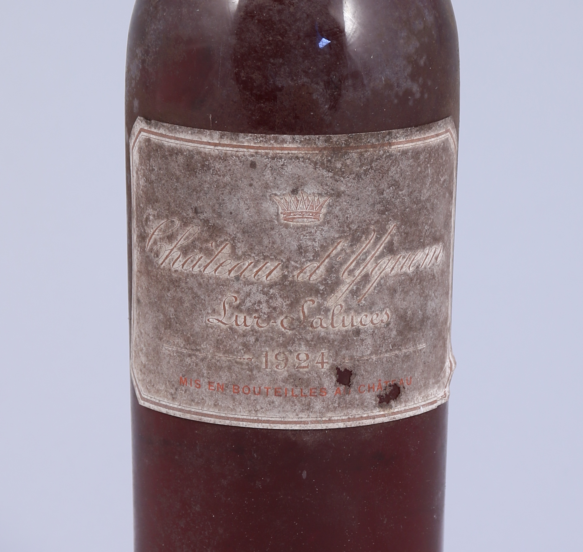 SAUTERNES. Château d'Yquem, Lur-Saluces, 1er Cru Supérieur, 1924. 1 bouteille (HE, étiquette abîmée et décollée)