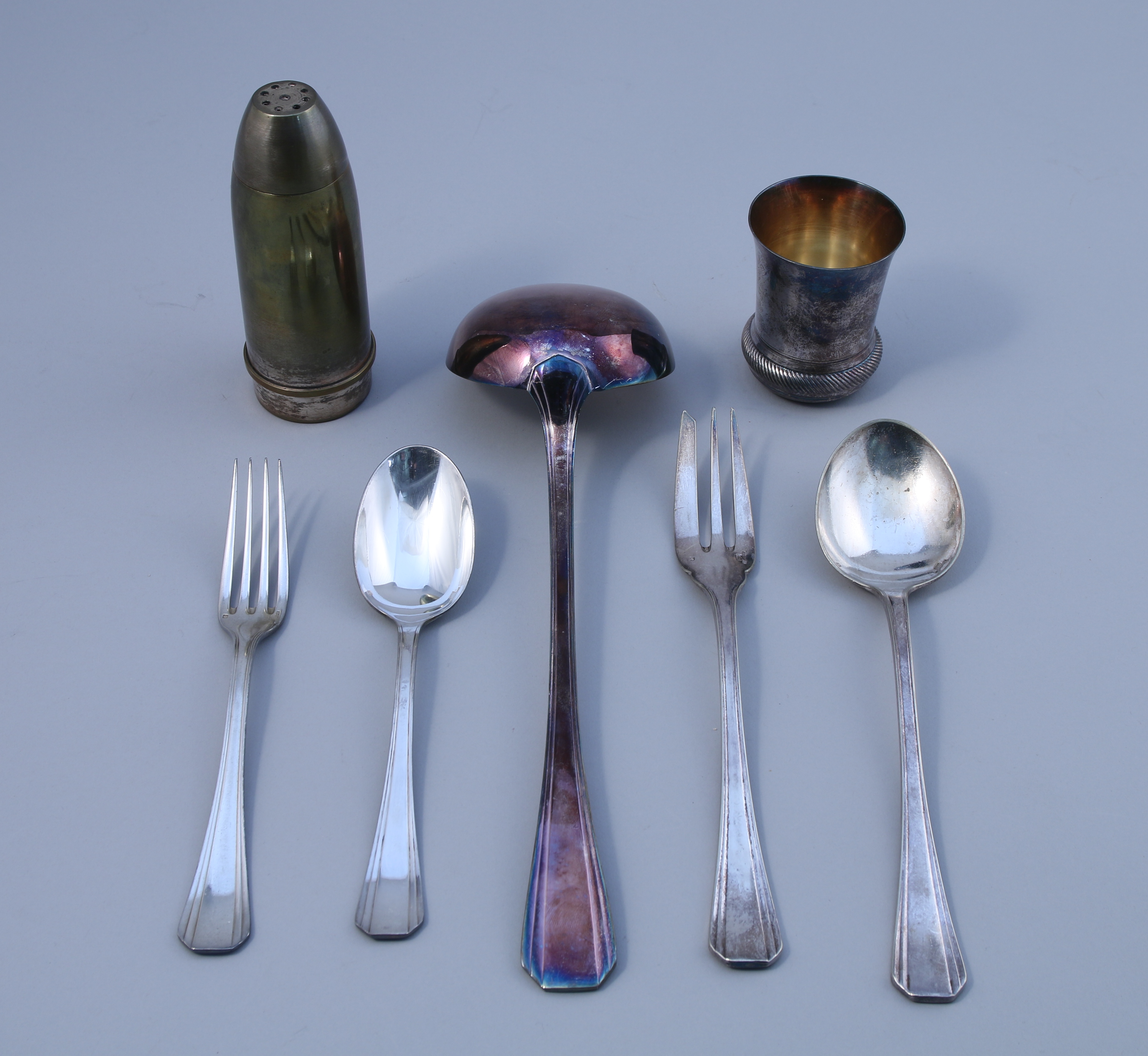 Réunion de 15 PIÈCES en métal argenté dont une SALIÈRE adoptant la forme d'un obus, une TIMBALE, trois COUVERTS et deux CUILLÈRES CHRISTOFLE, un COUVERT DE SERVICE et une LOUCHE CHRISTOFLE et une suite de 12 FOURCHETTES À HUÎTRES.