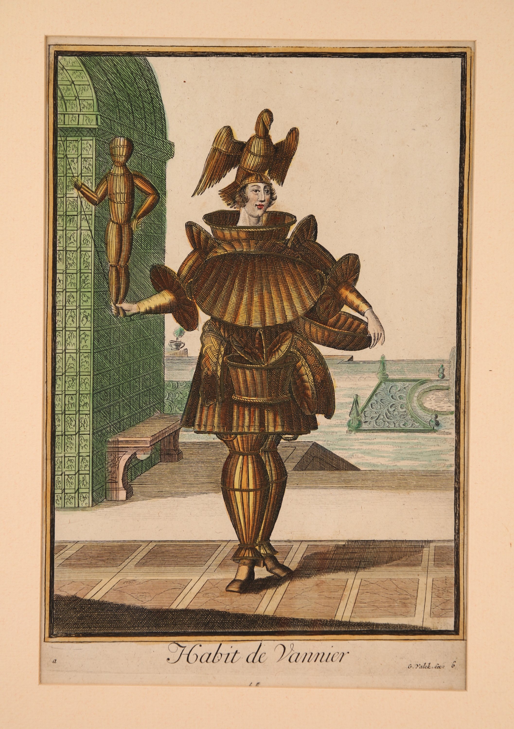 La famille Larmessin forme avec les quatre Nicolas une véritable dynastie de graveurs parisiens du milieu du XVIIe jusqu'au milieu du XVIIIe siècle. Le plus célèbre d'entre eux Nicolas II de Larmessin, imagine la série des " Costumes Grotesques " vers 1691, série qui sera achevée par son frère Nicolas III et le fils de ce dernier Nicolas IV. Dans cette série de 97 gravures, chaque personnage est figuré avec les outils et objets en relation avec la profession représentée. À la fois allégorique et objet de dérision, utilitaire et socialement représentatif, l'objet identifie l'homme et le situe dans sa corporation. Si les corporations, sortes de guildes de métiers, sont connues en France dès le XIIème siècle, c'est par l'édit du 13 mars 1673 que Colbert prescrit l'organisation définitive de ses dernières en les plaçant sous l'autorité royale. Les " Costumes Grotesques " en plus de leur originalité baroque constituent donc une uvre parfaitement représentative de son temps.