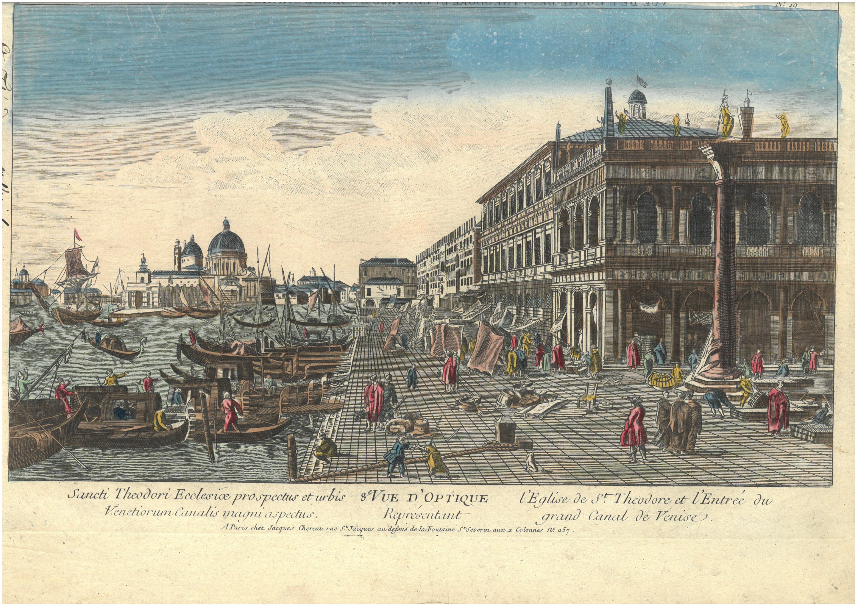Les vues d'optiques témoignent d'une vogue des images en perspective, montrées dans les salons dès la fin du XVIIIe siècle et au début du XIXe siècle. Ce lot présente des ves de Florence, Venise et Rome, dont une vue des anciens monuments de Rome, témoignant du goût de ce siècle pour l'Antiquité.