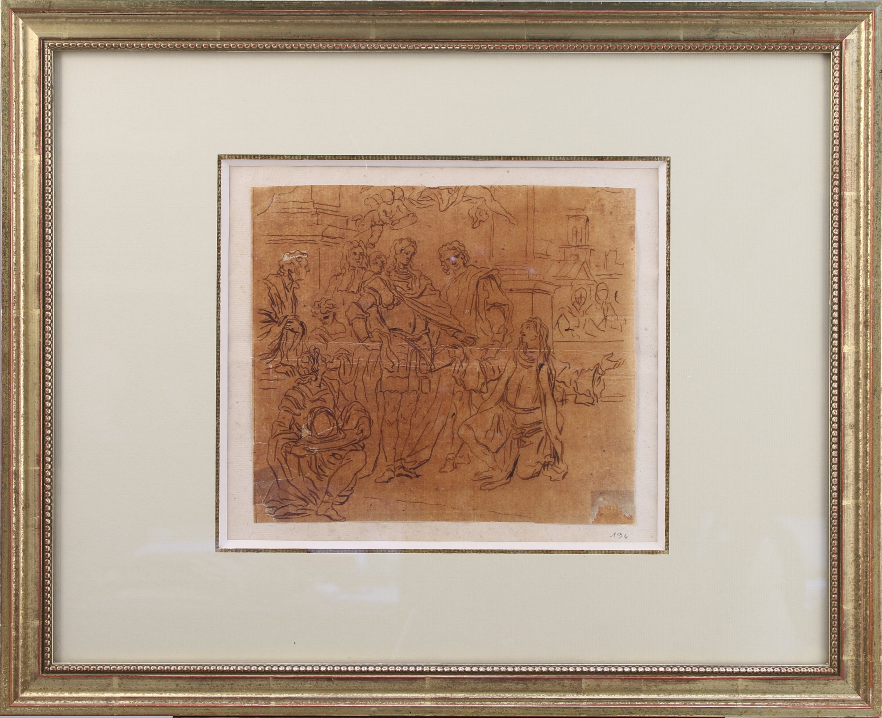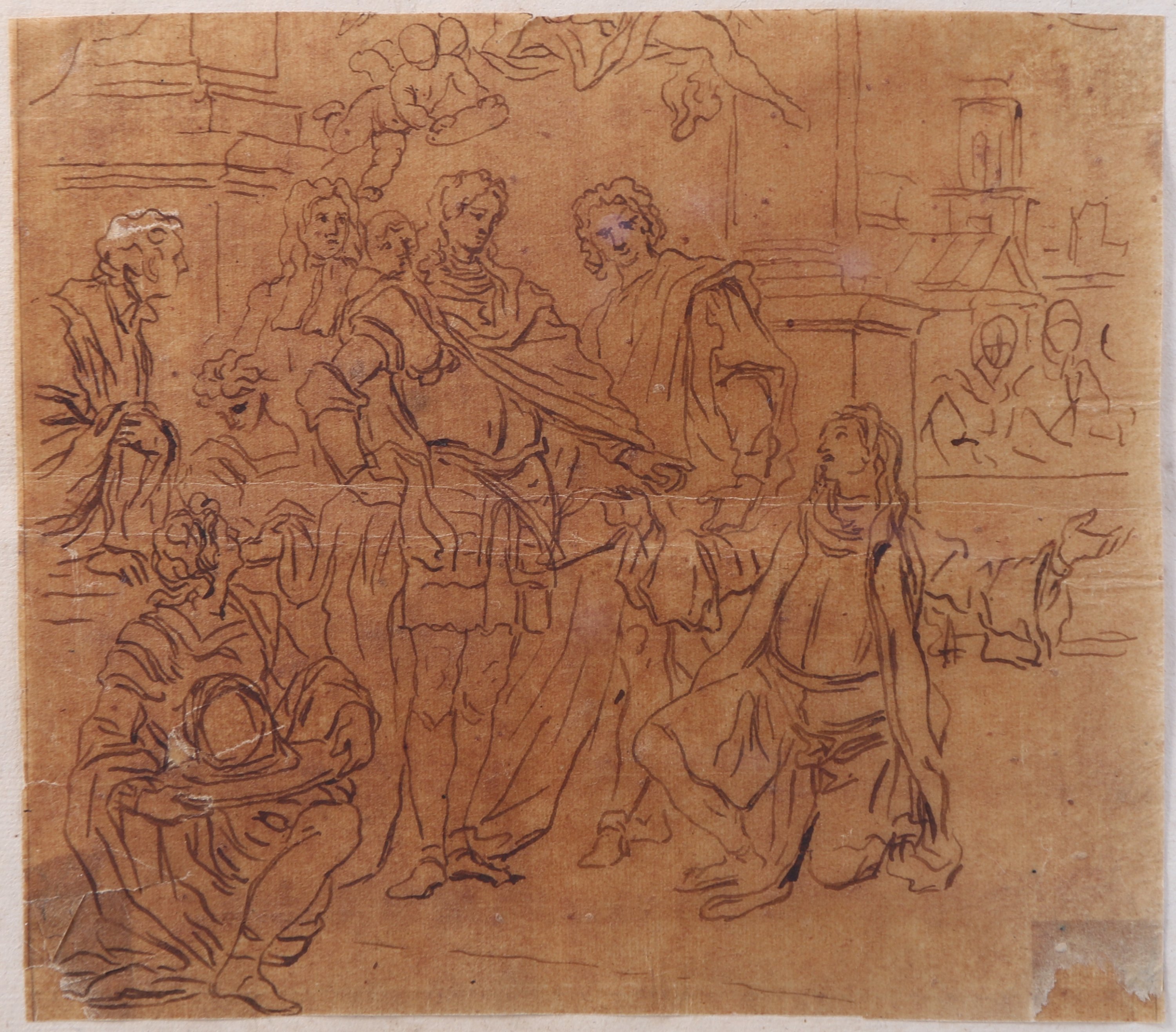 Jeune femme suppliant un personnage entouré de sa cour et courroné par des anges.