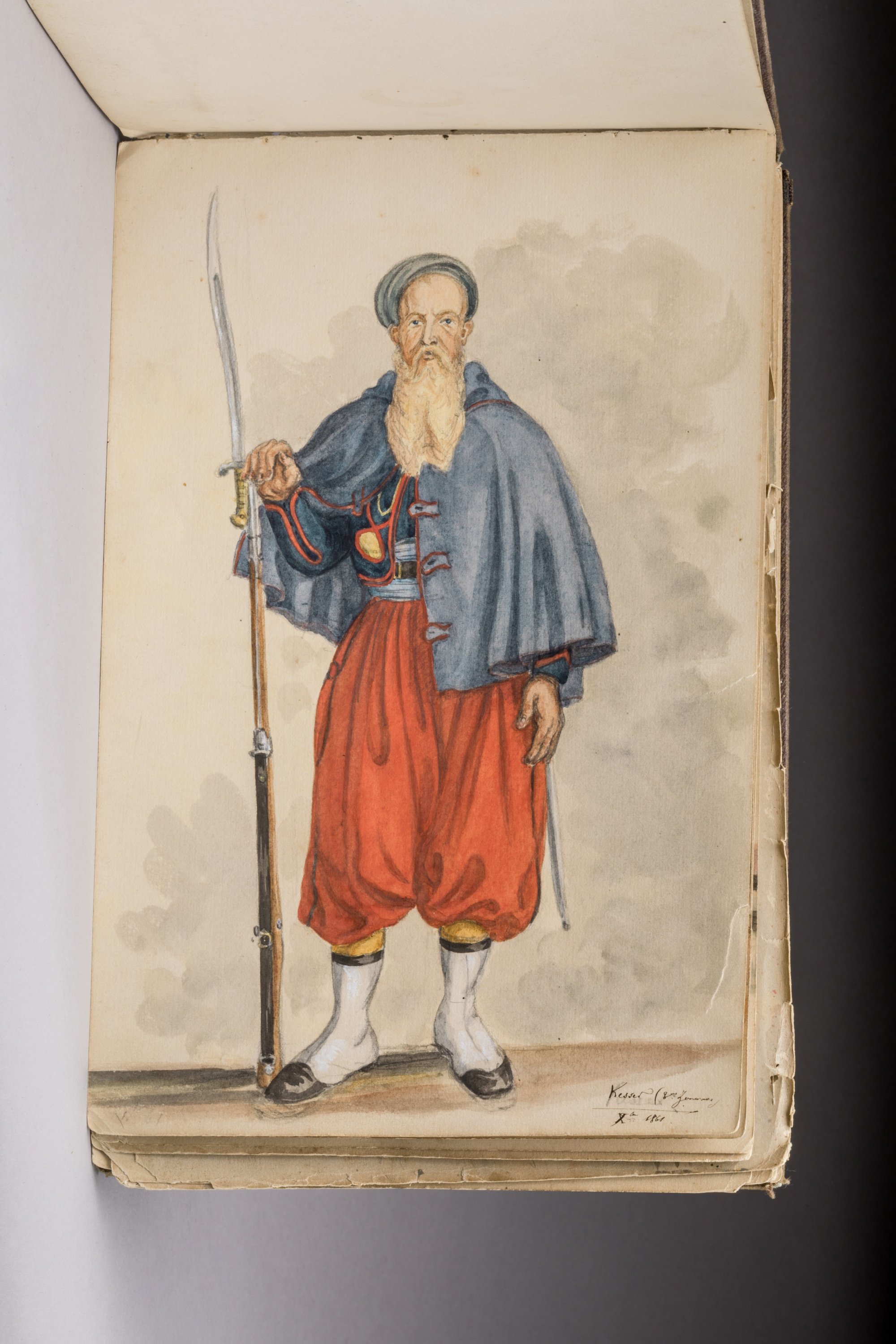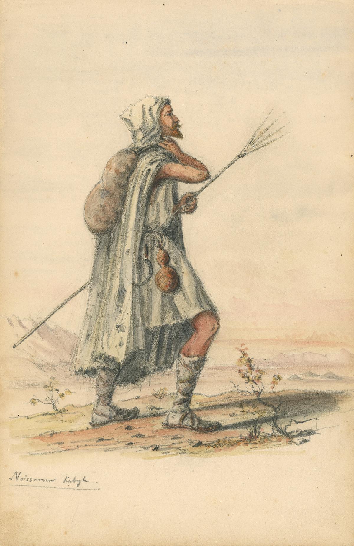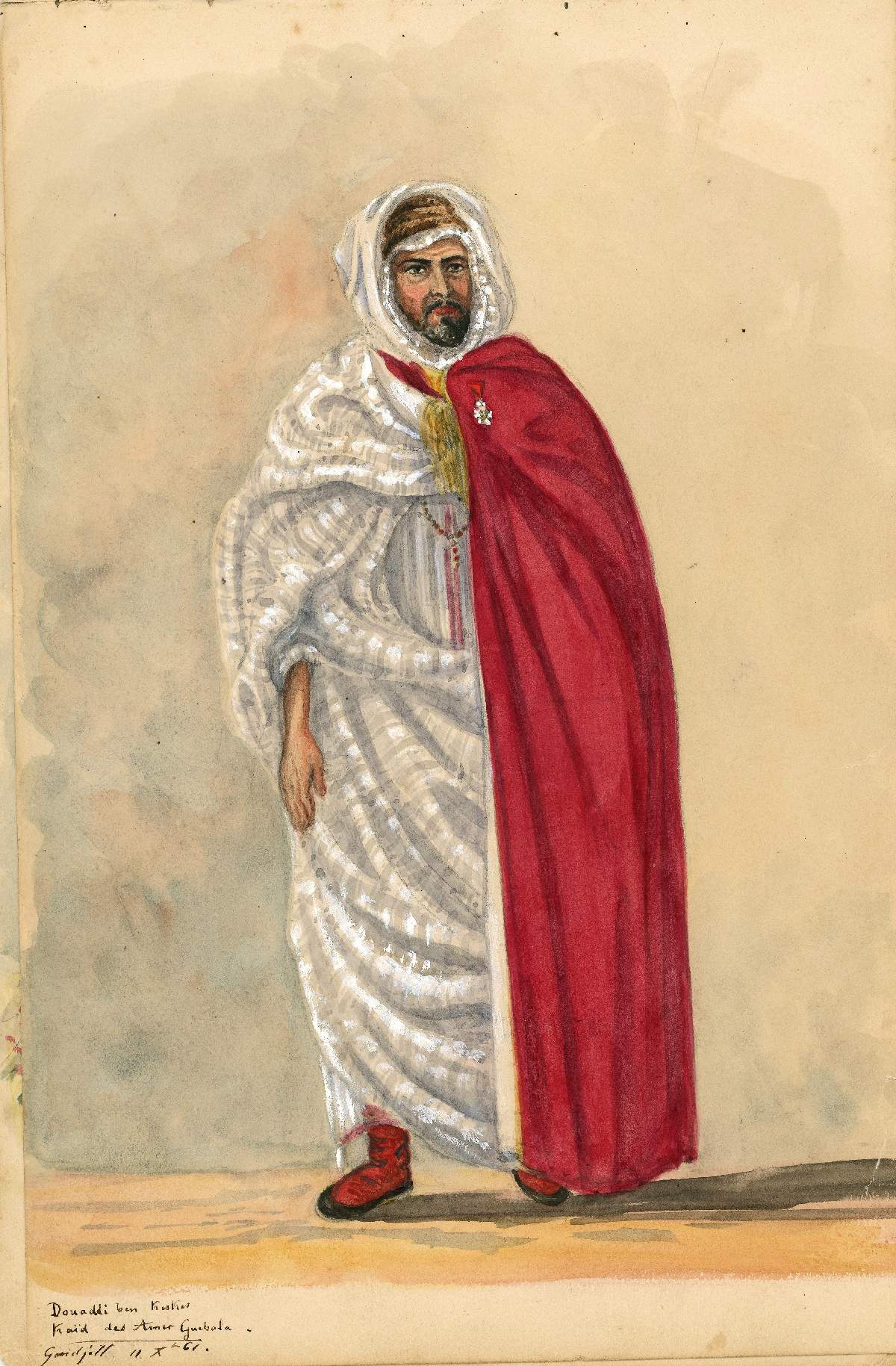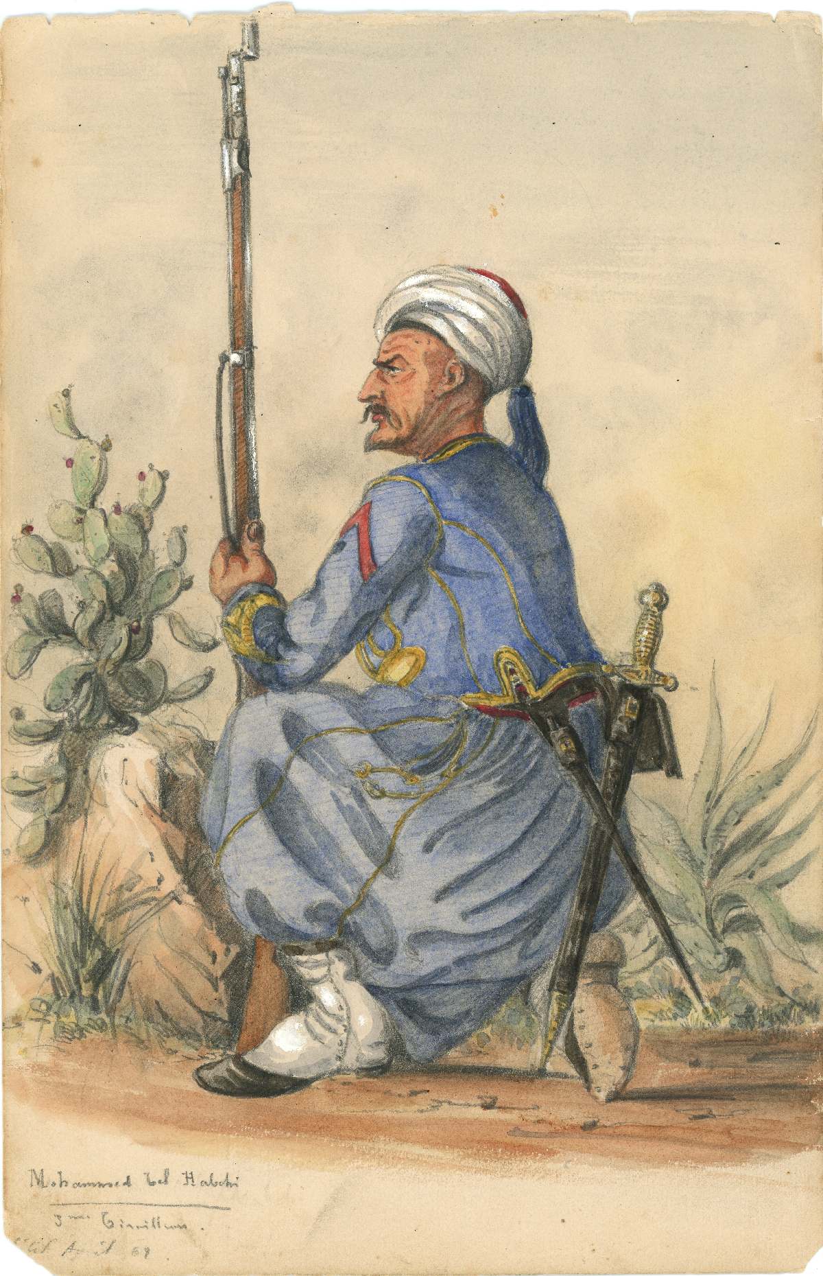 Album souvenir et personnel de l'officier stagiaire Guioth, en garnison en Kabylie de 1861 à 1866, ayant croqué des compagnons d'armes, des chefs de tribus, des autochtones, etc: " Si Mohamed Saïd Ben Ali Chérif, caïd de Chellata " portant la légion d'honneur ; " Mohamed Ben Sidi Moussa, touareg du pays des Anchef, à 6 jours de marche du Soudan " ; " Douaddi Ben Keskes [Mohamed Ben Douadi Ben Keskes] Kaïd des Amer Guebala " portant la légion d'honneur, à Guidjel ; " Bou Zen " ; Kesser (3e zouaves) ; " Général Nesmes Desmaret et Capitaine Guioth " ; " Chougui " et " Bel Kassem " ; " Boulanger " [zouave] ; " Le Mahari " à Biskra ; " Le cawadji " [le cafetier] ; " Touareg " ; " Lahldja " ; " Les Danseuses " à El Kantara ; " Oumouxreis et Messaouda, Ouled Naylas " [tribu des Ouled Naïls] à Biskra ; " Moissonneur Kabyle " ; " Embuscade Kabyle " ; " Mohammed Bel Habchi, 3e tirailleurs " à Sétif ; " Au pâturage " ; " El Aroussa " ; " Retour du Mouchi " ; " Le dépiquage du grain " ; " Marché de Sétif " ; " Danses d'Oualed Naïls " ; Baie de Stora et Rade de Philippeville ; etc.