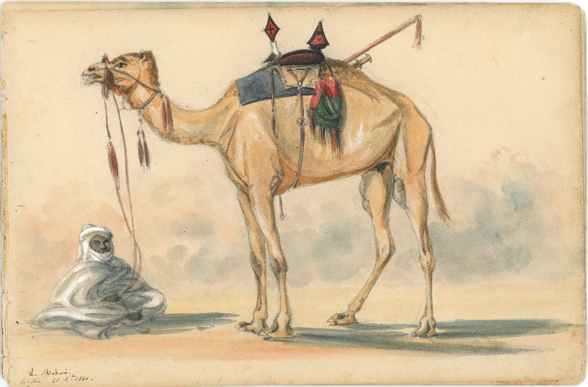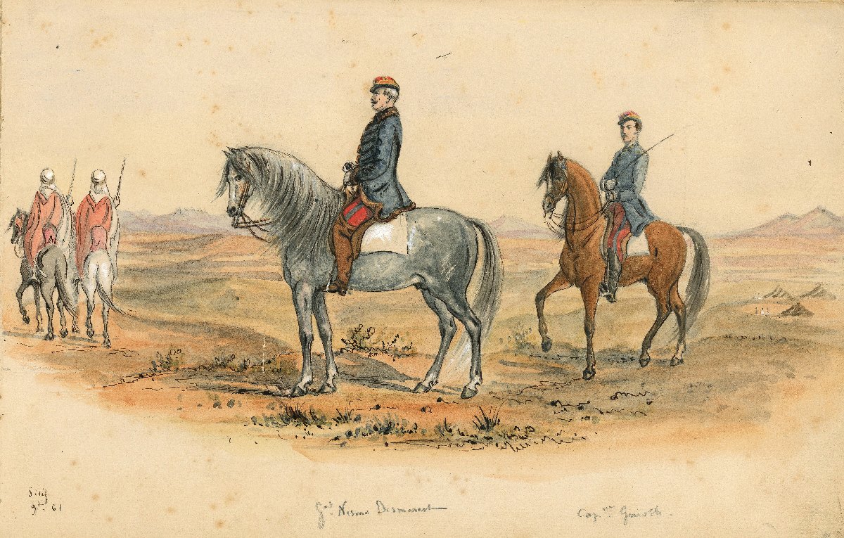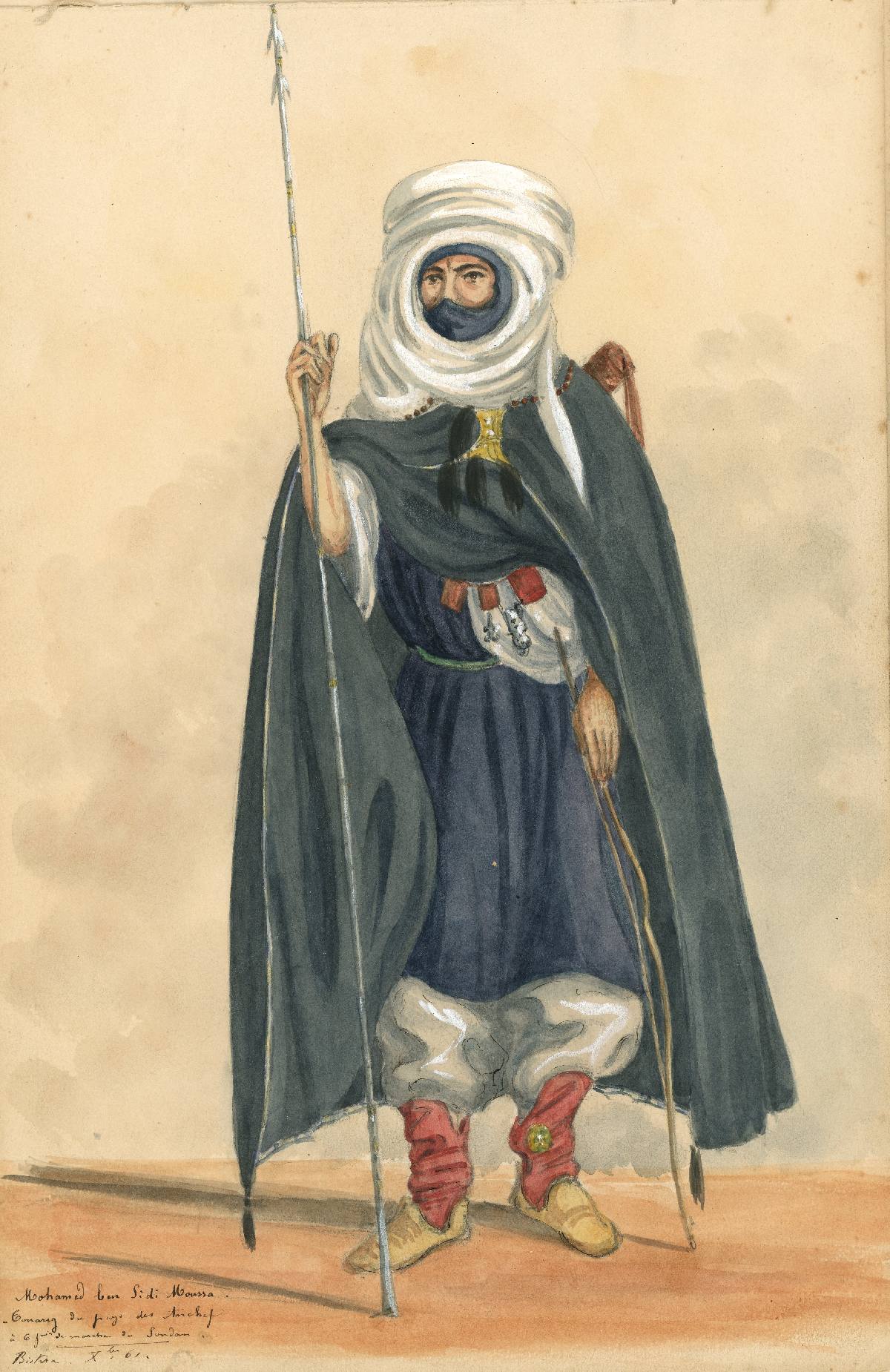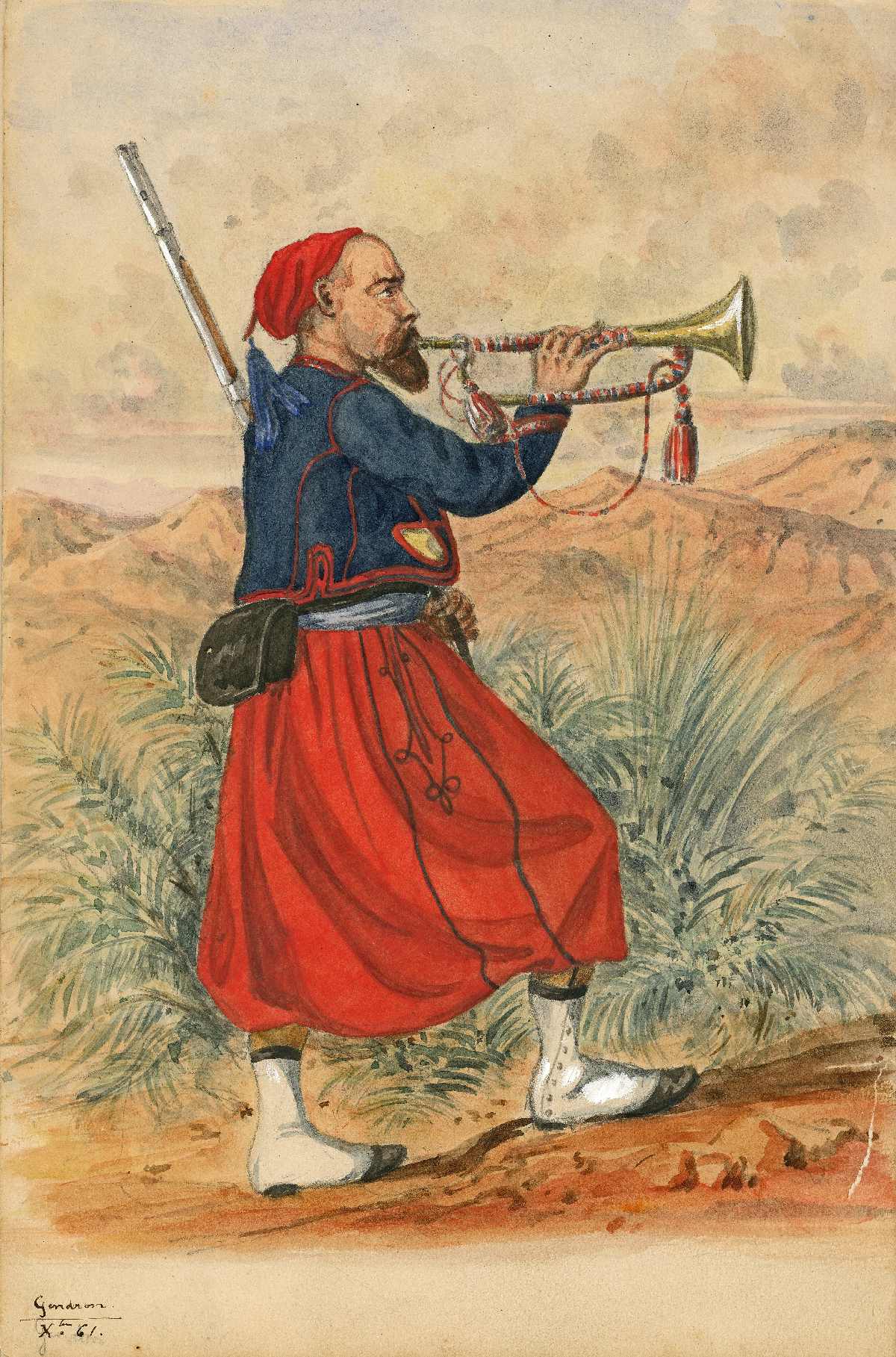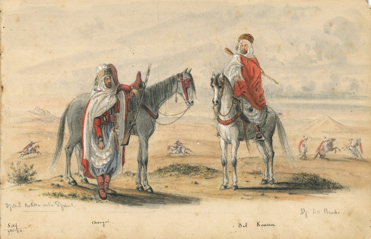 Album souvenir et personnel de l'officier stagiaire Guioth, en garnison en Kabylie de 1861 à 1866, ayant croqué des compagnons d'armes, des chefs de tribus, des autochtones, etc: " Si Mohamed Saïd Ben Ali Chérif, caïd de Chellata " portant la légion d'honneur ; " Mohamed Ben Sidi Moussa, touareg du pays des Anchef, à 6 jours de marche du Soudan " ; " Douaddi Ben Keskes [Mohamed Ben Douadi Ben Keskes] Kaïd des Amer Guebala " portant la légion d'honneur, à Guidjel ; " Bou Zen " ; Kesser (3e zouaves) ; " Général Nesmes Desmaret et Capitaine Guioth " ; " Chougui " et " Bel Kassem " ; " Boulanger " [zouave] ; " Le Mahari " à Biskra ; " Le cawadji " [le cafetier] ; " Touareg " ; " Lahldja " ; " Les Danseuses " à El Kantara ; " Oumouxreis et Messaouda, Ouled Naylas " [tribu des Ouled Naïls] à Biskra ; " Moissonneur Kabyle " ; " Embuscade Kabyle " ; " Mohammed Bel Habchi, 3e tirailleurs " à Sétif ; " Au pâturage " ; " El Aroussa " ; " Retour du Mouchi " ; " Le dépiquage du grain " ; " Marché de Sétif " ; " Danses d'Oualed Naïls " ; Baie de Stora et Rade de Philippeville ; etc.