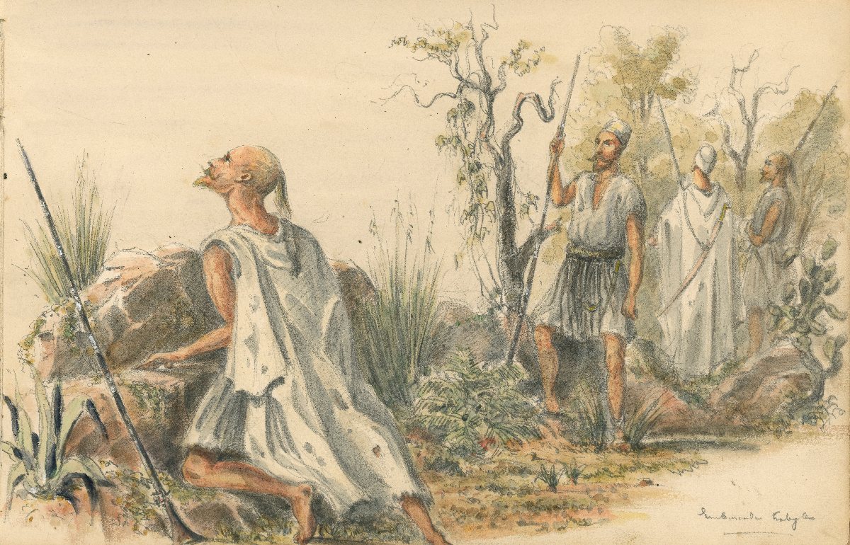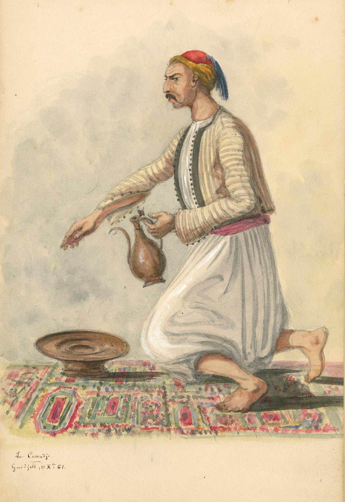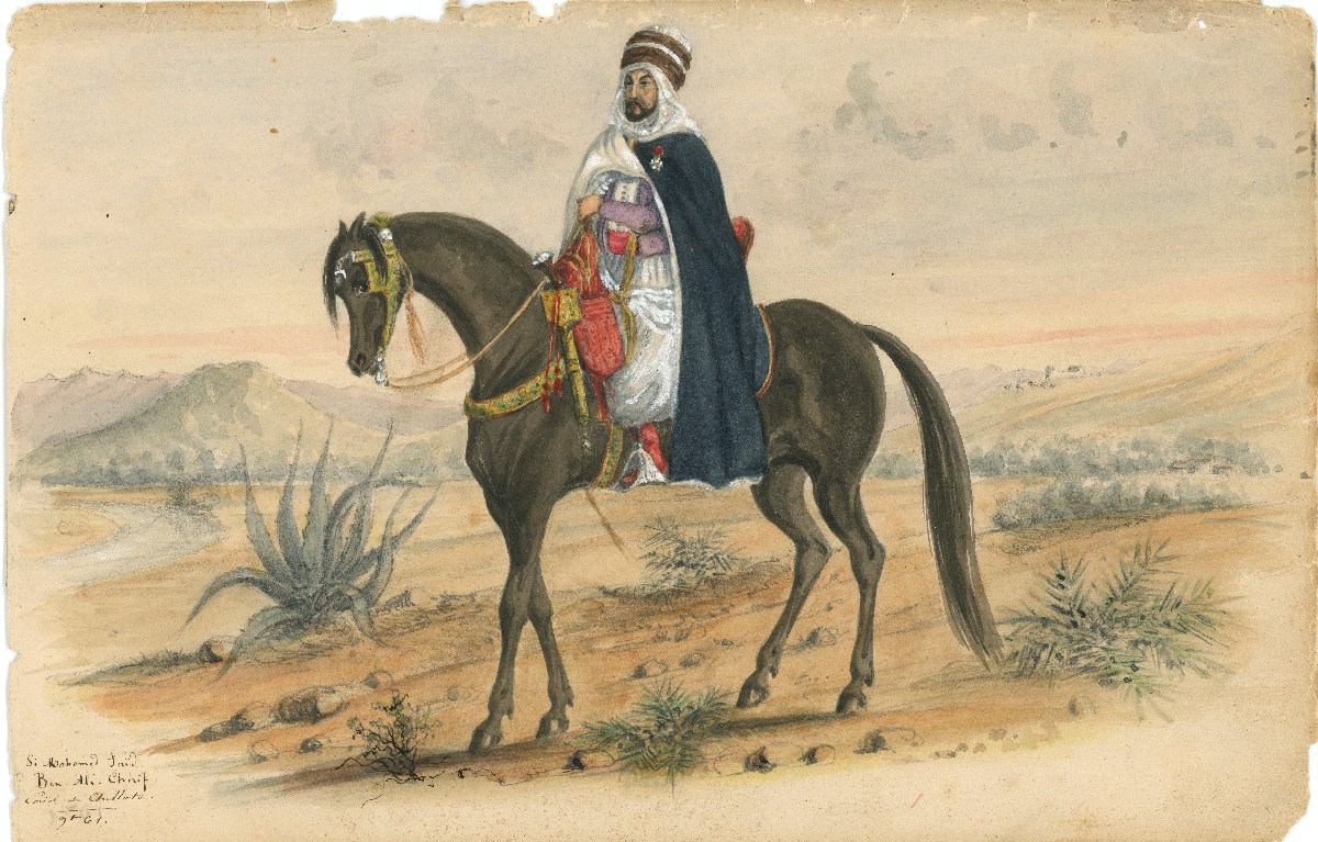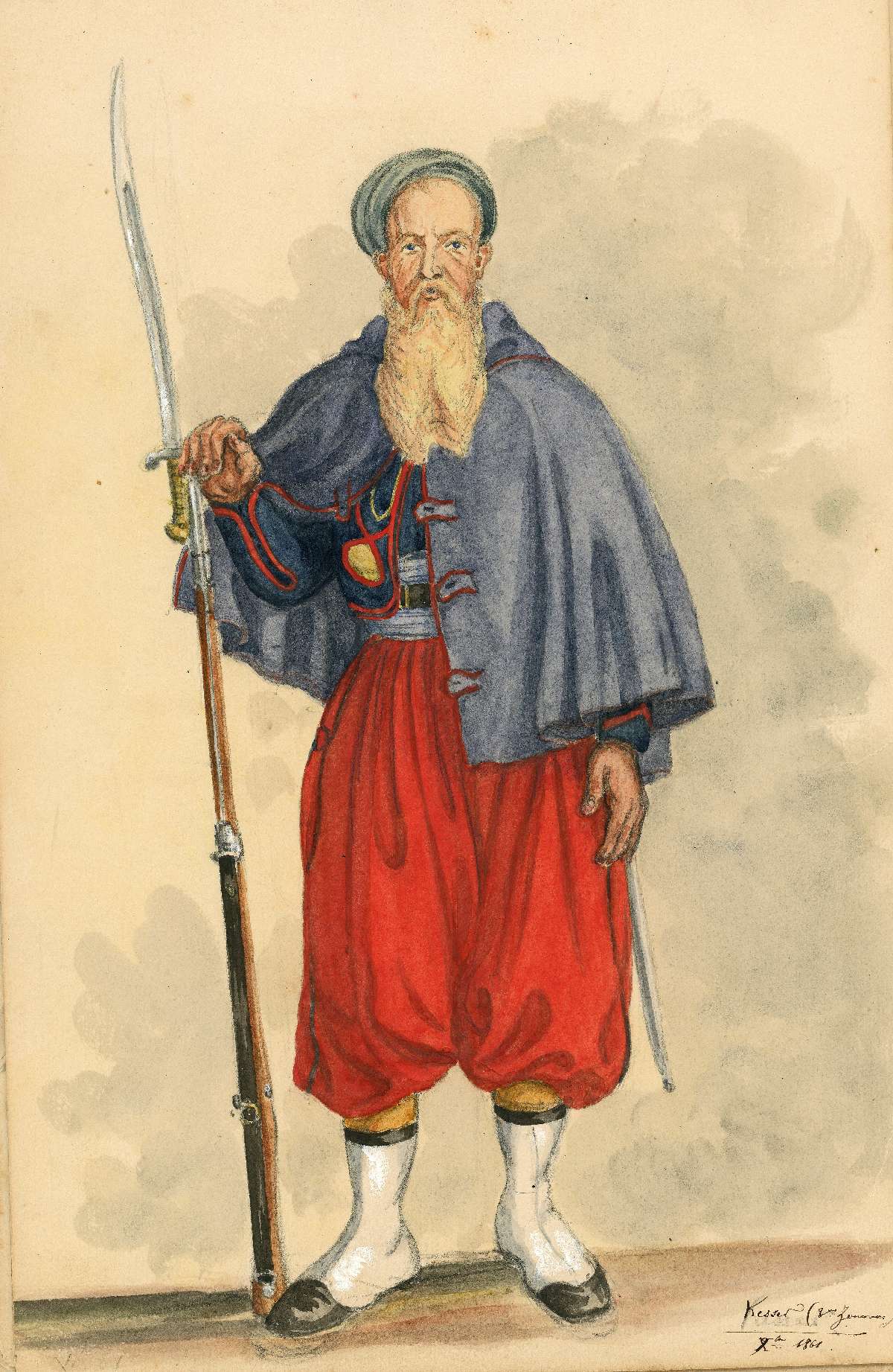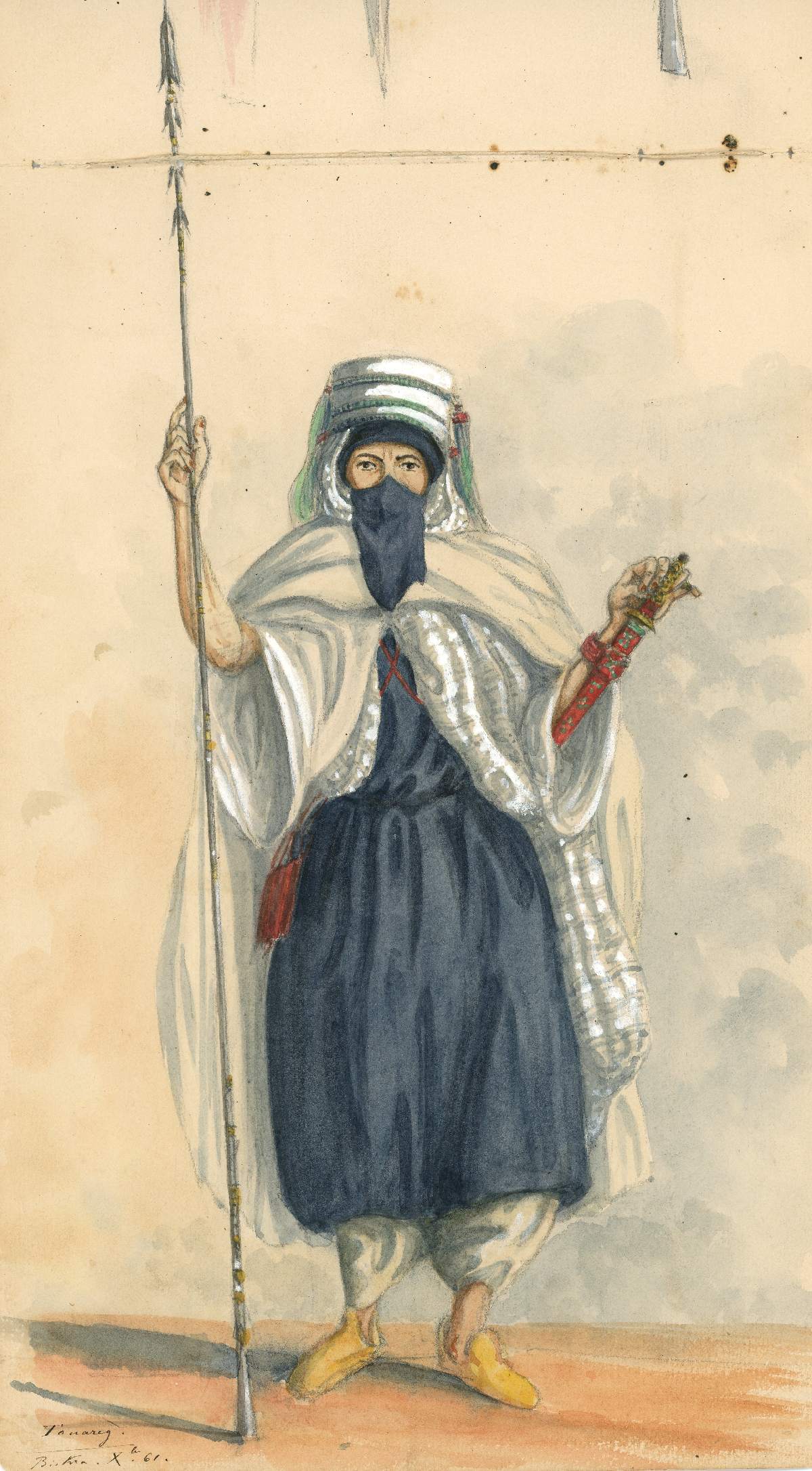 Album souvenir et personnel de l'officier stagiaire Guioth, en garnison en Kabylie de 1861 à 1866, ayant croqué des compagnons d'armes, des chefs de tribus, des autochtones, etc: " Si Mohamed Saïd Ben Ali Chérif, caïd de Chellata " portant la légion d'honneur ; " Mohamed Ben Sidi Moussa, touareg du pays des Anchef, à 6 jours de marche du Soudan " ; " Douaddi Ben Keskes [Mohamed Ben Douadi Ben Keskes] Kaïd des Amer Guebala " portant la légion d'honneur, à Guidjel ; " Bou Zen " ; Kesser (3e zouaves) ; " Général Nesmes Desmaret et Capitaine Guioth " ; " Chougui " et " Bel Kassem " ; " Boulanger " [zouave] ; " Le Mahari " à Biskra ; " Le cawadji " [le cafetier] ; " Touareg " ; " Lahldja " ; " Les Danseuses " à El Kantara ; " Oumouxreis et Messaouda, Ouled Naylas " [tribu des Ouled Naïls] à Biskra ; " Moissonneur Kabyle " ; " Embuscade Kabyle " ; " Mohammed Bel Habchi, 3e tirailleurs " à Sétif ; " Au pâturage " ; " El Aroussa " ; " Retour du Mouchi " ; " Le dépiquage du grain " ; " Marché de Sétif " ; " Danses d'Oualed Naïls " ; Baie de Stora et Rade de Philippeville ; etc.