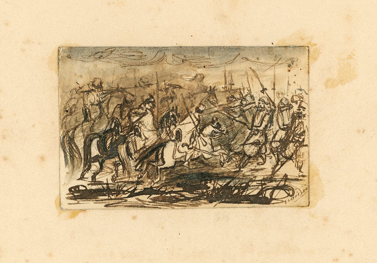 [Kabylie, 1861-1862] Album à l'italienne, 17 x 26 cm, contenant 37 croquis au crayon et à la plume, certains rehaussés à l'aquarelle et pastel, légendés et datés, réalisés en 1861 et 1862 par Pierre Florentin Louis GUIOTH (1834-1899), officier stagiaire au 8e régiment de chasseurs.