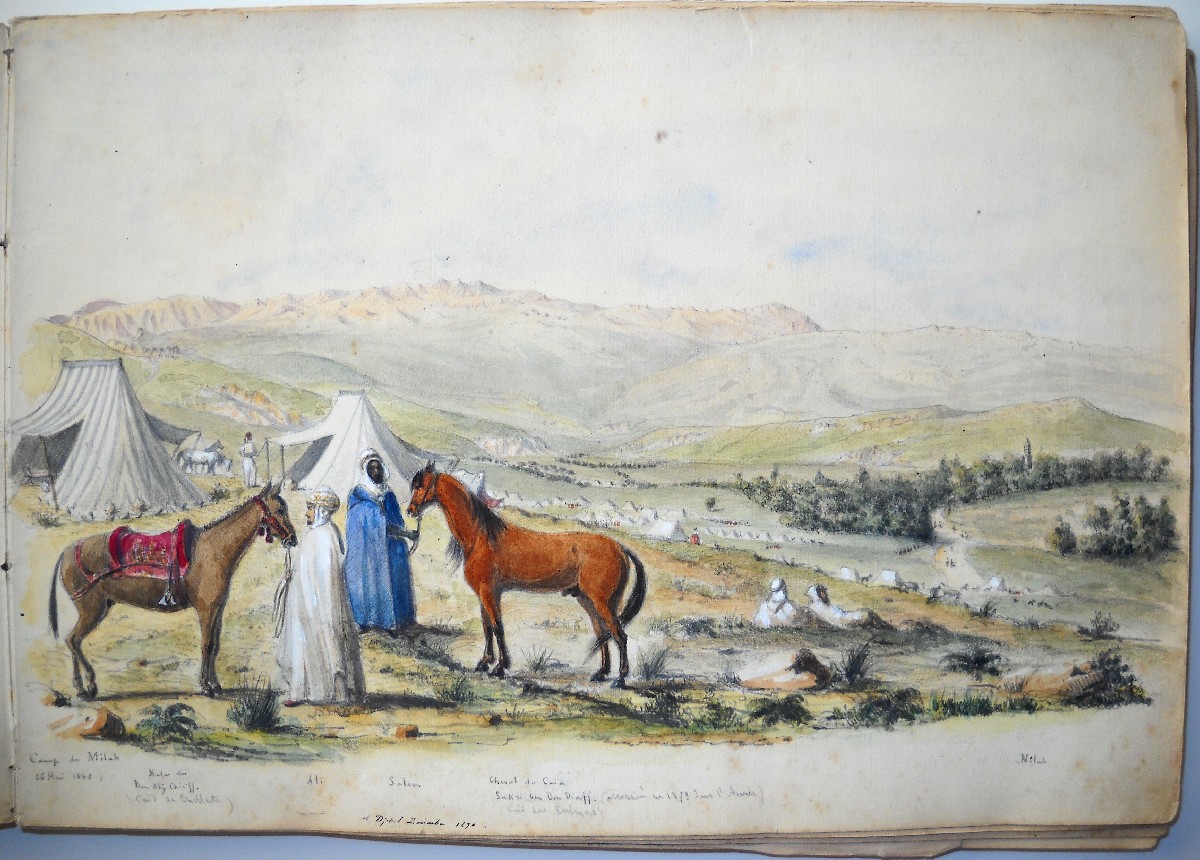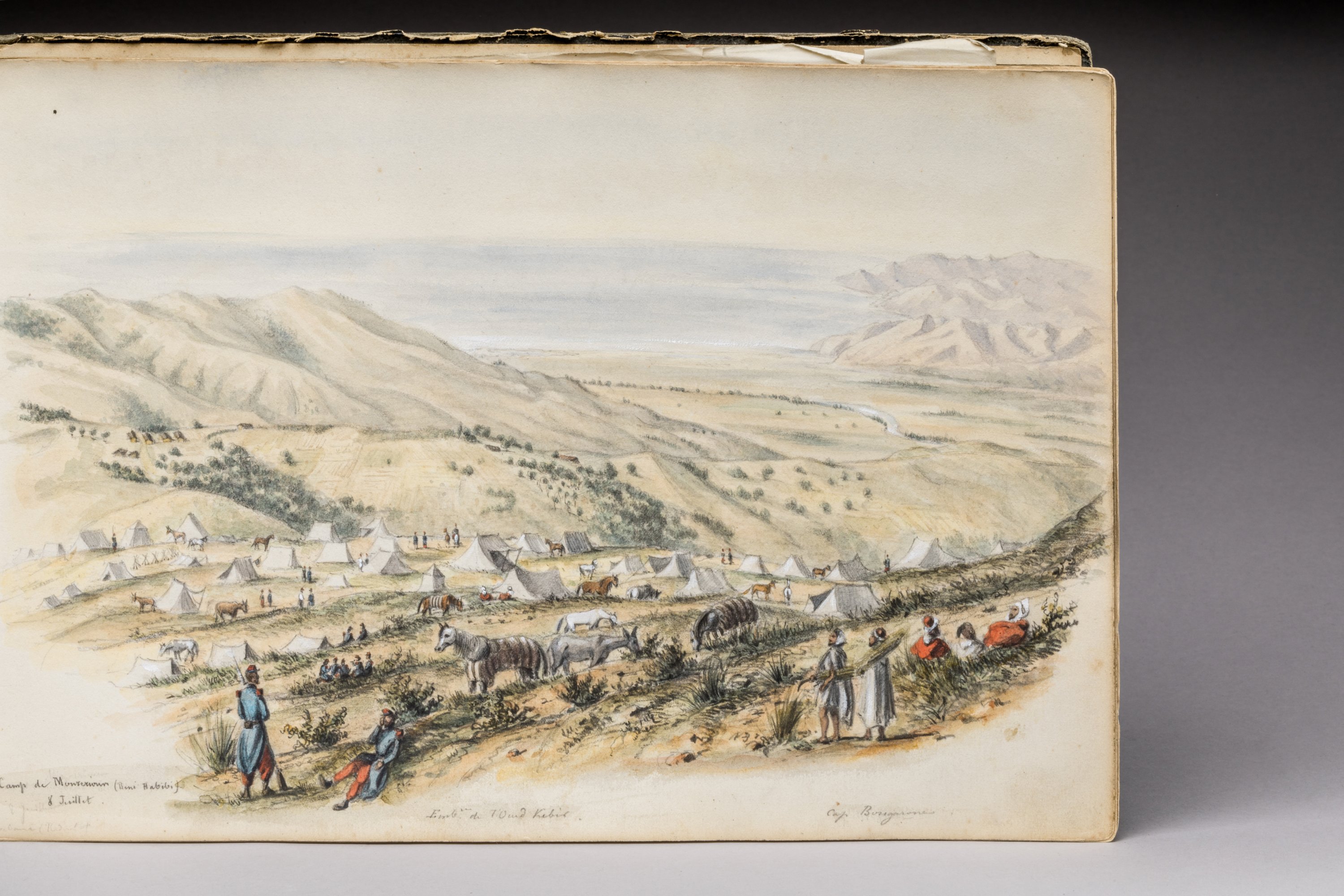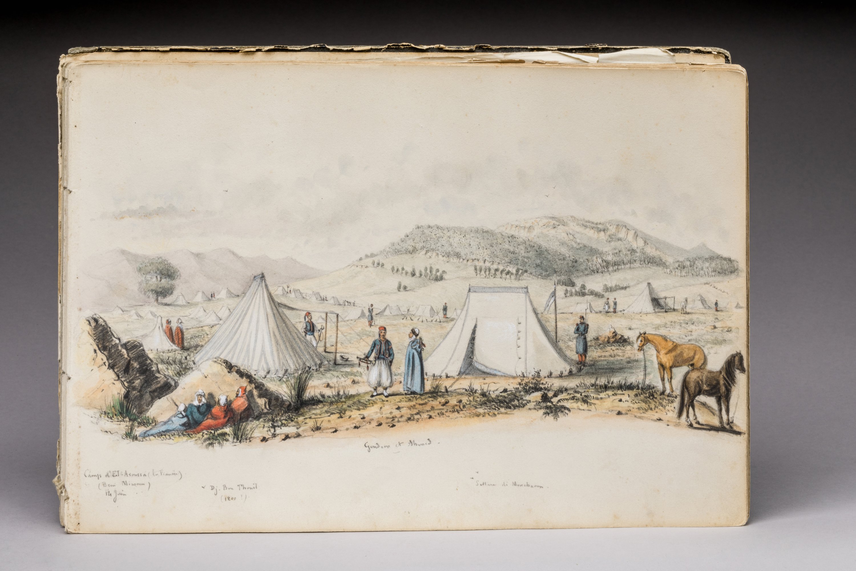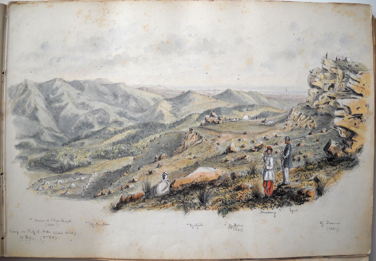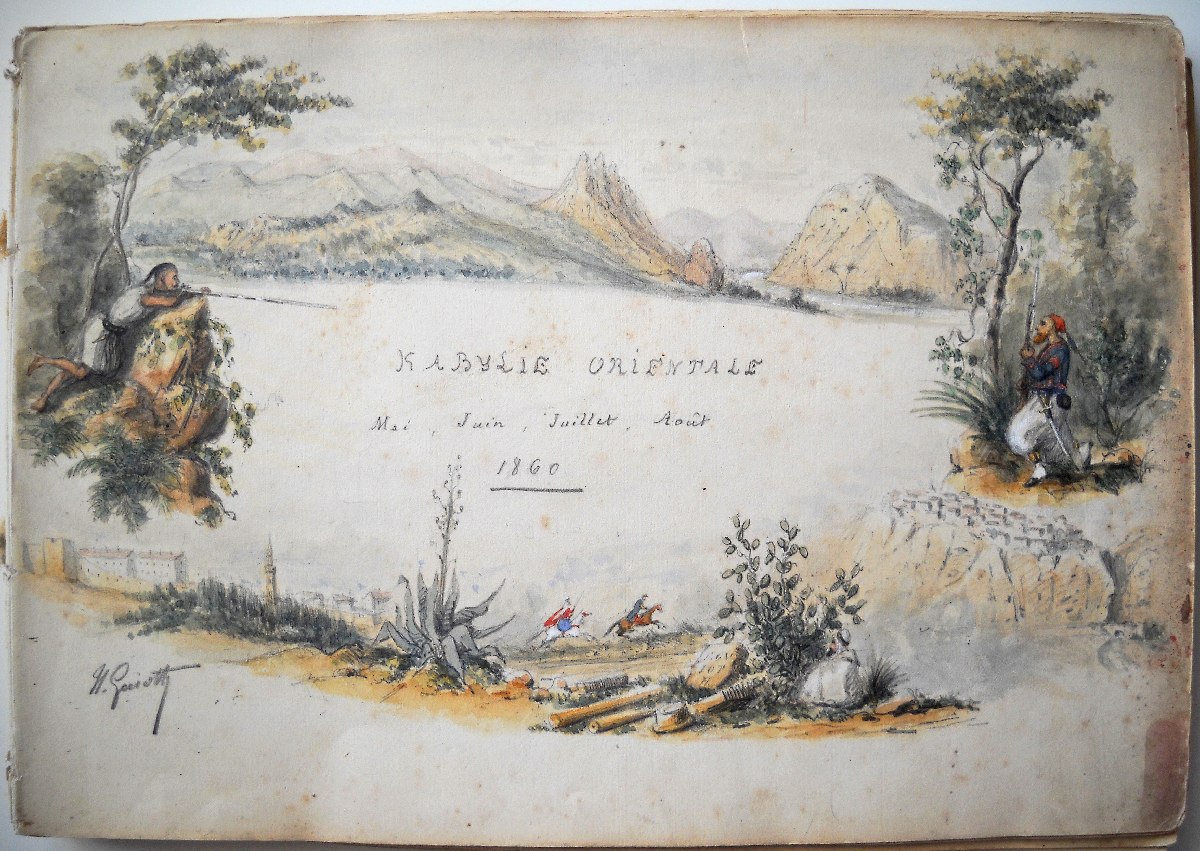Rare album souvenir et personnel de l'officier stagiaire Guioth, qui a crayonné lors de l'expédition en Kabylie orientale, les paysages, les bivouacs et quelques les scènes de combat, les chefs de tribus: camps de Milah, de l'Oued Endjah, du Fedj-Baïnem (Zouarka), d'El Aroussa (la Fiancée), de Taffertast, de Mharga (le Brûlé), d'El Arsa (le Cirque), de Mourerioun (Beni Habibi), du Borj Tahar, de Fedj el Arba, d'Hourta di Sedma (Beni Toufout), d'Amdjid'j (Beni Ftah), d'El Betha, de Neïma prisonniers Beni Tifout ; passages de l'Oued Mechta, de l'Oued Aziat, Ouled Aïcha, de l'Oued Kebir ; grotte des Arb Mta Skift ; Fedj el Arba (Ben Ali Chérif, Sakri Ben Bou Diaf, Sala Ben Tahaï) ; enlèvement du Bou-Thouil, cantonnement des crêtes ; incendie des villages des Beni Ider ; contingents Kabyles ; fête du 15 août à El Milia ; Milah ; Sétif, marché arabe ; Constantine ; chute du Rummel ; Bougie ; Ruines de Tubusuptus ; chasse au sanglier ; Danseuses à Akbou avec Ben Ali Cherif ; etc.