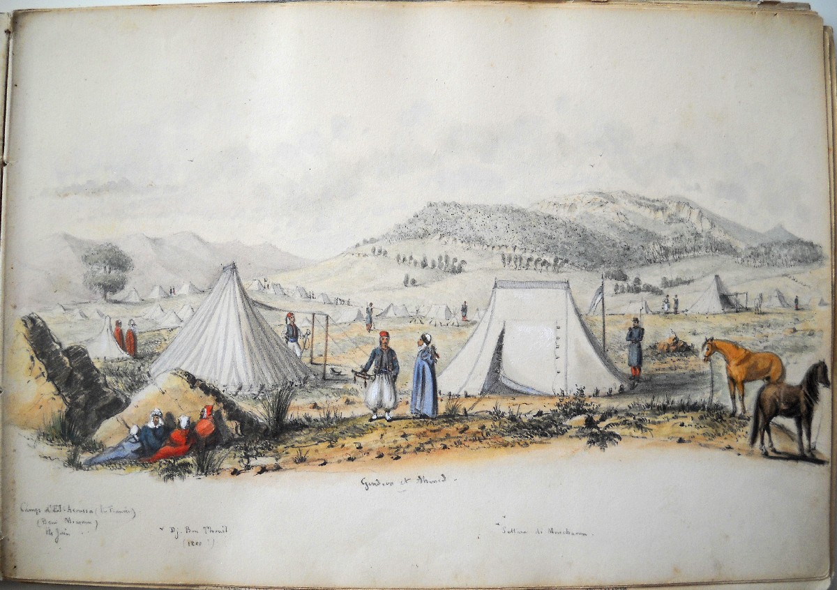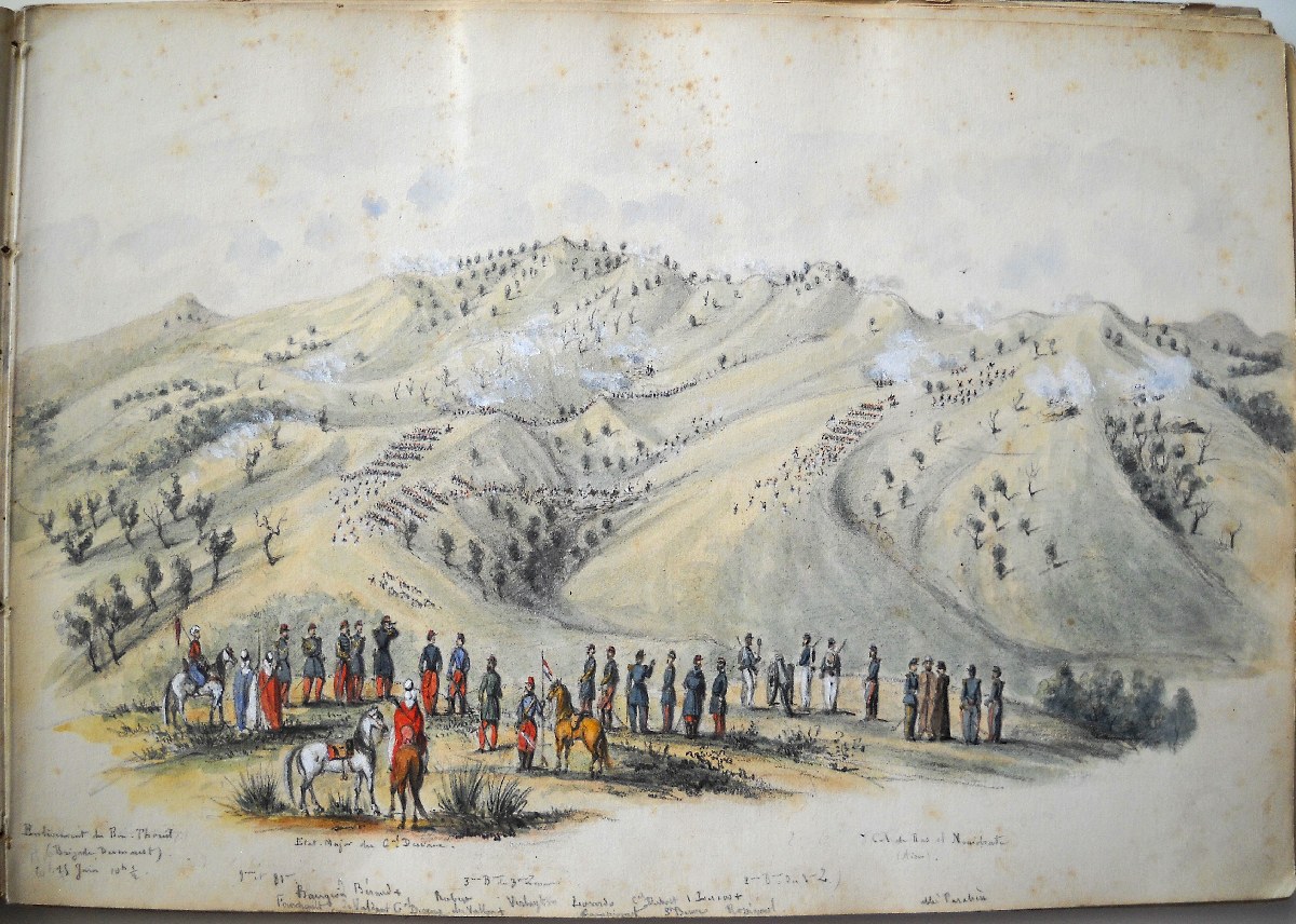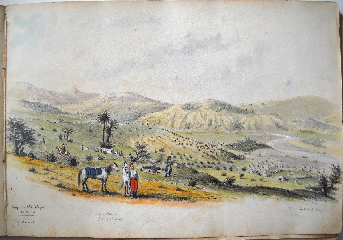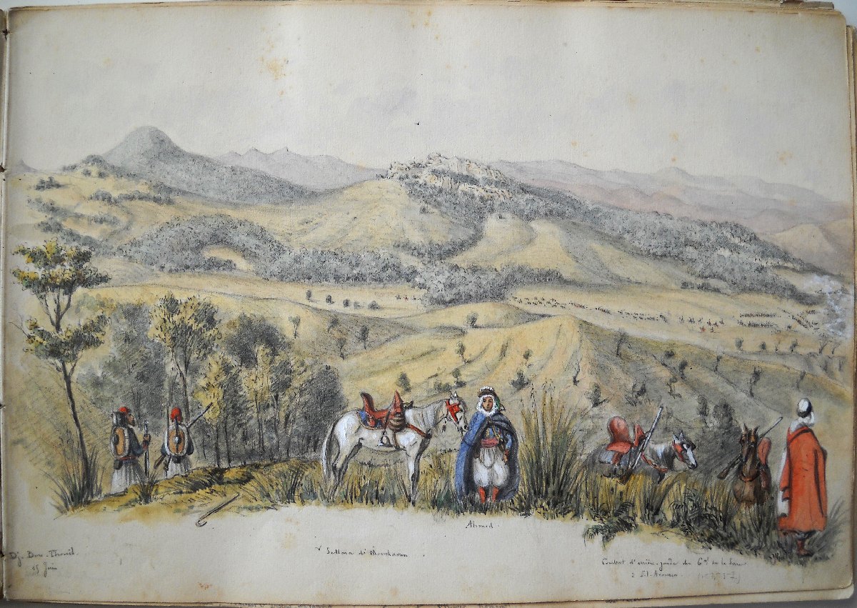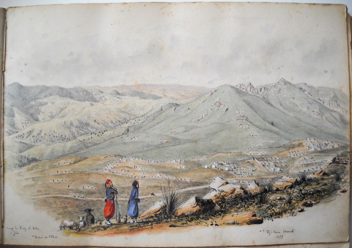 Rare album souvenir et personnel de l'officier stagiaire Guioth, qui a crayonné lors de l'expédition en Kabylie orientale, les paysages, les bivouacs et quelques les scènes de combat, les chefs de tribus: camps de Milah, de l'Oued Endjah, du Fedj-Baïnem (Zouarka), d'El Aroussa (la Fiancée), de Taffertast, de Mharga (le Brûlé), d'El Arsa (le Cirque), de Mourerioun (Beni Habibi), du Borj Tahar, de Fedj el Arba, d'Hourta di Sedma (Beni Toufout), d'Amdjid'j (Beni Ftah), d'El Betha, de Neïma prisonniers Beni Tifout ; passages de l'Oued Mechta, de l'Oued Aziat, Ouled Aïcha, de l'Oued Kebir ; grotte des Arb Mta Skift ; Fedj el Arba (Ben Ali Chérif, Sakri Ben Bou Diaf, Sala Ben Tahaï) ; enlèvement du Bou-Thouil, cantonnement des crêtes ; incendie des villages des Beni Ider ; contingents Kabyles ; fête du 15 août à El Milia ; Milah ; Sétif, marché arabe ; Constantine ; chute du Rummel ; Bougie ; Ruines de Tubusuptus ; chasse au sanglier ; Danseuses à Akbou avec Ben Ali Cherif ; etc.