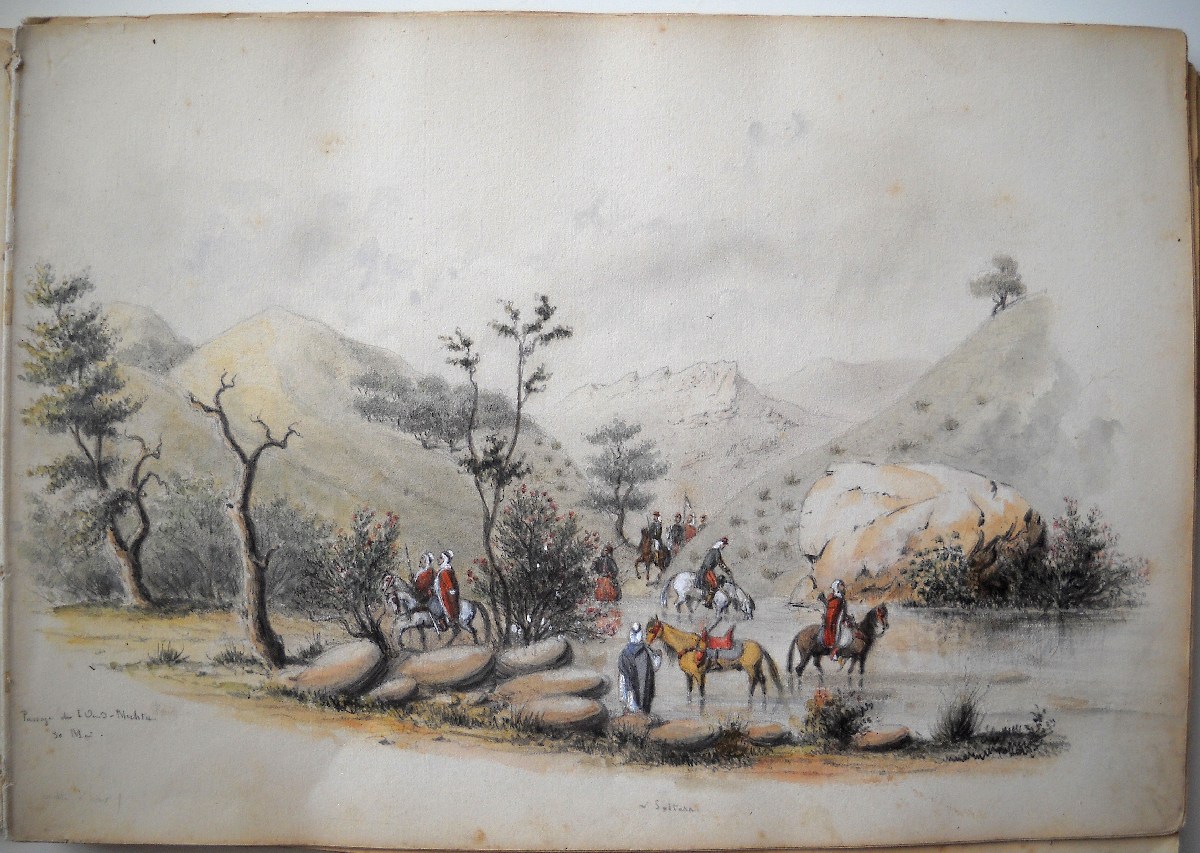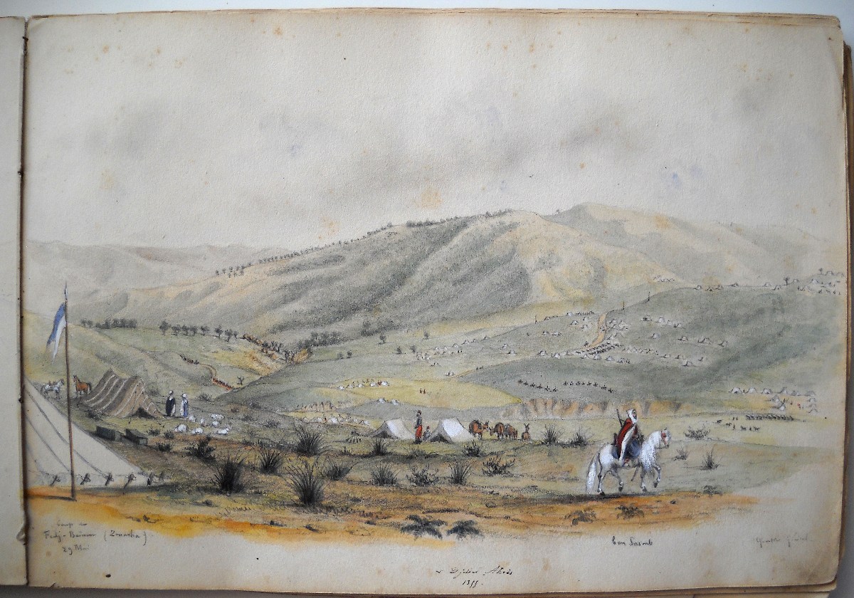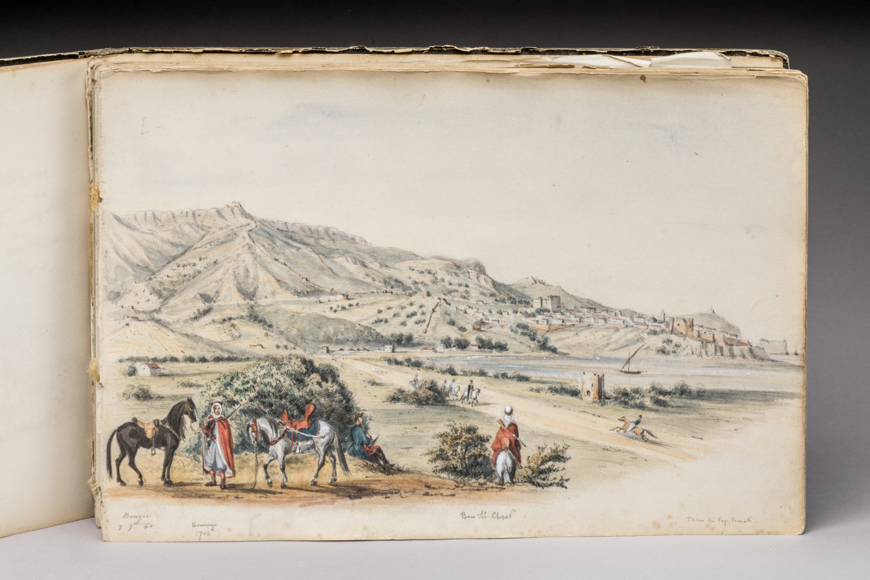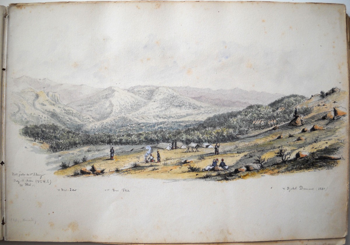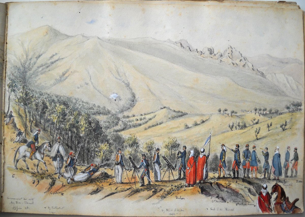 Rare album souvenir et personnel de l'officier stagiaire Guioth, qui a crayonné lors de l'expédition en Kabylie orientale, les paysages, les bivouacs et quelques les scènes de combat, les chefs de tribus: camps de Milah, de l'Oued Endjah, du Fedj-Baïnem (Zouarka), d'El Aroussa (la Fiancée), de Taffertast, de Mharga (le Brûlé), d'El Arsa (le Cirque), de Mourerioun (Beni Habibi), du Borj Tahar, de Fedj el Arba, d'Hourta di Sedma (Beni Toufout), d'Amdjid'j (Beni Ftah), d'El Betha, de Neïma prisonniers Beni Tifout ; passages de l'Oued Mechta, de l'Oued Aziat, Ouled Aïcha, de l'Oued Kebir ; grotte des Arb Mta Skift ; Fedj el Arba (Ben Ali Chérif, Sakri Ben Bou Diaf, Sala Ben Tahaï) ; enlèvement du Bou-Thouil, cantonnement des crêtes ; incendie des villages des Beni Ider ; contingents Kabyles ; fête du 15 août à El Milia ; Milah ; Sétif, marché arabe ; Constantine ; chute du Rummel ; Bougie ; Ruines de Tubusuptus ; chasse au sanglier ; Danseuses à Akbou avec Ben Ali Cherif ; etc.