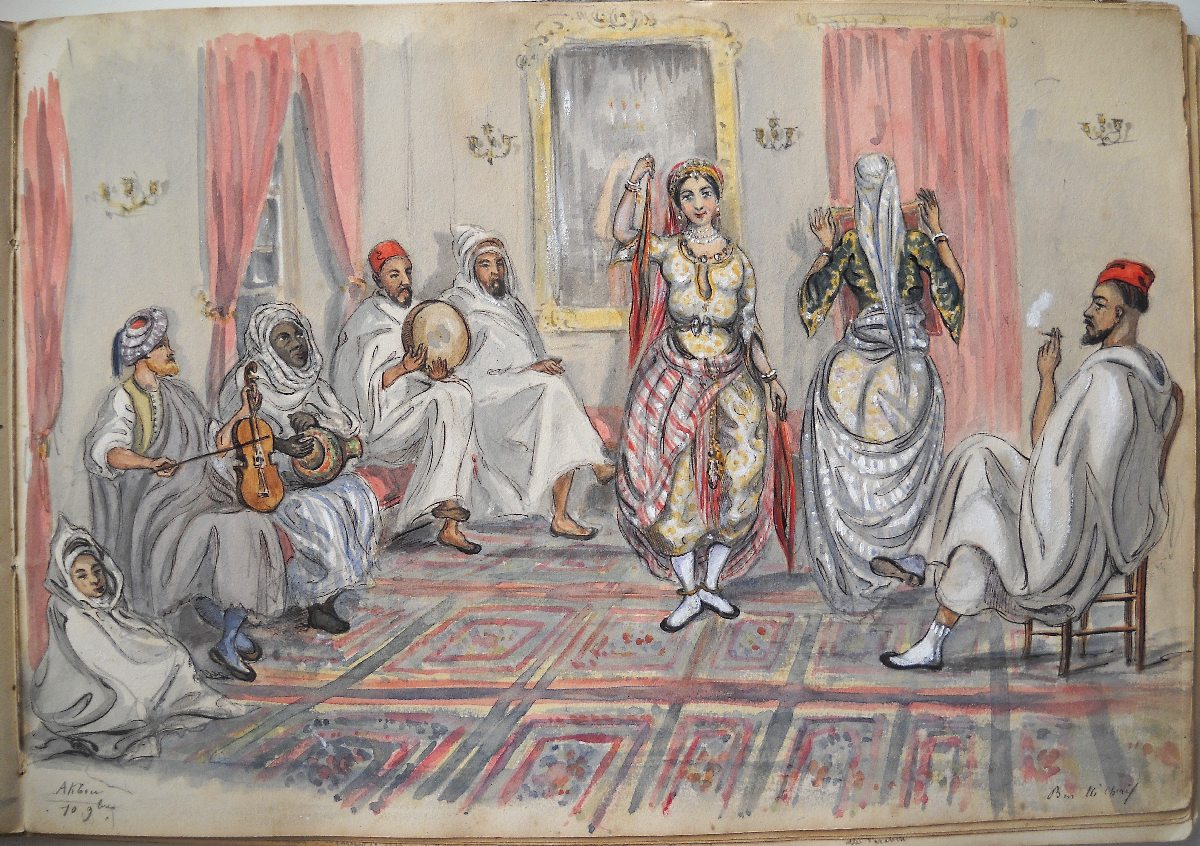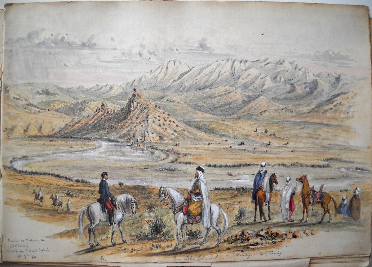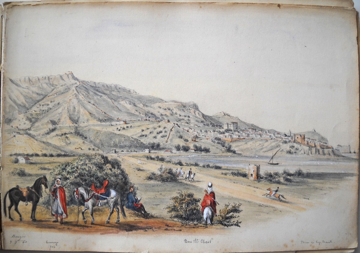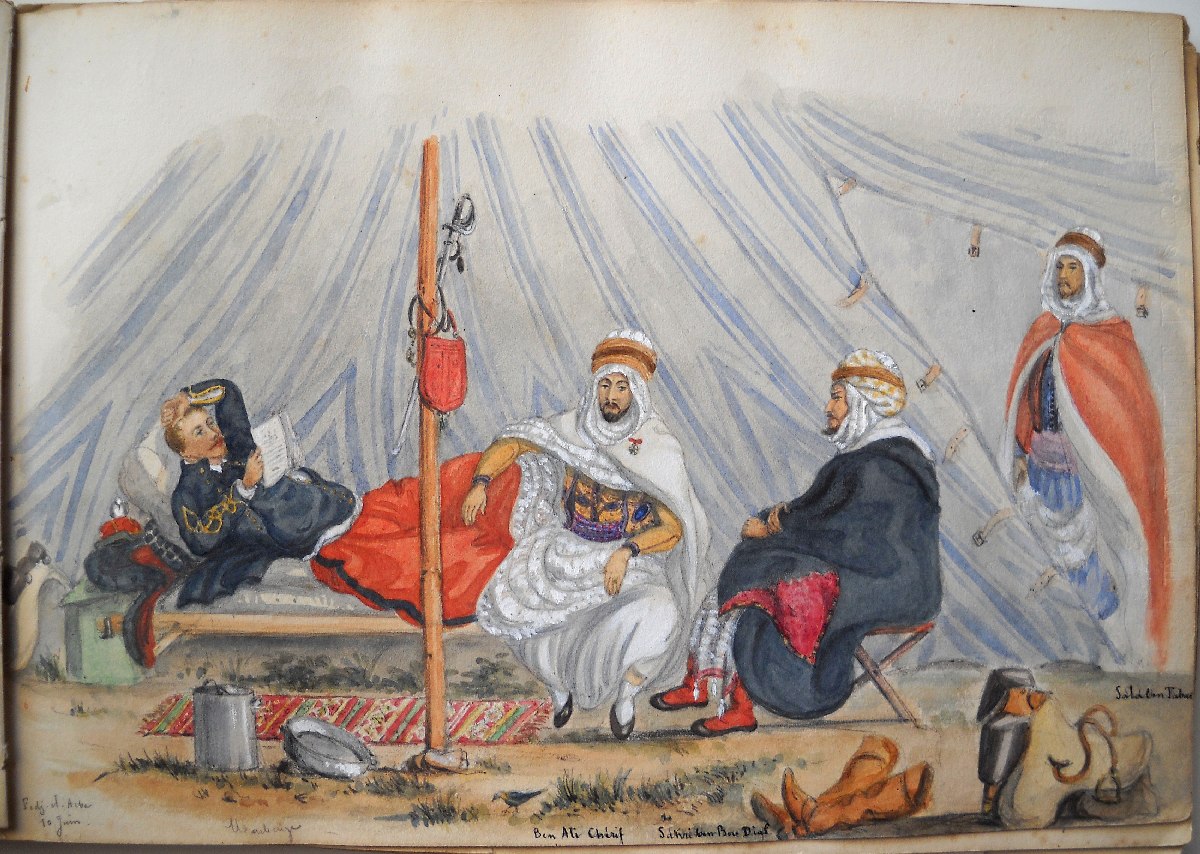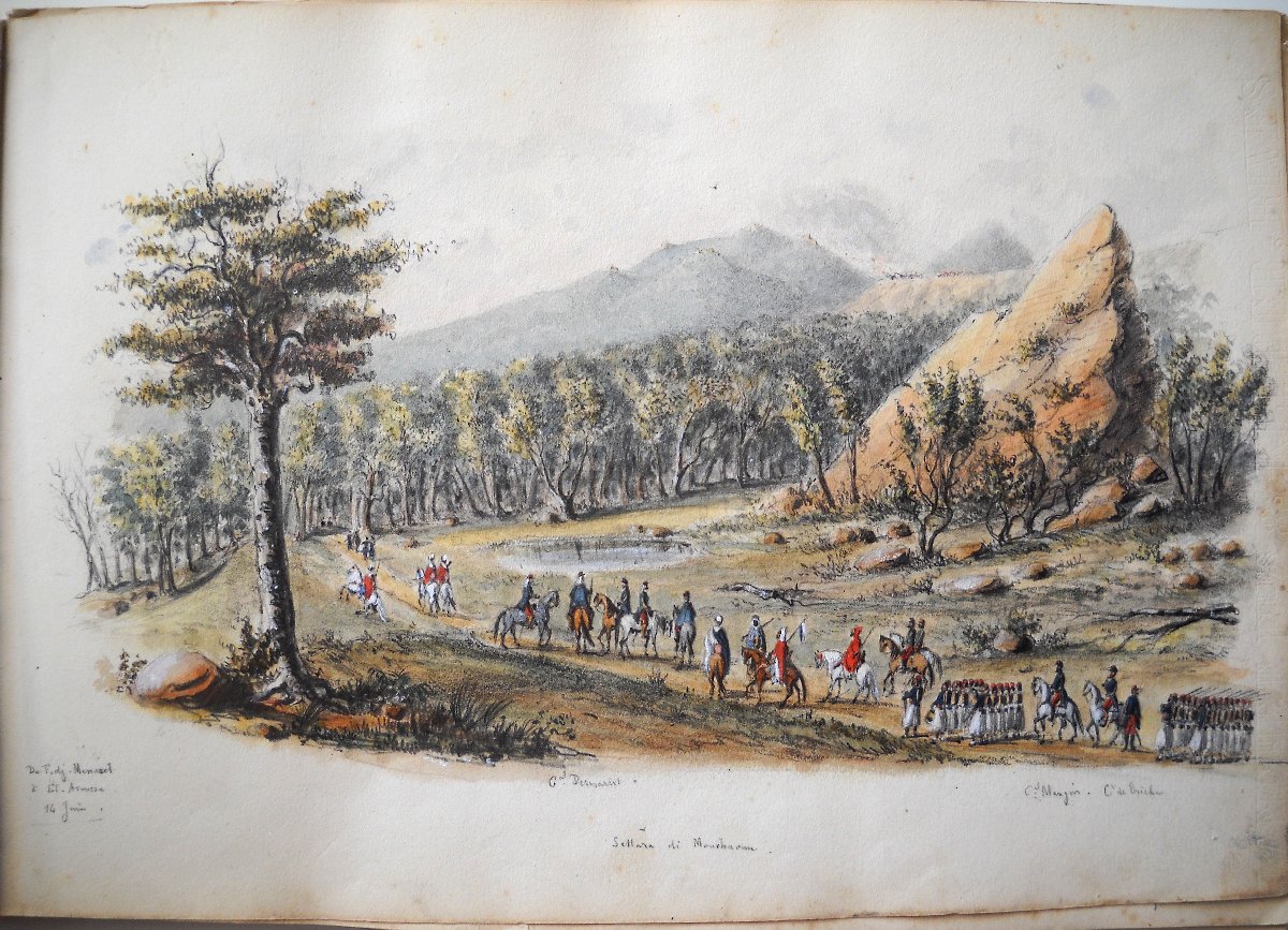 Rare album souvenir et personnel de l'officier stagiaire Guioth, qui a crayonné lors de l'expédition en Kabylie orientale, les paysages, les bivouacs et quelques les scènes de combat, les chefs de tribus: camps de Milah, de l'Oued Endjah, du Fedj-Baïnem (Zouarka), d'El Aroussa (la Fiancée), de Taffertast, de Mharga (le Brûlé), d'El Arsa (le Cirque), de Mourerioun (Beni Habibi), du Borj Tahar, de Fedj el Arba, d'Hourta di Sedma (Beni Toufout), d'Amdjid'j (Beni Ftah), d'El Betha, de Neïma prisonniers Beni Tifout ; passages de l'Oued Mechta, de l'Oued Aziat, Ouled Aïcha, de l'Oued Kebir ; grotte des Arb Mta Skift ; Fedj el Arba (Ben Ali Chérif, Sakri Ben Bou Diaf, Sala Ben Tahaï) ; enlèvement du Bou-Thouil, cantonnement des crêtes ; incendie des villages des Beni Ider ; contingents Kabyles ; fête du 15 août à El Milia ; Milah ; Sétif, marché arabe ; Constantine ; chute du Rummel ; Bougie ; Ruines de Tubusuptus ; chasse au sanglier ; Danseuses à Akbou avec Ben Ali Cherif ; etc.