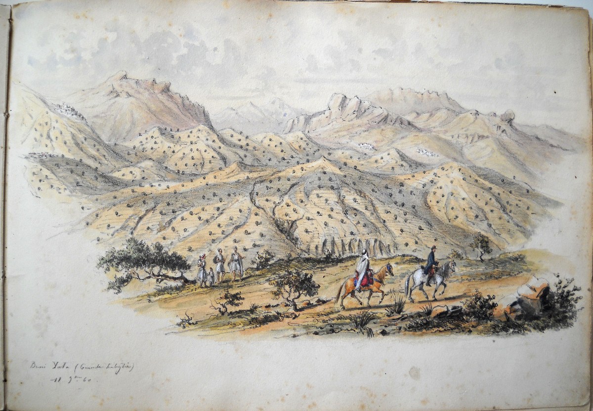 [Campagne de Kabylie, 1860] Album à l'italienne, 22 x 31 cm, contenant 52 croquis au crayon et à la plume, certains rehaussés à l'aquarelle et pastel, légendés et datés, réalisés de mai à novembre 1860 par Pierre Florentin Louis GUIOTH (1834-1899), officier stagiaire au 8e régiment de chasseurs.